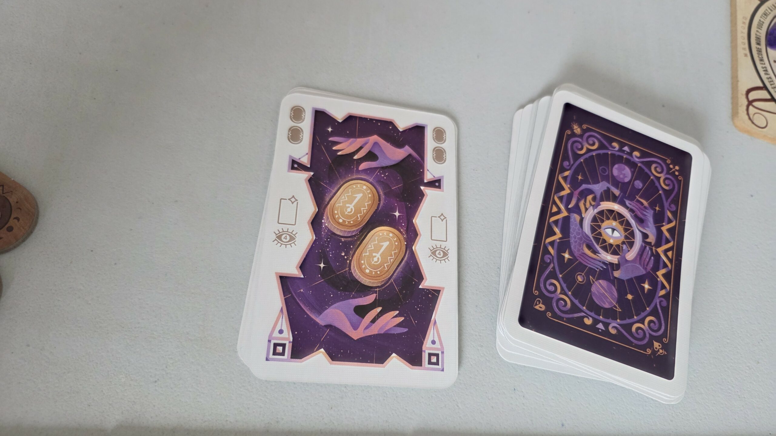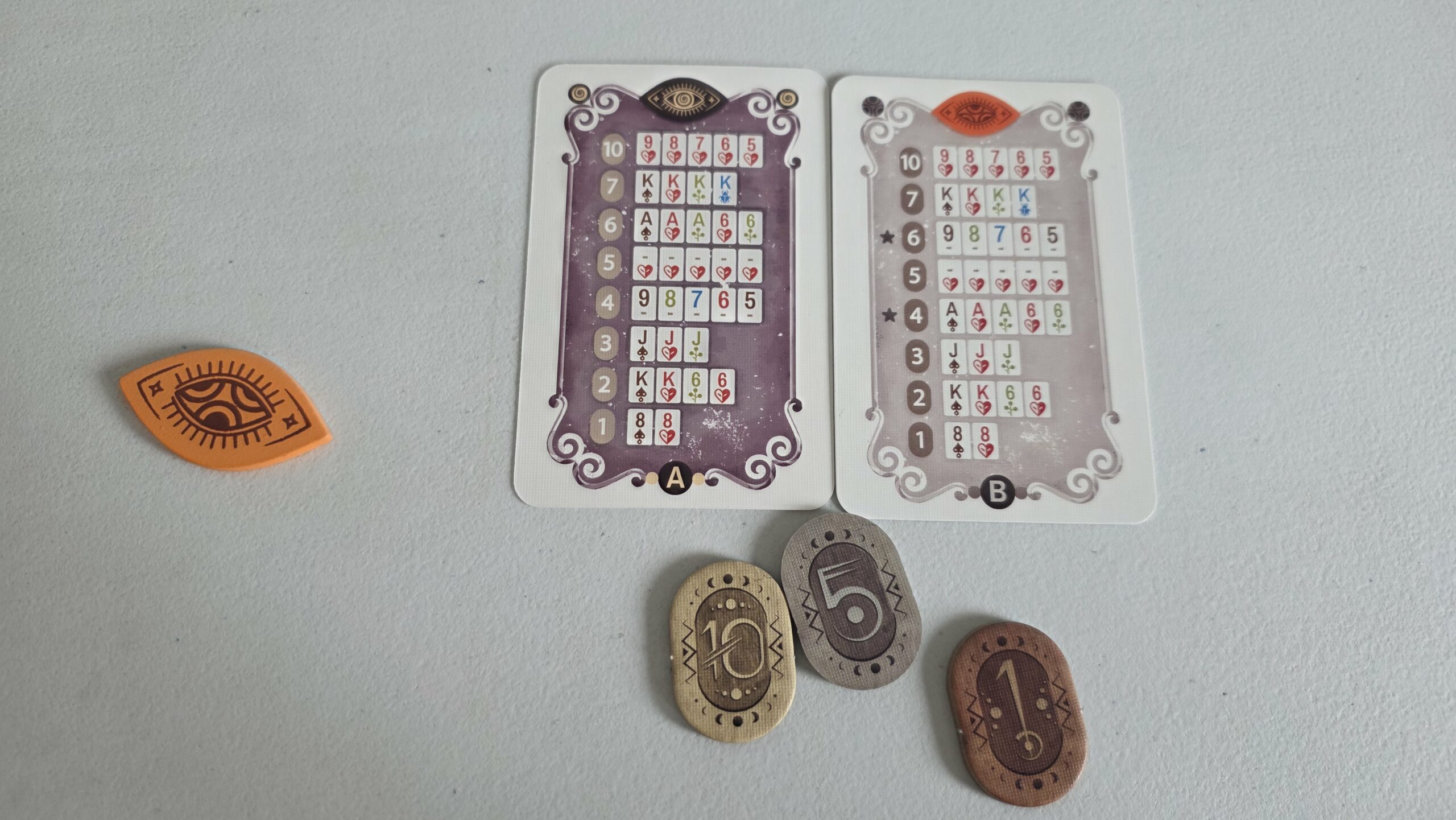 Dans la petite boîte on retrouve le deck de cartes, un jeton prédiction par joueur et les runes de points de victoire. Il y a aussi une carte de combinaisons et les points rapportés pour chaque joueur. Dans l’ensemble c’est du très bon matériel avec des jolies cartes.