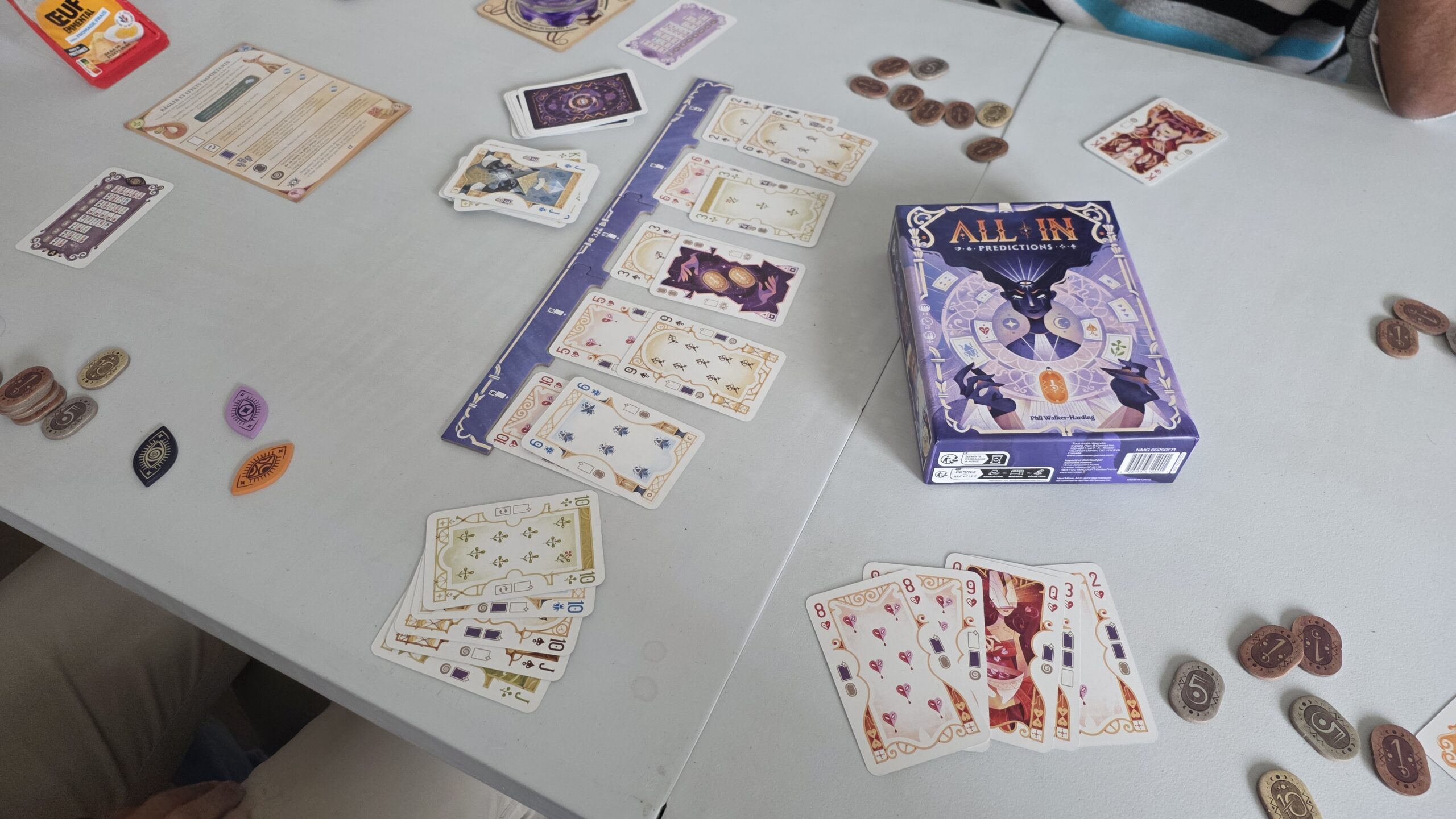 All In – Prédictions est un jeu plutôt rapide et simple d’accès. Basé sur le monde du poker, on nous propose une version plus dynamique et loufoque avec plusieurs effets de cartes. Ainsi sur chaque carte jouée vous pourrez gagner des points, piocher de nouvelles cartes du deck ou de la rivière centrale, en échanger entre la rivière et votre main ou encore demander à vos adversaires leurs combinaisons acutelles ou connaître 4 de leurs cartes.