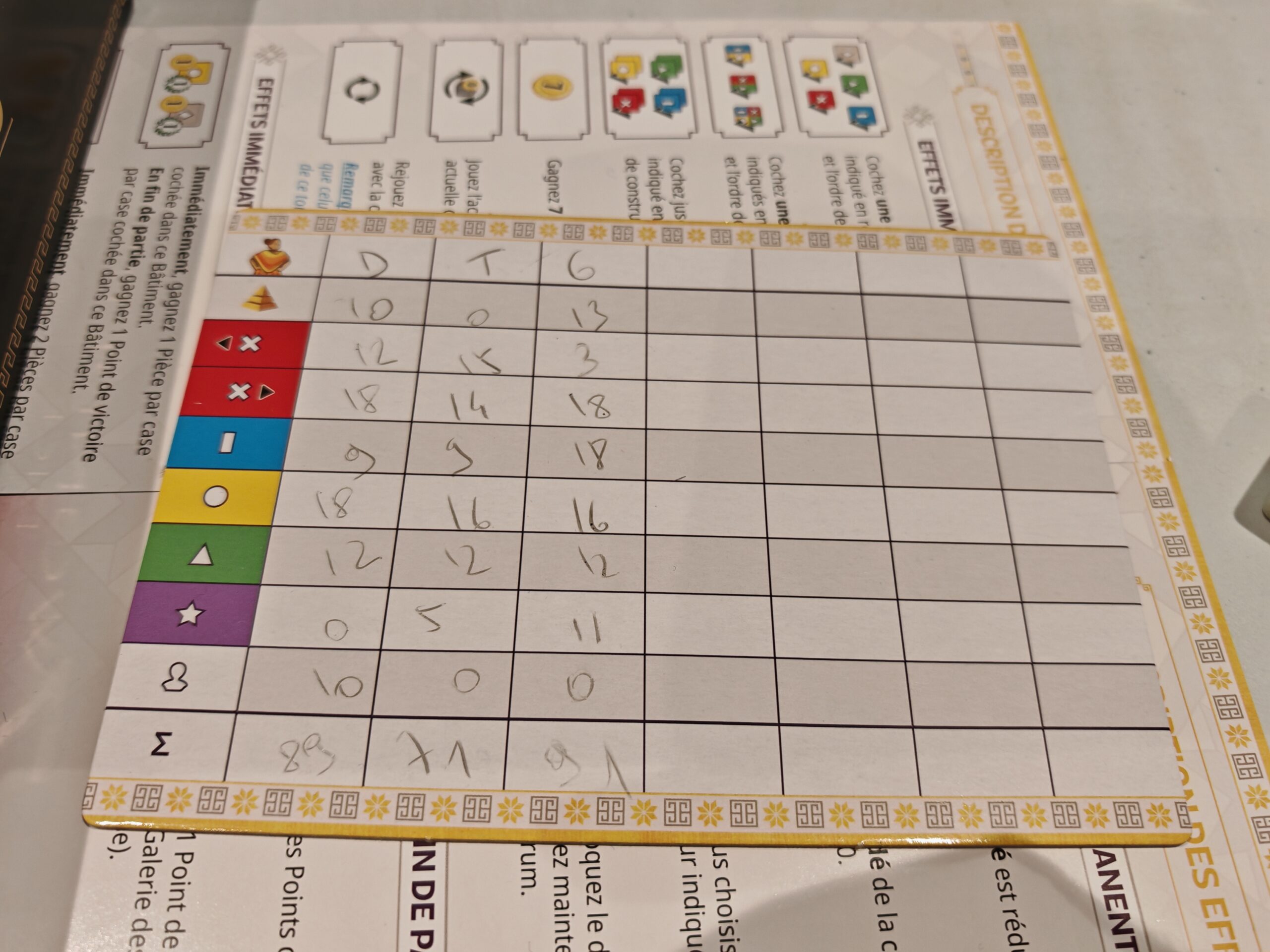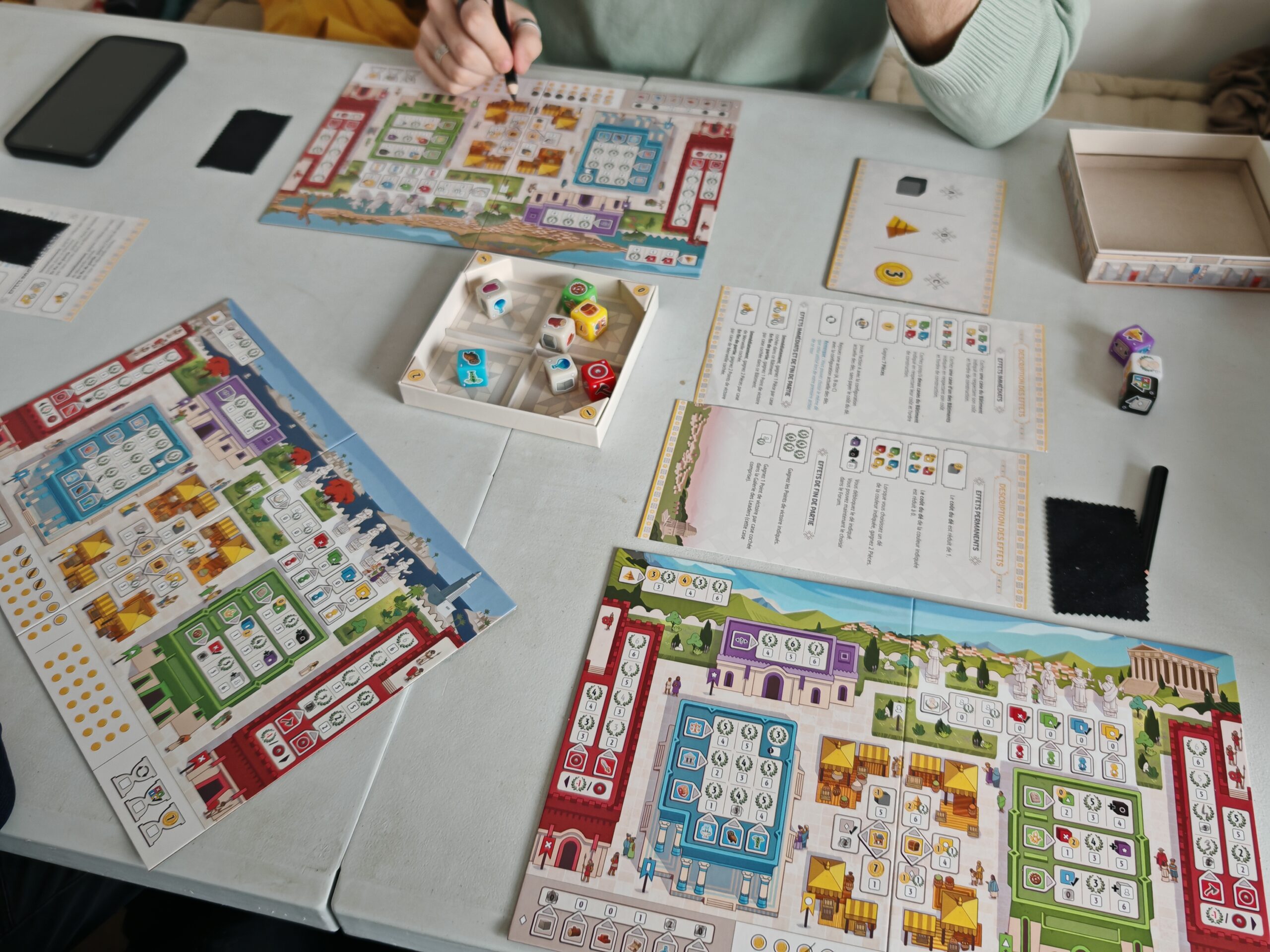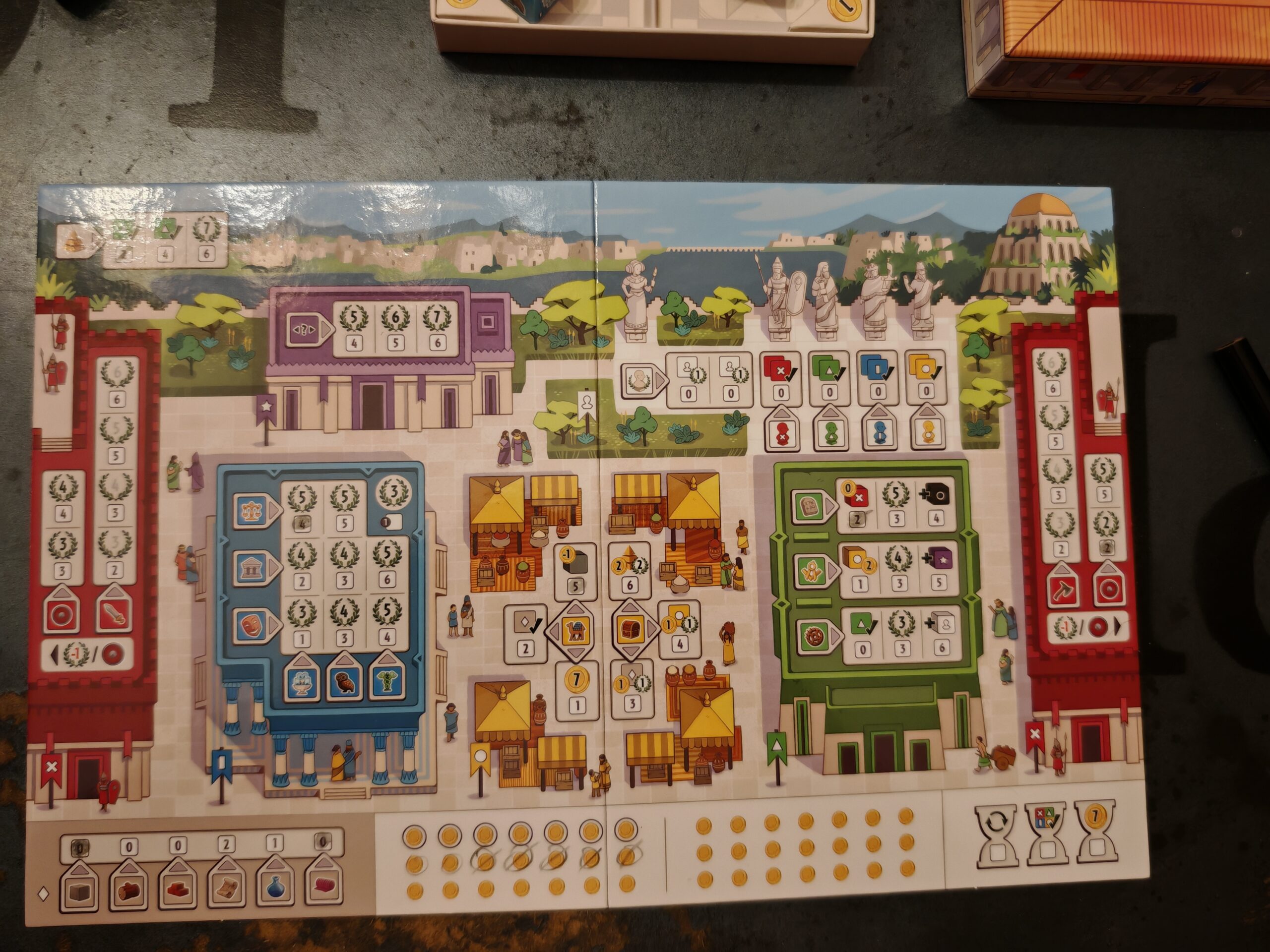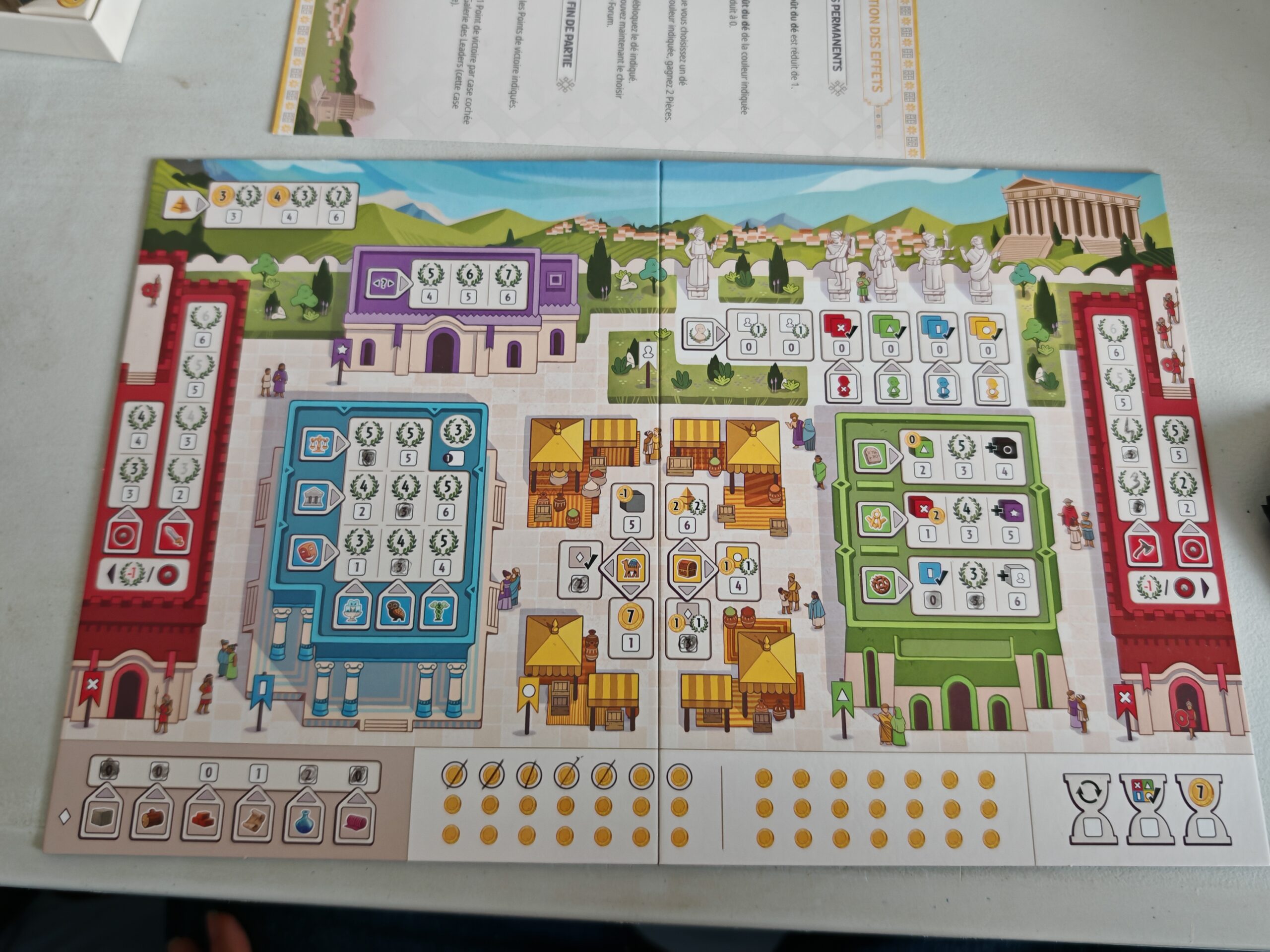 Il est important de se rappeler que c’est un jeu à points de victoire mais qui peut être “speedrun” puisque dès qu’un joueur a fini de compléter 3 bâtiments sur son plateau, la fin de partie est déclenchée.