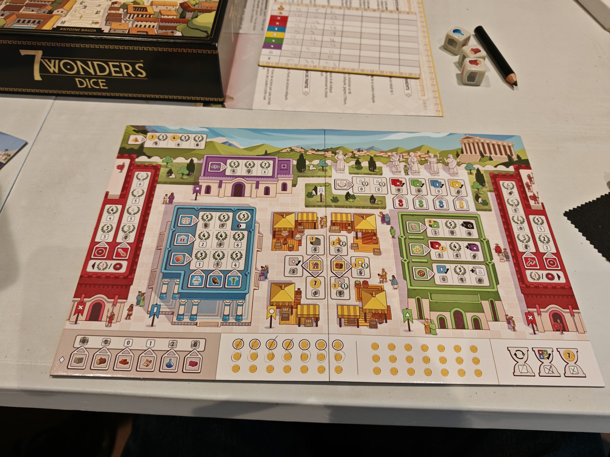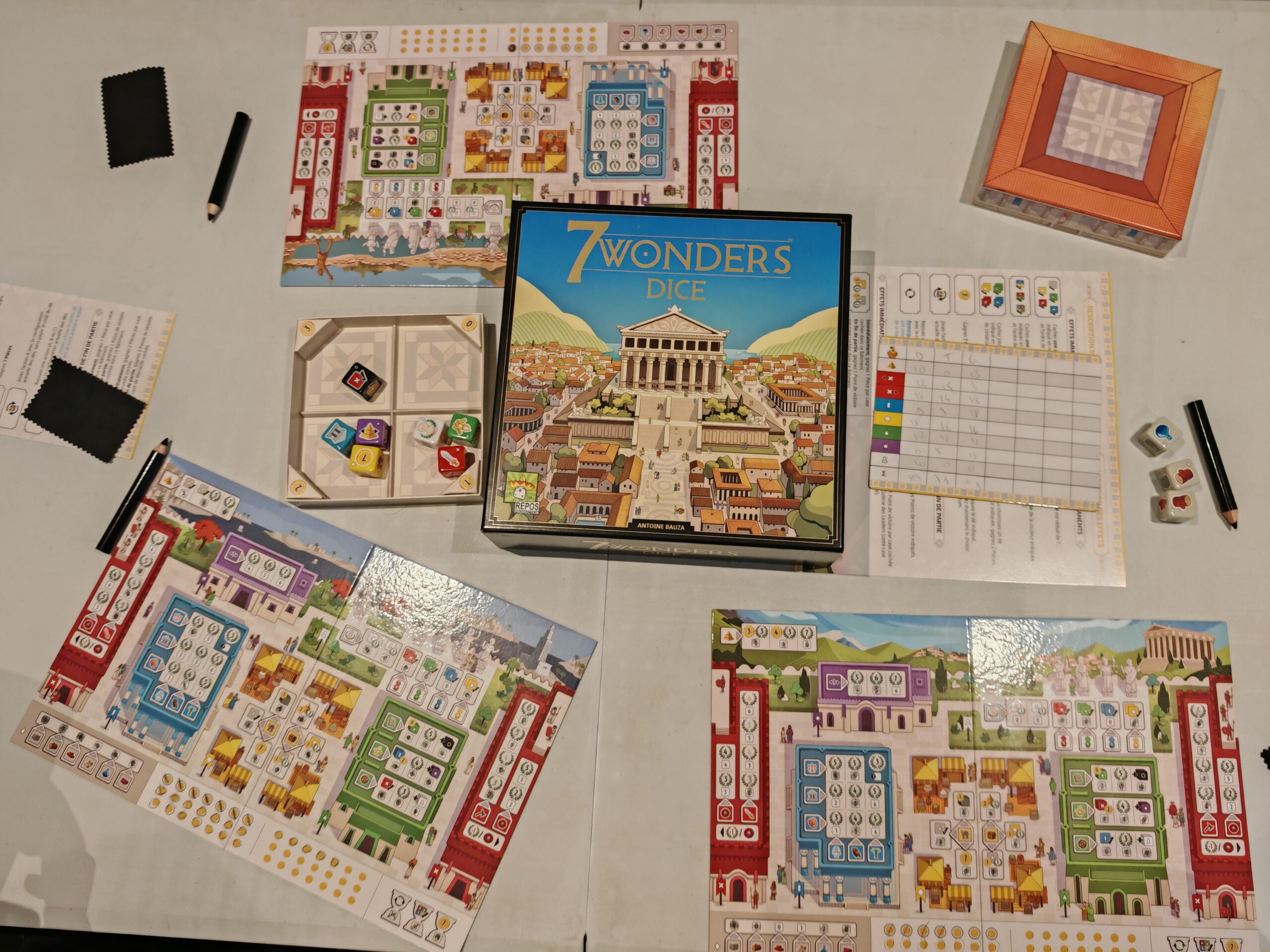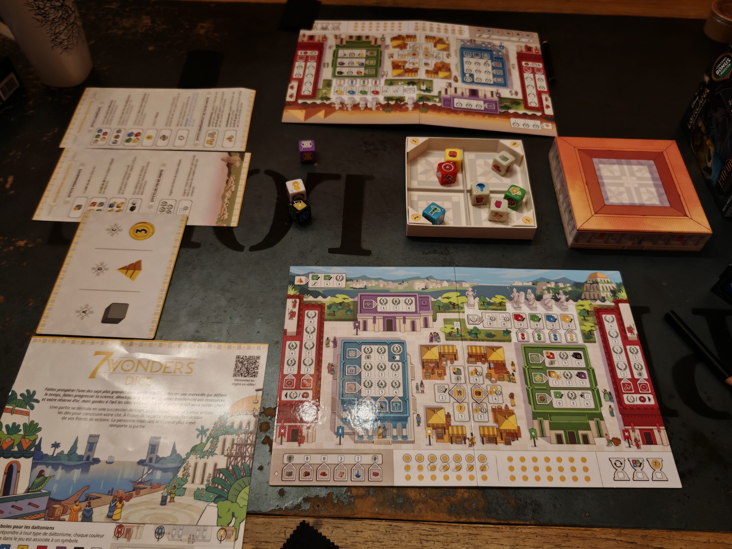 7 Wonders Dice est un jeu de type roll and write familial et basé sur le jeu mondialement connu 7 Wonders. Le roll and write permet des parties assez rapides puisque tout le monde joue en même temps. Pour jouer à 7 par contre il faut une sacré grande table donc pour ma part je suis resté sur du 2 ou 3 joueurs.