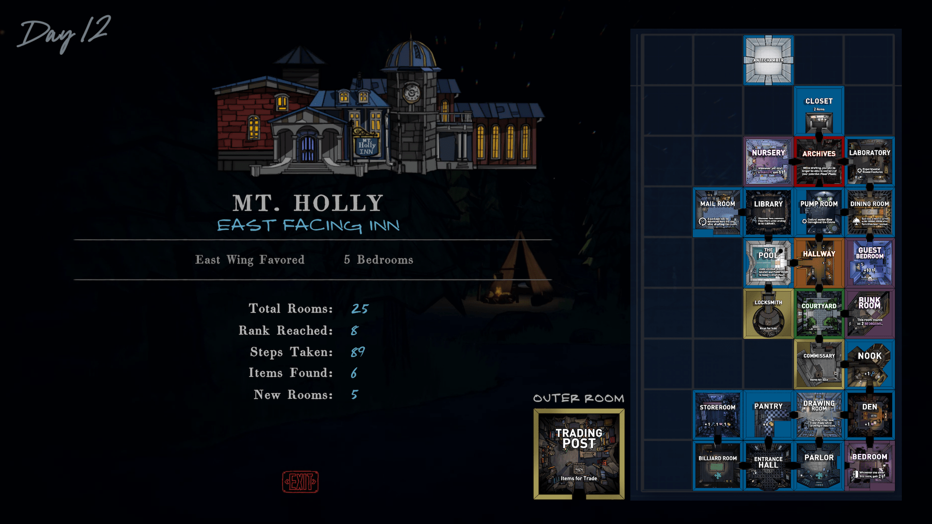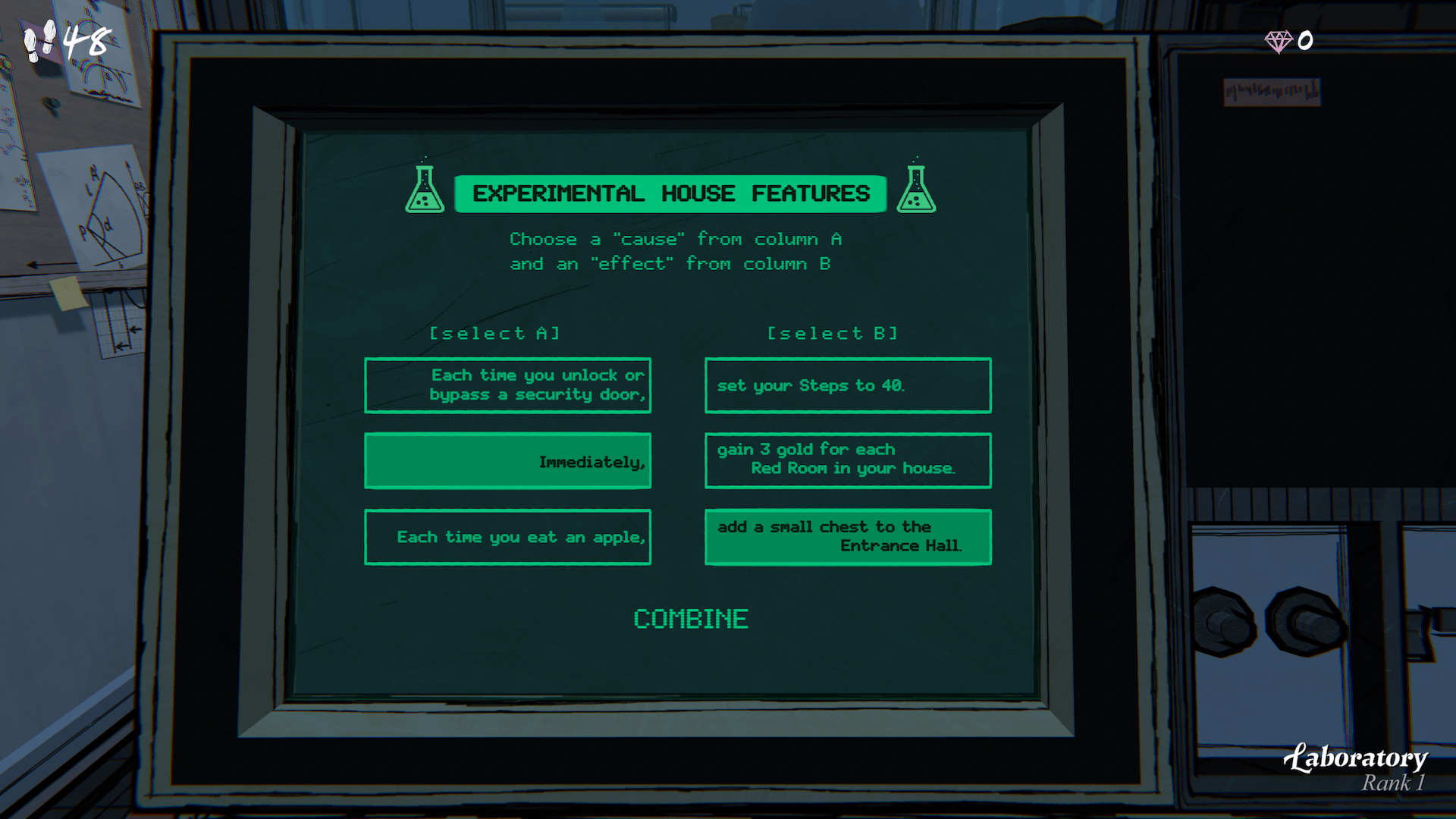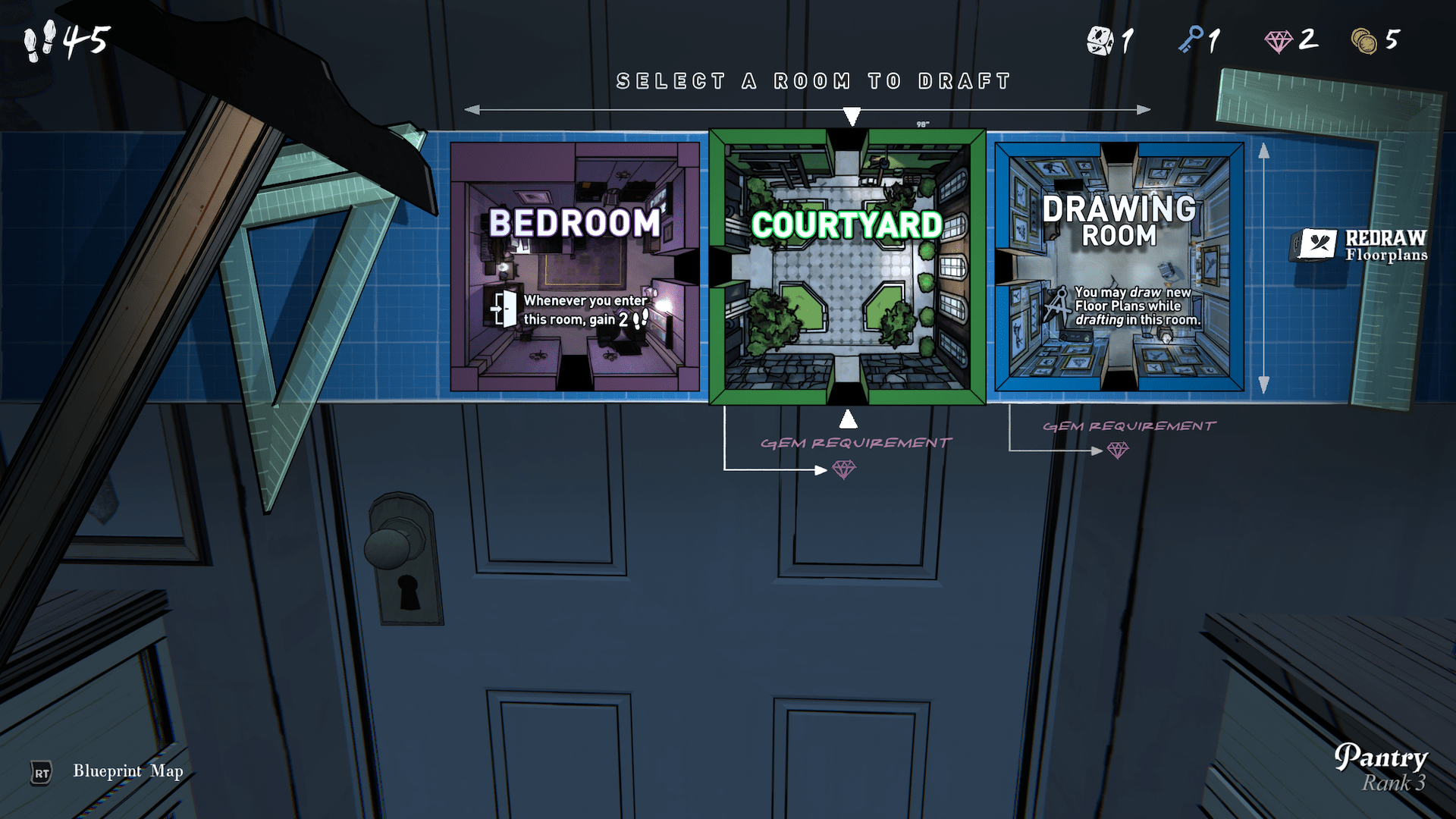 A l’image de Balatro ou Cloverpit, chaque nouvelle run démarre (presque) de zéro comme tout bon Roguelike. Cependant, il est possible d’activer des modifications permanentes. Sur une grille de 5 x 9 cases, vous allez dévoiler une salle à la fois. A chaque porte, 3 choix s’offrent à vous. Mais attention certaines salles ne s’ouvrent qu’en dépensant de préciseuses gemmes. Votre objectif : trouver la salle 46. Et ça sera très très loin d’être une chose facile.