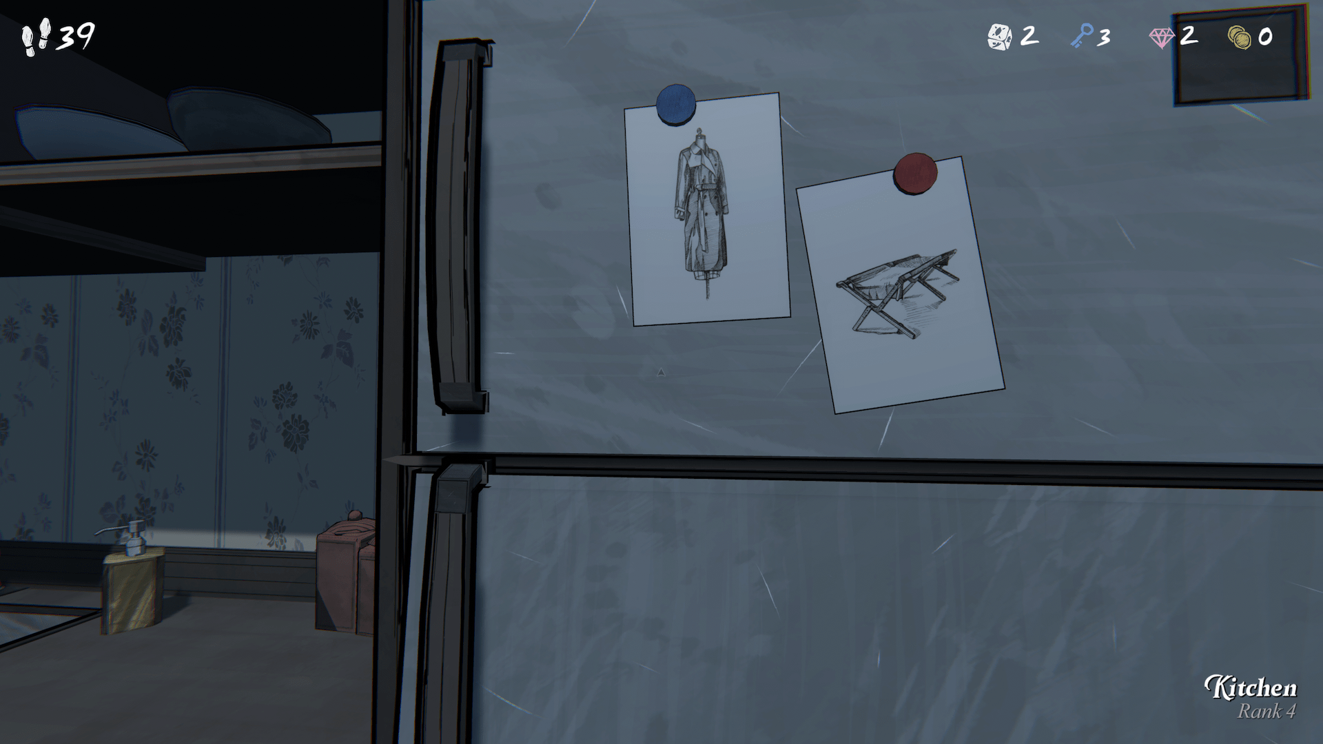 Vous commencez chaque journée d’exploration avec 50 pas. A chaque fois que vous traversez une porte vous en perdez 1. Donc attention aux demi-tours. Notez que si vous choisissez des salles rouges, vous pourriez même en perdre beaucoup plus. Très vite, vous allez vous rendre compte que ce nombre est assez bas. Il faudra donc intégrer des chambres à votre réseau pour vous reposer et gratter quelques pas supplémentaires.