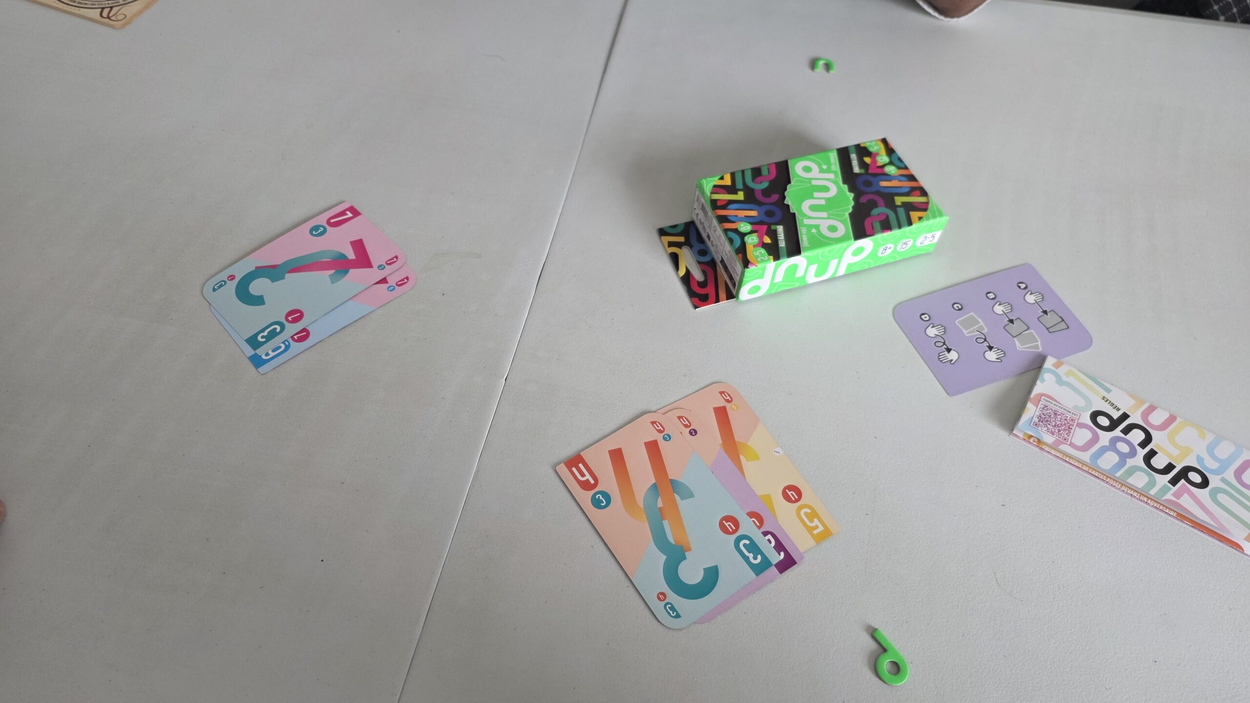 La toute petite boîte présente les multiples cartes du jeu et les jetons DNUP. On fait dans la simplicité et l’efficacité. Chaque carte présente deux numéros écrits à l’endroit et à l’envers. Il y a également une petit aide de jeu iconographique mais qui manque un poil de clarté à mon sens. Dans l’ensemble c’est du bon matériel.