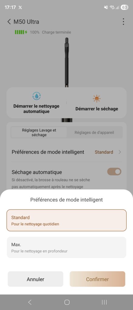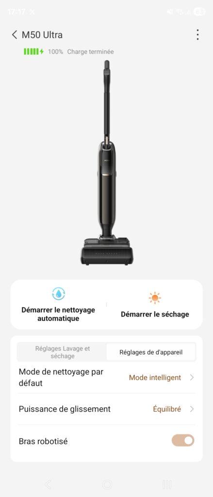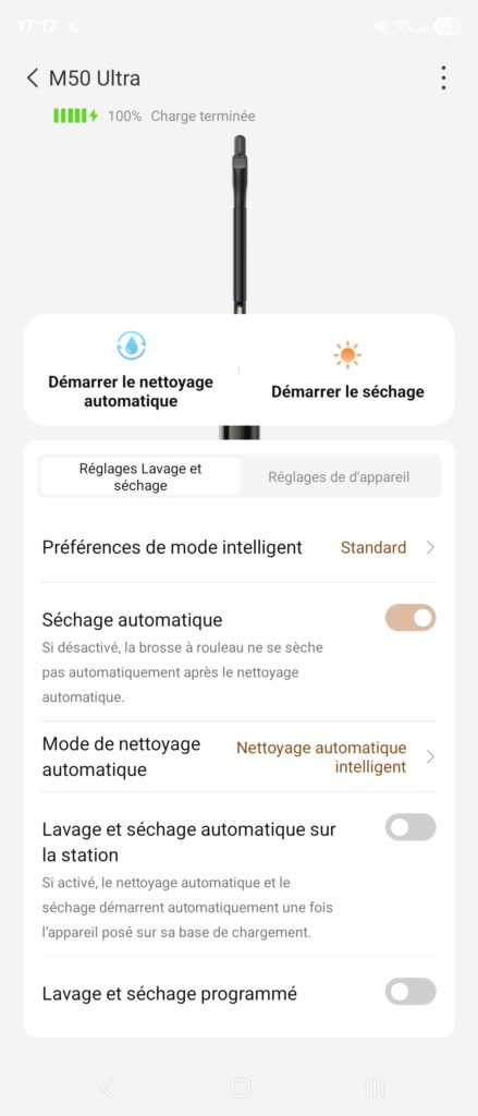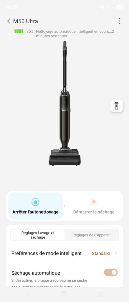 Il est possible de connecter votre appareil à votre téléphone. Si pour le robot aspirateur, c’est une fonction indispensable. Ici c’est assez gadget pour un usage quotidien. Cela peut être utile la première fois pour paramétrer quelques éléments comme vous pouvez le voir dans les captures d’écran ci-dessous : mode de nettoyage par défaut, préférence du mode intelligent, lavage et séchage automatique sur la station.