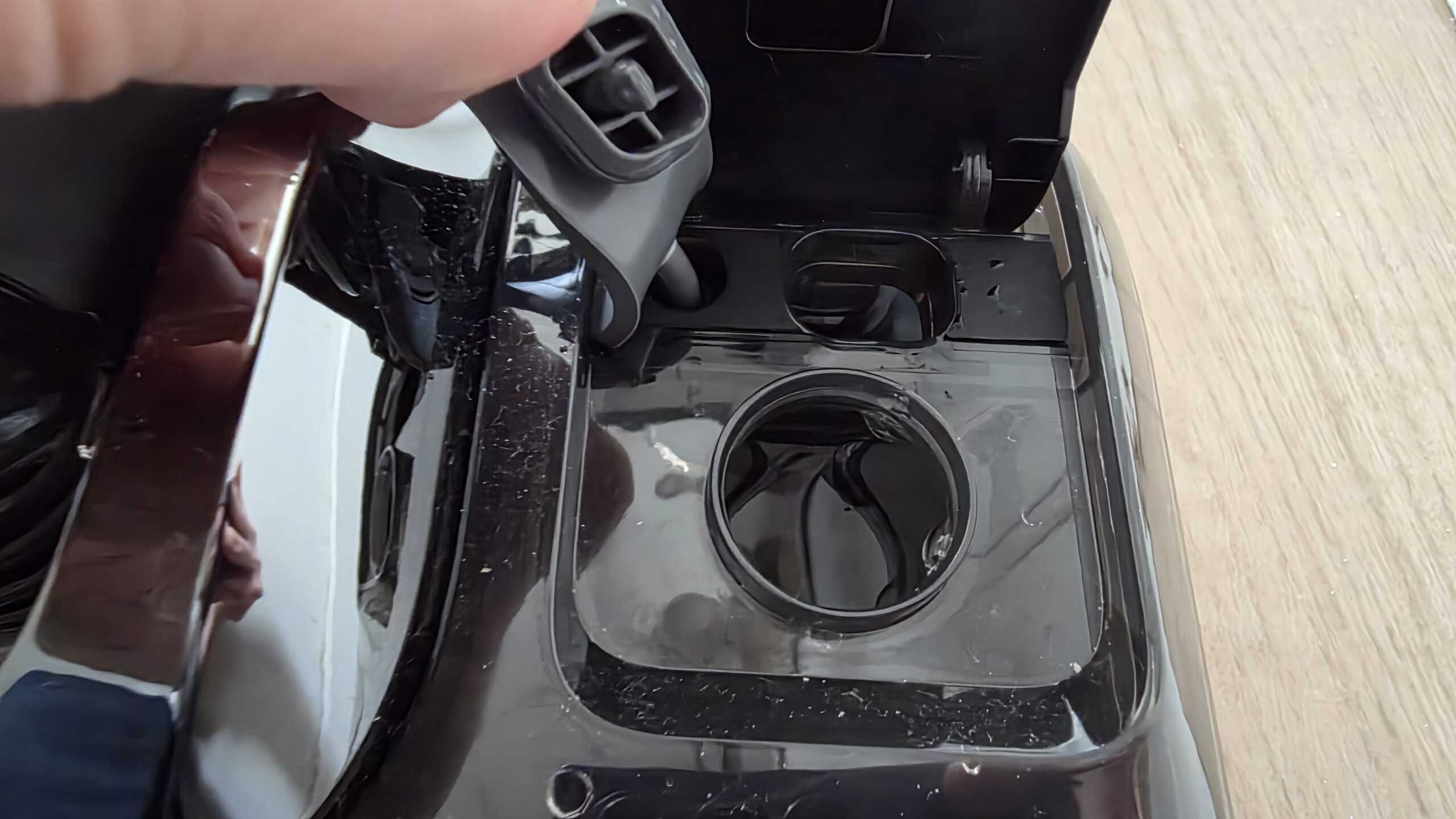 Concernant le bac d’eau et détergent, j’apprécie qu’il y ait deux réceptacles différents même s’il est loin d’être simple d’arriver à viser chacun d’eux. Il aurait été appréciable que les deux slots soient plus éloignés l’un de l’autre.