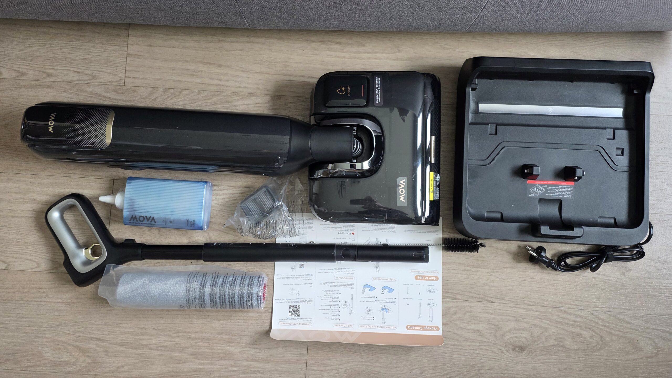 Une fois sorti de son grand carton, on retrouve l’aspirateur et le manche à emboîter. On retrouve également quelques pièces de rechange à savoir la brosse et un filtre. Pour attaquer le nettoyage de vos sols dès la première utilisation, on a droit une bouteille de liquide nettoyant. Enfin, il y a aussi une brosse de nettoyage pour les parties étroites du bac de récupération des déchets.