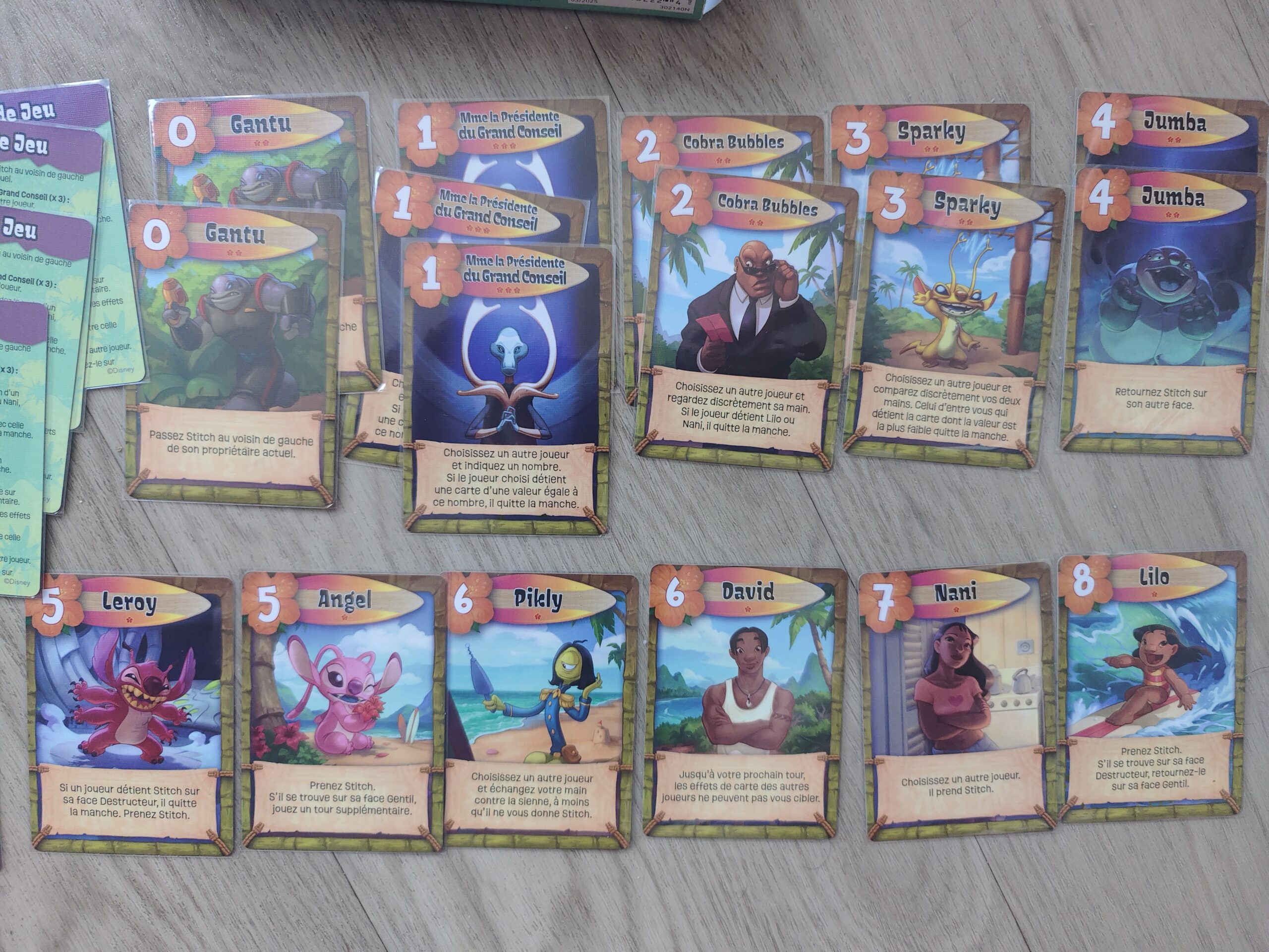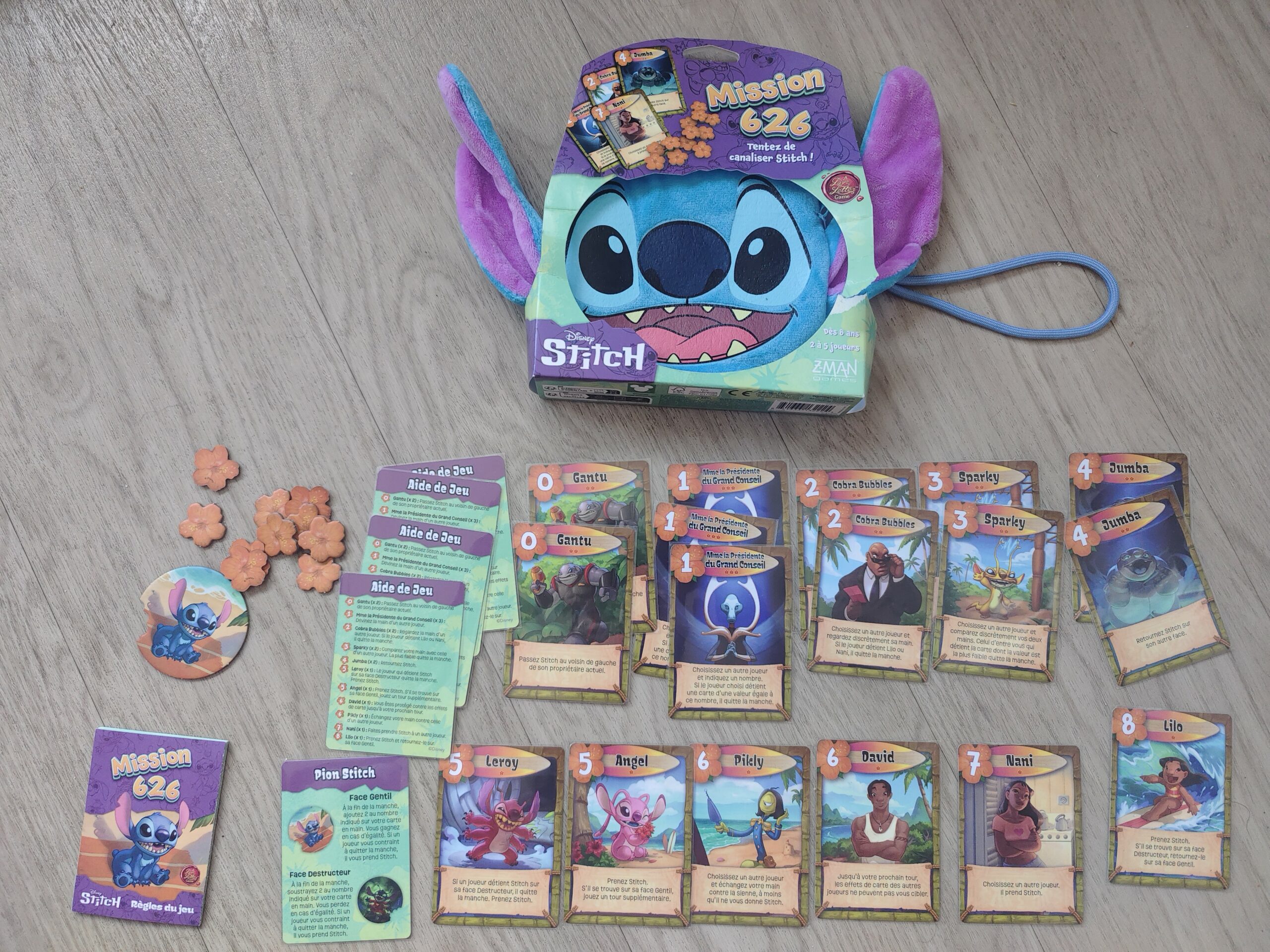 On retrouve une pochette ultra stylée aux couleurs du monstre bleu, 17 cartes de jeu, 5 cartes d’aide de jeu, le jeton stitch gentil/destructeur et quelques jetons pour les points de victoire. Dans l’ensemble c’est du bon matériel