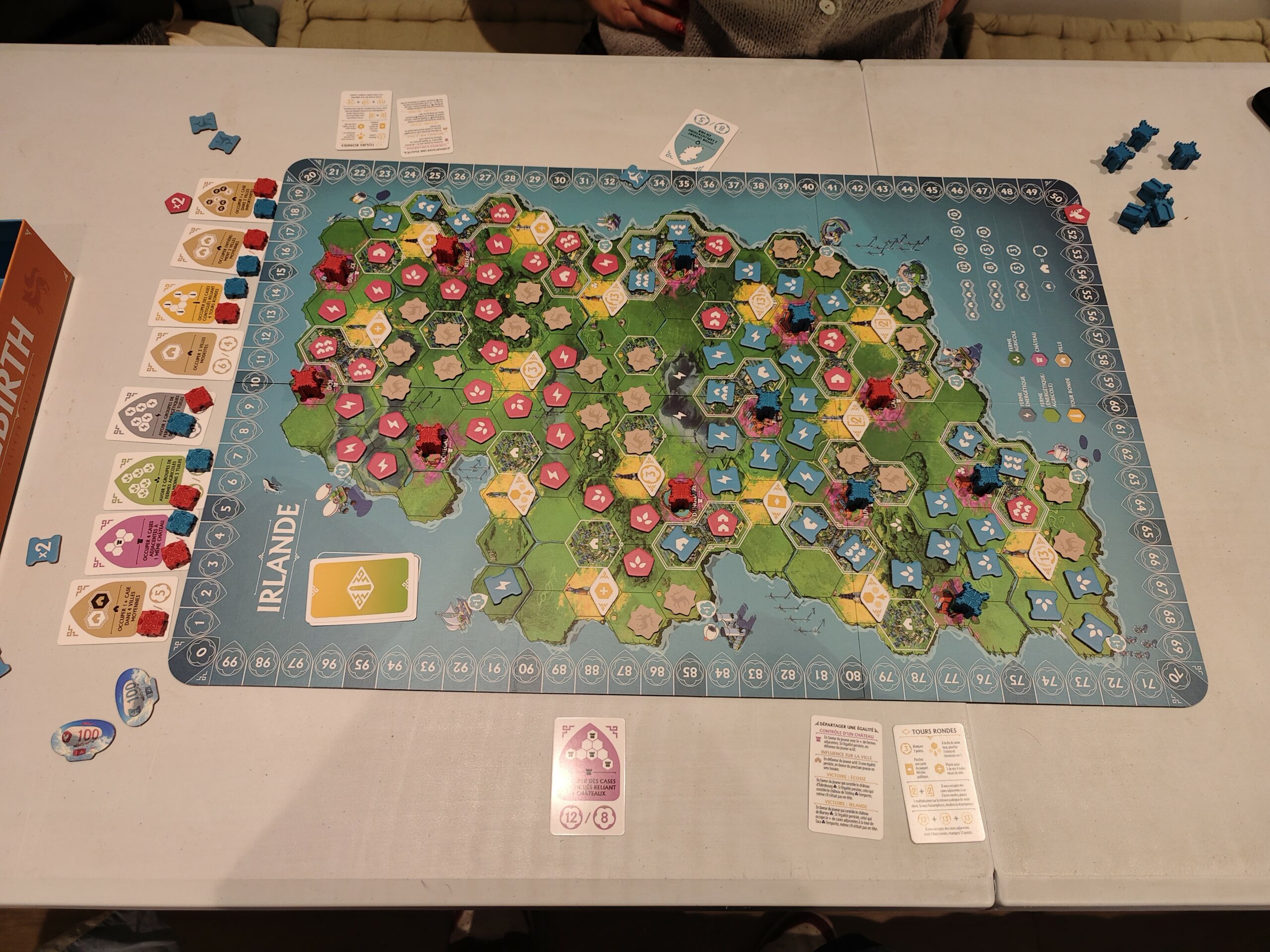 Rebirth est un jeu familial très accessible. Avec la face Irlande, tous les joueurs connaissent les objectifs publiques et la tension est palpable. Du côté de l’Ecosse, l’offre est secrète et s’acquiert au fur et à mesure de la partie à un rythme asynchronne. Malheureusement, je trouve que c’est un titre extrêmement dépendant de la chance. Un joueur qui n’aurait pas les bons éléments au bon moment pendant de nombreux tours sera démuni face à des adversaires bien plus chanceux. En tout cas, ne négligez pas les contrôles de châteaux à la fin de la partie, ils rapporteront 5 points chacun.