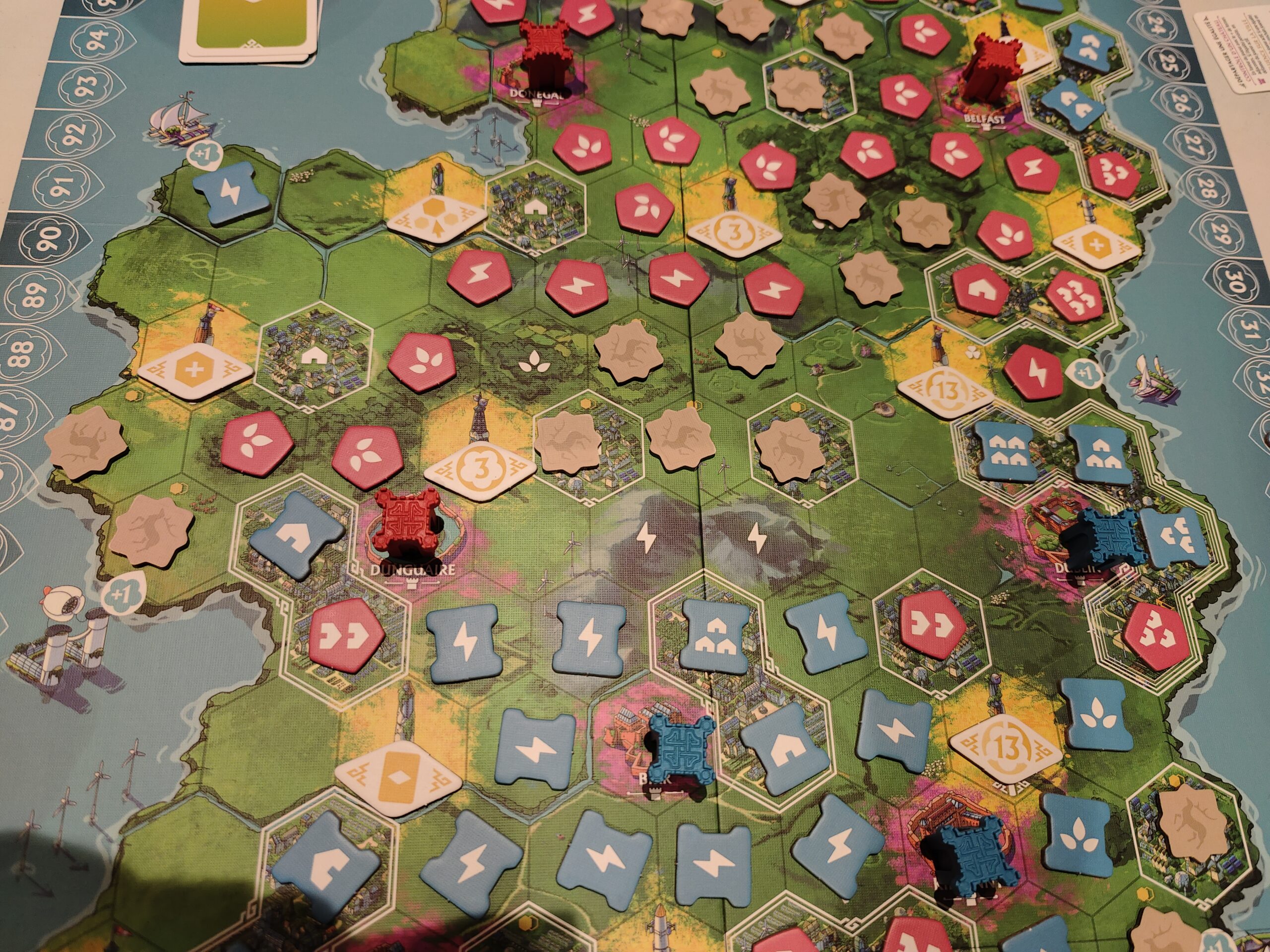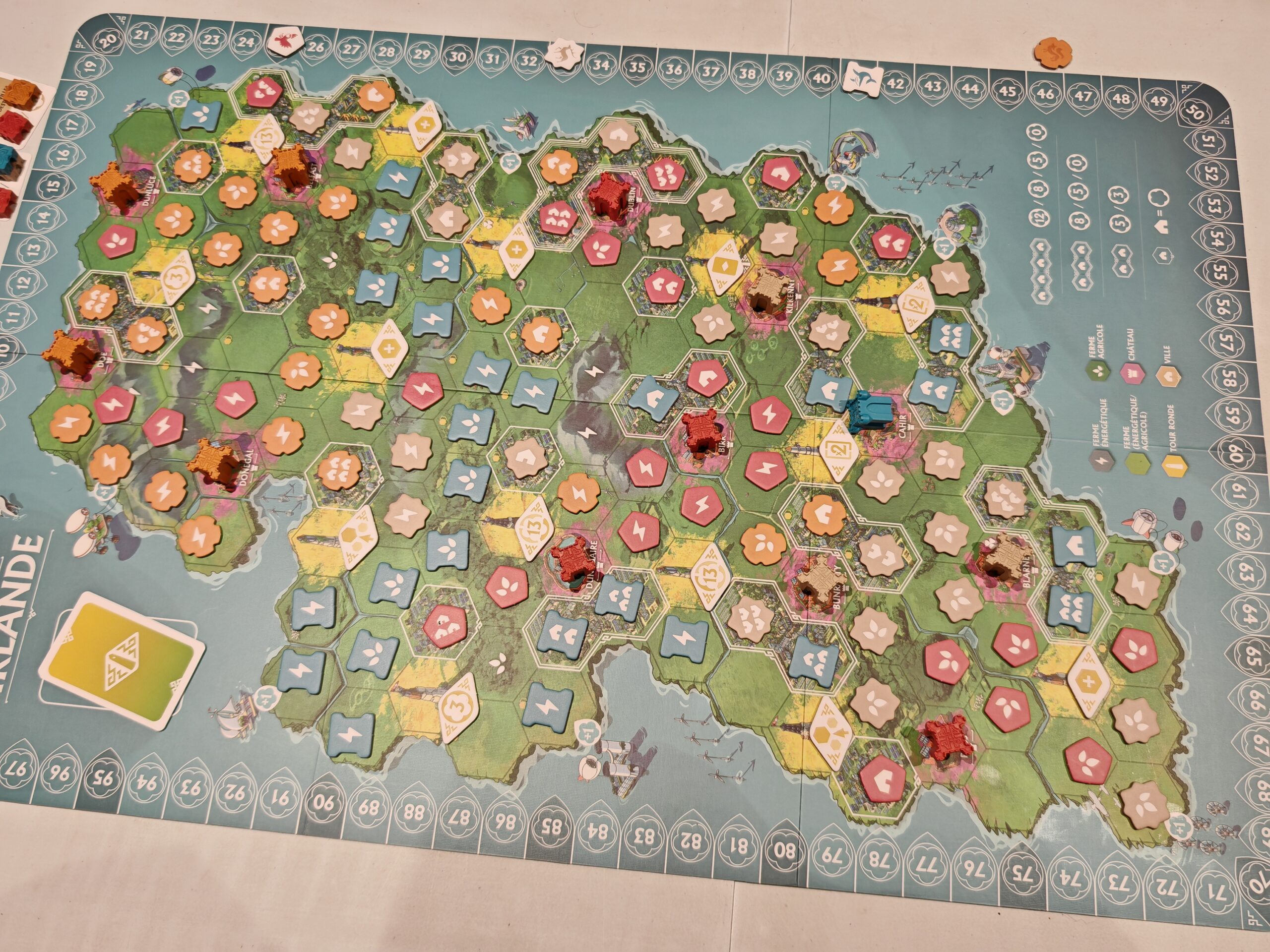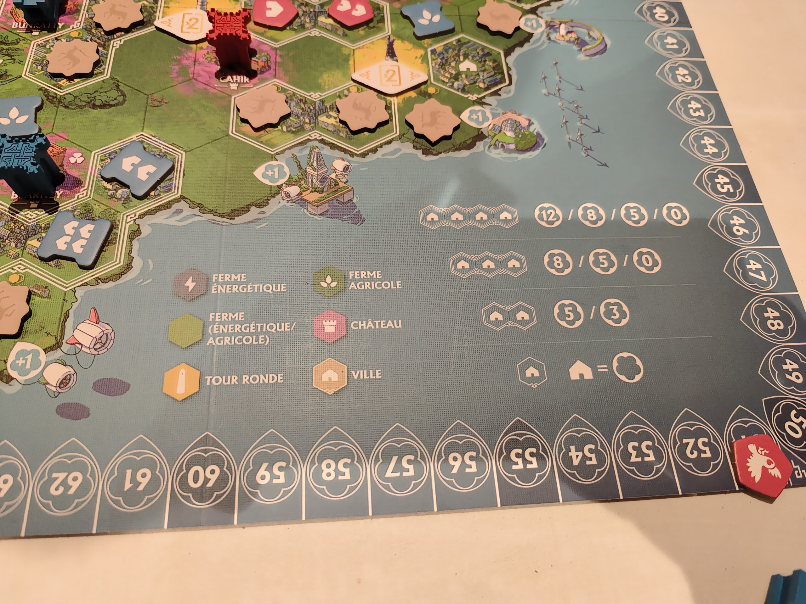 On retrouve un grand plateau central recto/verso pour les deux modes du jeu et diverses cartes de mission privées ou publiques selon le mode choisi. Enfin et surtout chaque joueur dispose de jetons en cartons pour les trois éléments du jeu (fermes énergétiques/agricoles et campements) ainsi que des jolis pions de cathédrales et châteaux. Des aides de jeu sont disponibles pour chaque joueur.