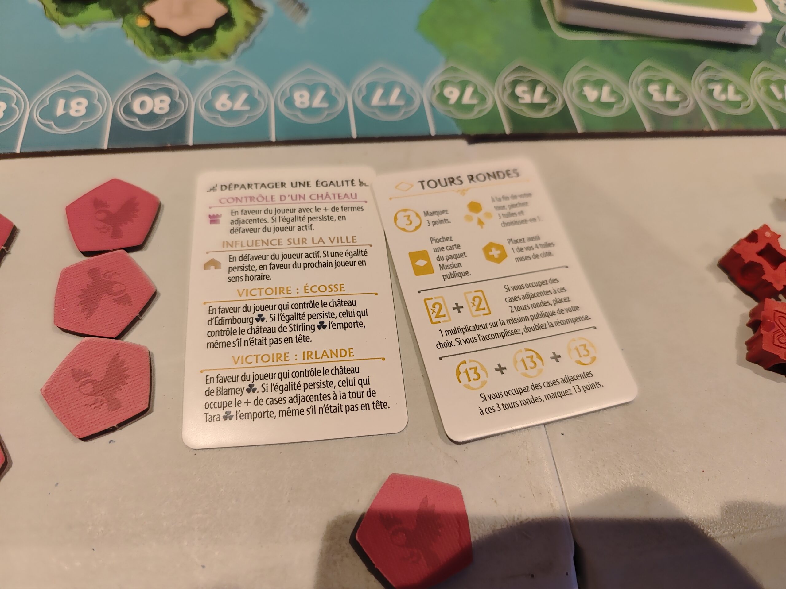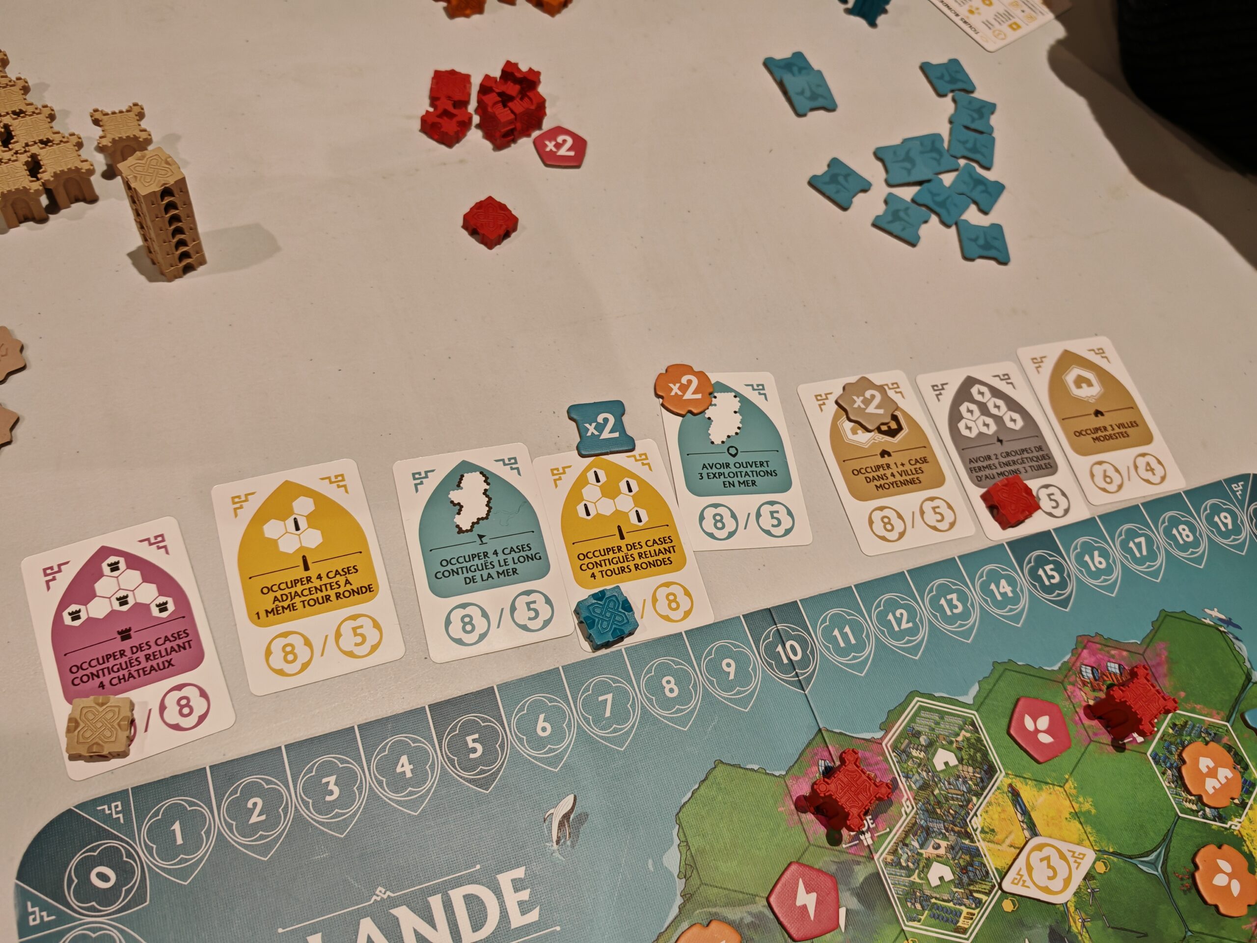 Précisions : quand il est écrit “occuper des cases”, on parle des jetons en cartons. Les pions châteaux/cathédrales ne comptent pas.