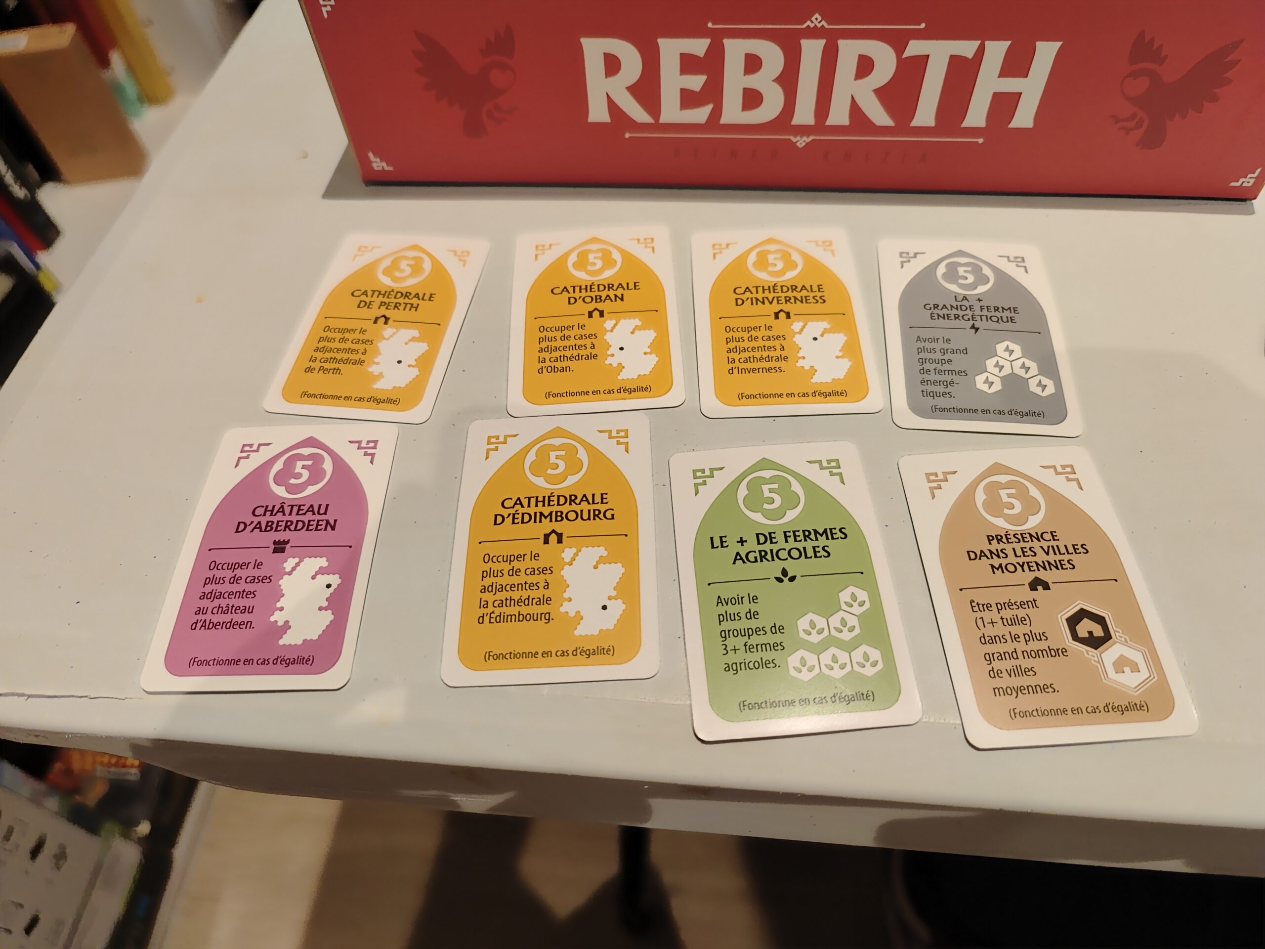 Rebirth se joue très facilement. A chaque tour vous piochez un jeton au hasard et l’installez sur le board central. Vous pourrez gagner des points voire déclencher des contrôles de châteaux. De plus si vous êtes adjacent à des cathédrales ou tours rondes pour la première fois, profitez de leurs effets.