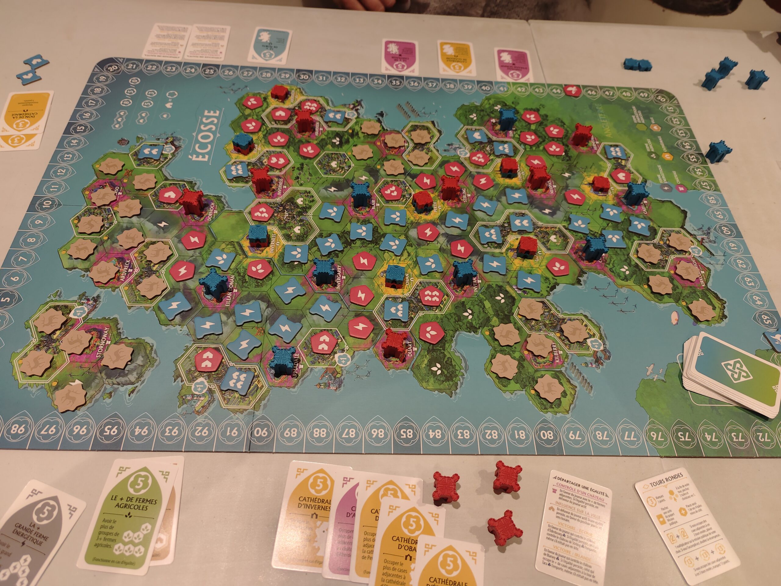 Avec la face Ecosse, les joueurs vont acquérir au fur et à mesure de la partie leurs cartes objectifs. Ne traînez pas pour les récupérer sans quoi votre jeu s’orientera de manière hasardeuse.