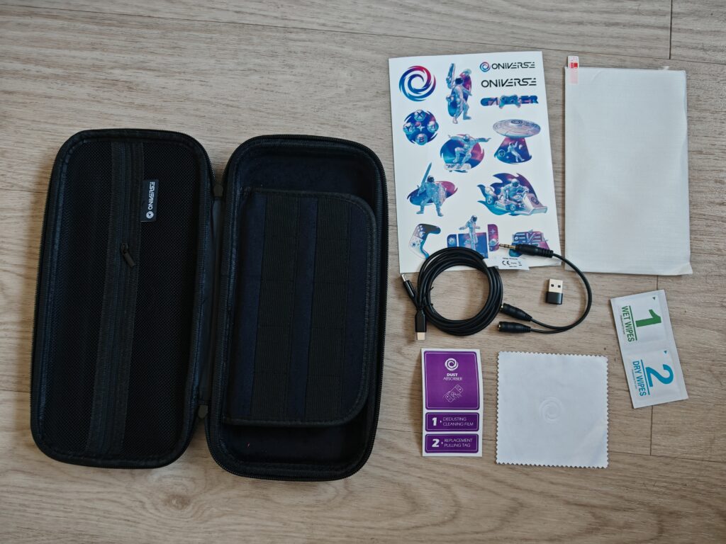Les produits qu’on retrouve dans ce pack sont : une housse de transport rigide, un doubleur audio jack, une protection pour écran, des lingettes et chiffons nettoyants, un câble de charge USB-C de 1m50, avec adaptateur USB-A. On retrouve aussi une planche de stickers aux couleurs de la marque. Notez que la housse compatible Nintendo Switch 2 permet d’accueillir 10 jeux et de ranger divers câbles dans son filet.