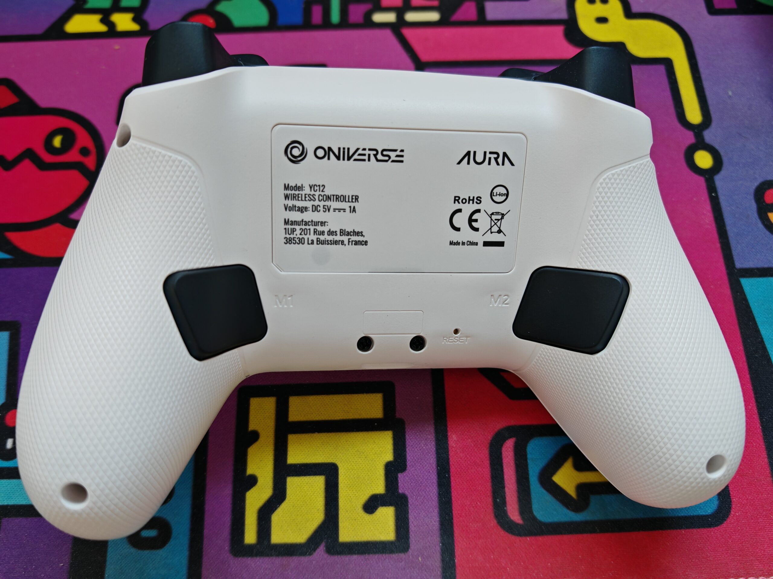 La manette Oniverse Aura est compatible consoles, PC et mobile. Elle a le même design que les manettes Pro de Nintendo Switch 2 ou Xbox Series. Cependant, celle-ci présente deux boutons réglables à l’arrière.