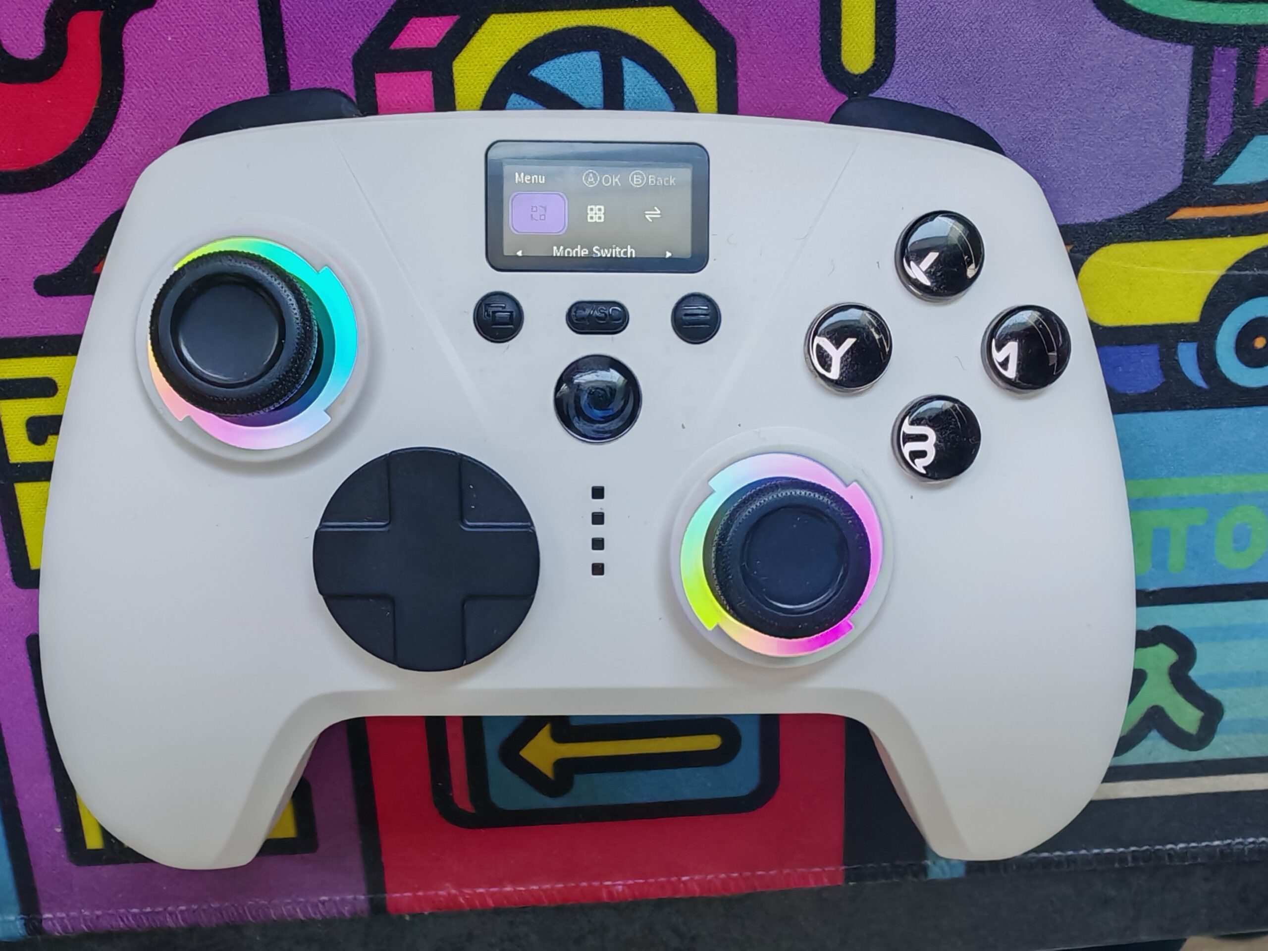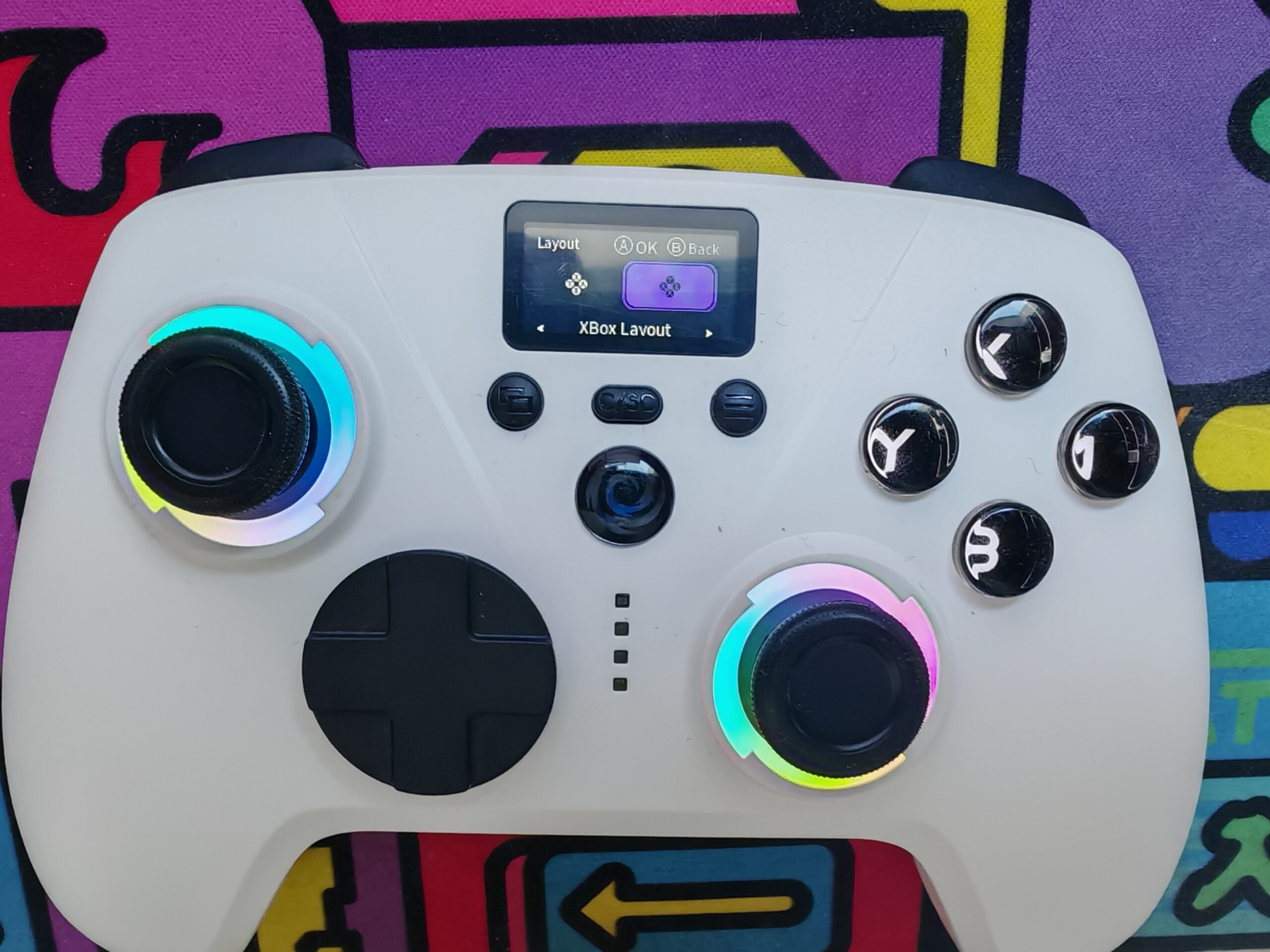 On retrouve un écran sur la manette permettant de gérer les paramètres de macro, vibration, turbo, profils, Bluetooth… Vous pouvez aussi profiter des menus pour basculer l’agencement des touches entre Switch et Xbox.