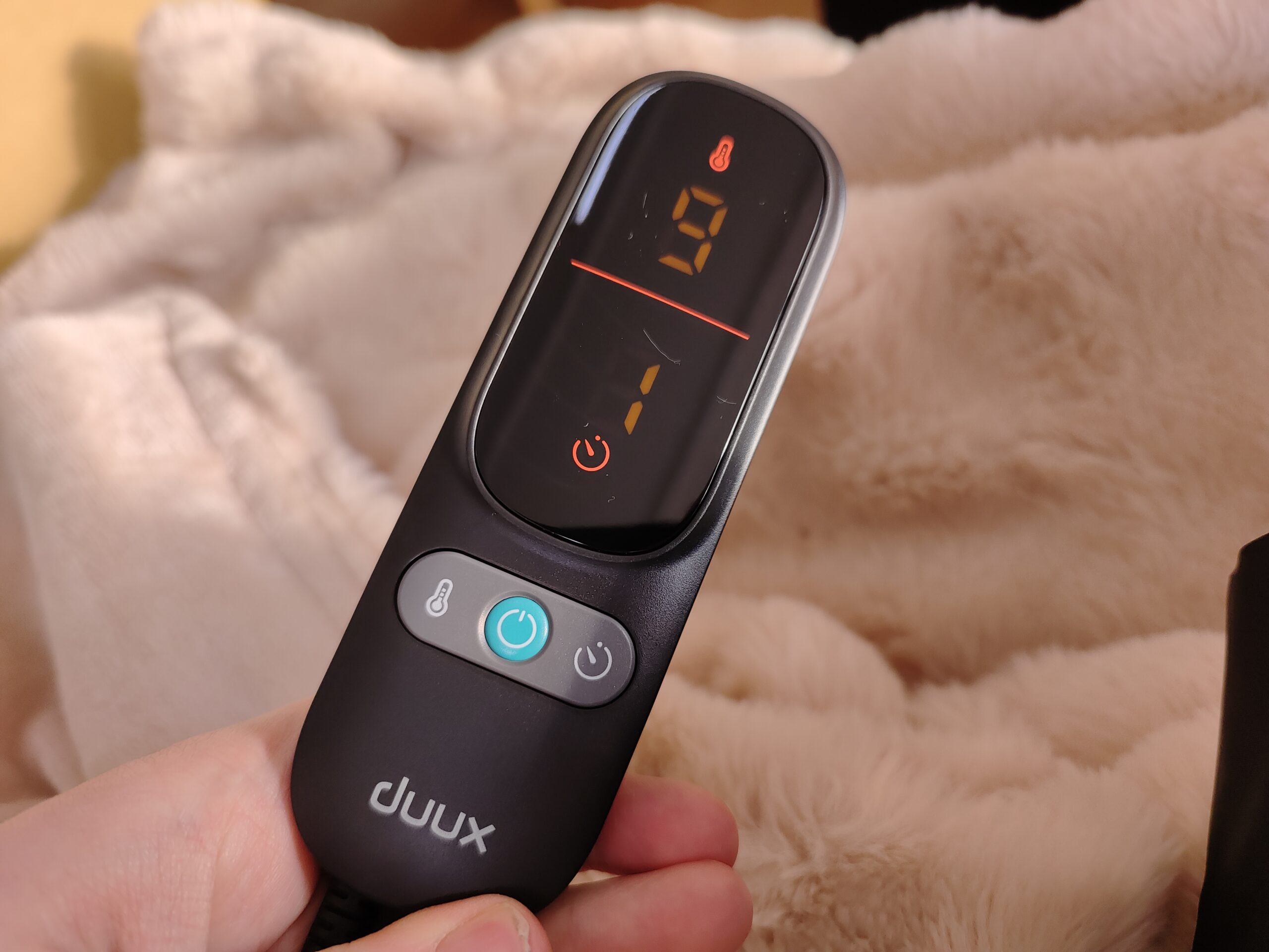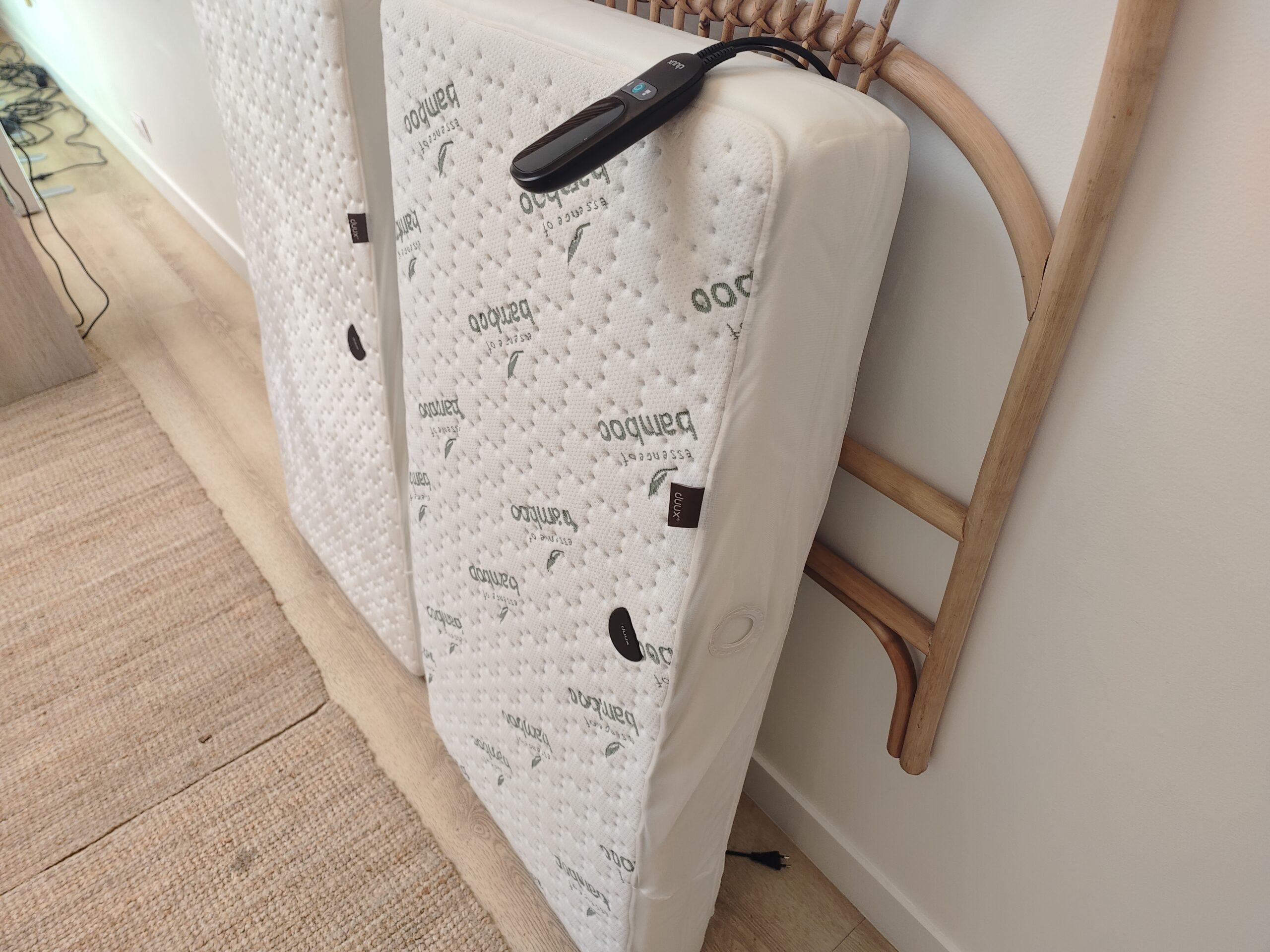 Une télécommande est accrochée au système électrique et permet de contrôler l’intensité de chaleur et la durée d’allumage. D’après le site web, on peut retirer la télécommande. Cependant, j’ai constaté une grande difficulté à débrancher le produit du côté de la couette. J’ai donc préféré laisser tous les éléments liés pour l’instant.