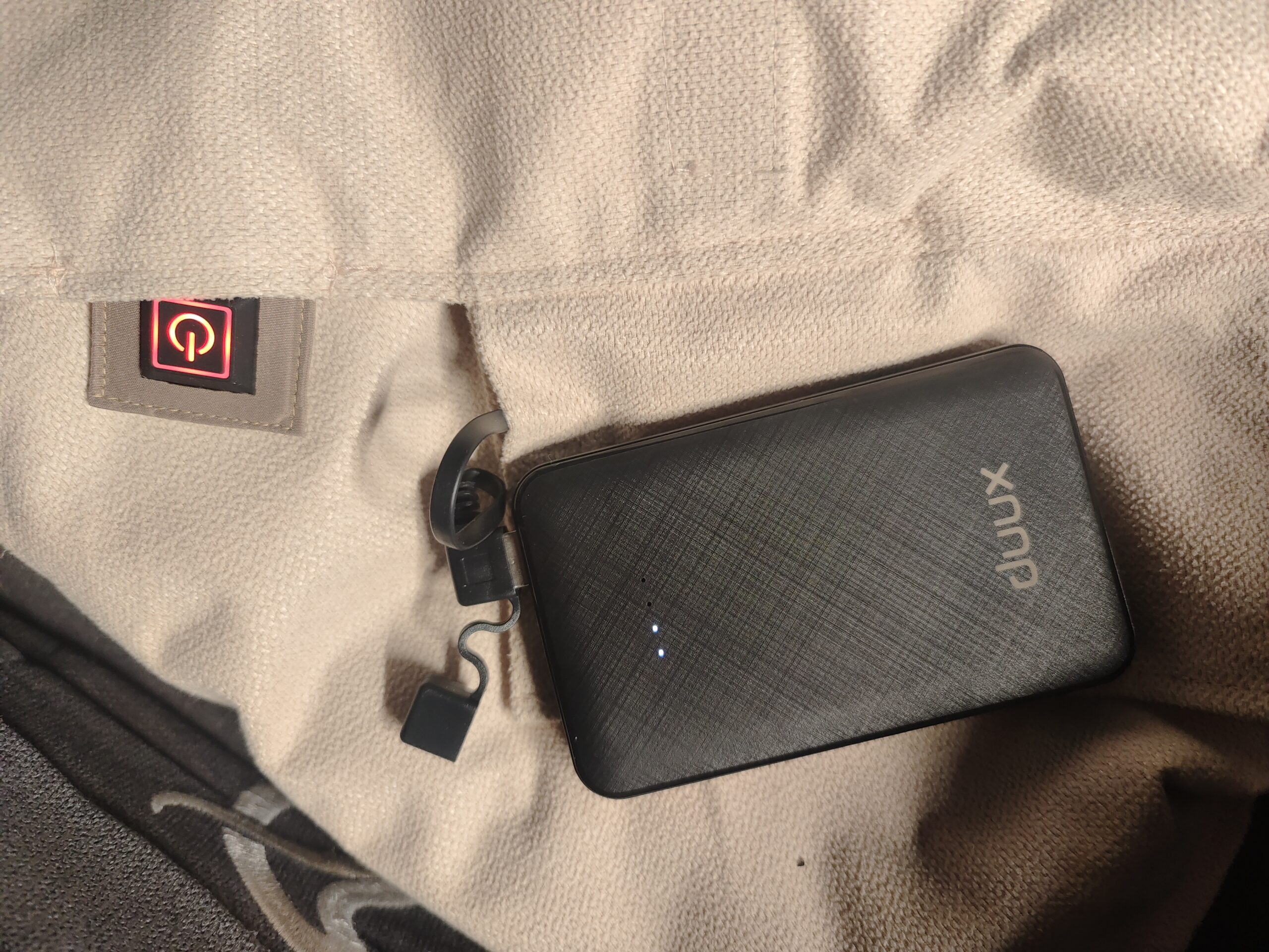Ces trois produits fonctionnent de l’exacte même façon. Ils sont tous livrés avec une batterie portable de 10 000 mAh à glisser au sein du coussin dans une pochette interne ou externe. Une fois alimenté, on retrouve un bouton power à presser pour activer trois niveaux d’insentité de chaleur représentés par trois couleurs (rouge, orange et blanc).
