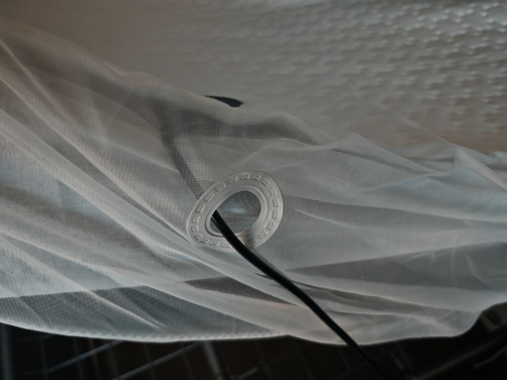 Assurez-vous d’installer la housse comme présenté dans le visuel ci-dessus avec les caches Duux sur la face supérieure. Vous aurez la partie prise électrique sur la face inférieure que vous pourrez faire passer dans les anneaux latéraux de la hausse durant l’utilisation.