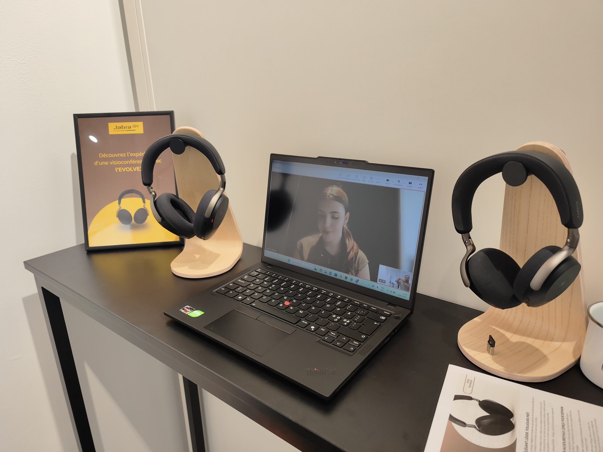 Au showroom, nous avons eu droit à une démonstration mettant en avant LA feature majeure du produit : le Jabra ClearVoice. Le micro du casque, accompagné par l’IA, isole très bien la voix de l’utilisateur et masque les bruits environnants. Cela marche vraiment très très bien, c’est bluffant. Vous pouvez le tester aussi sur le site officiel.