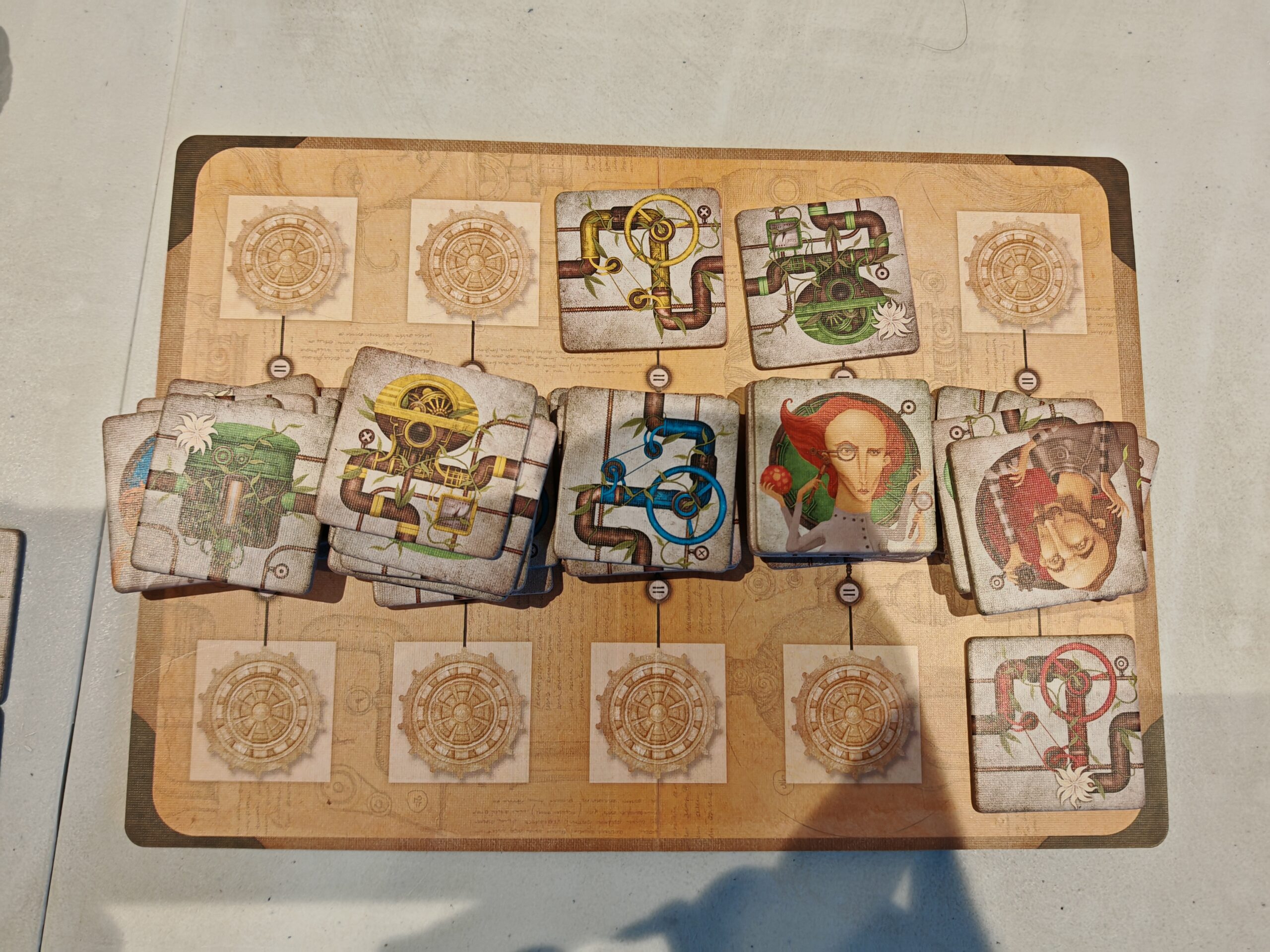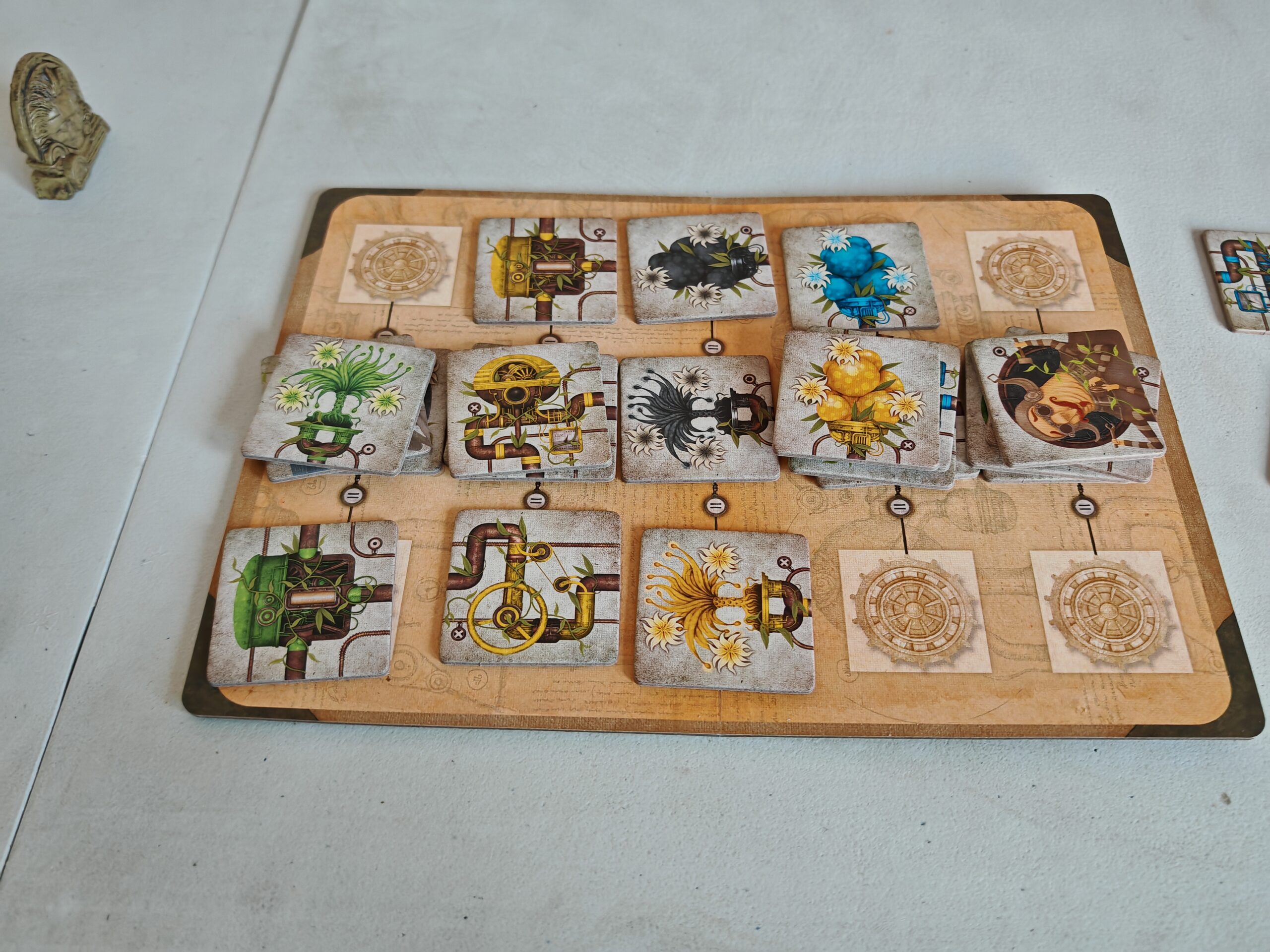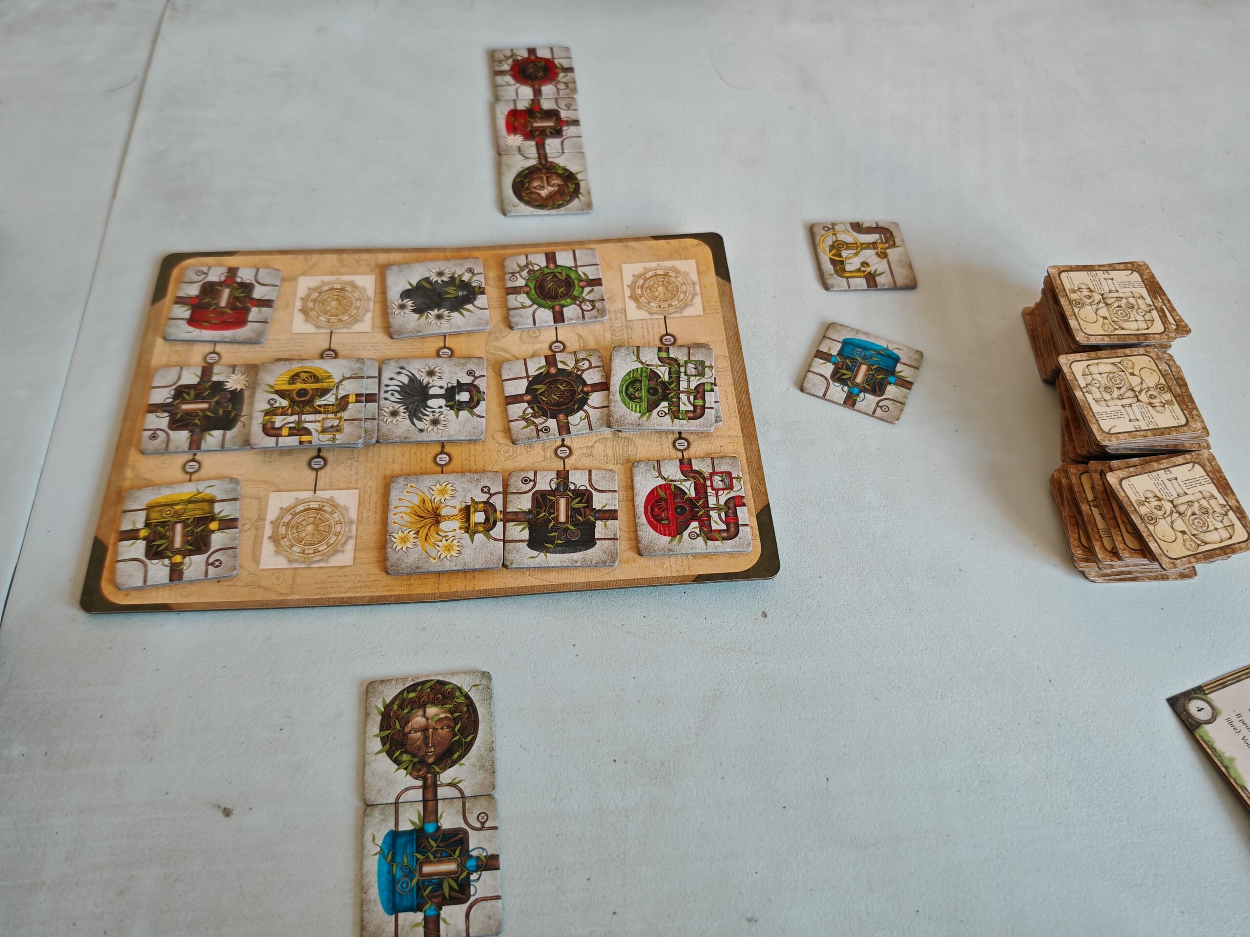 La petite boîte de jeu présente un insert qui permet de bien tenir l’ensemble des tuiles du jeu. Le tout est recouvert par le plateau central. On retrouve aussi un joli pion premier joueur. Les tuiles ont un chouette design steampunk. Dans l’ensemble c’est du bon matériel.
