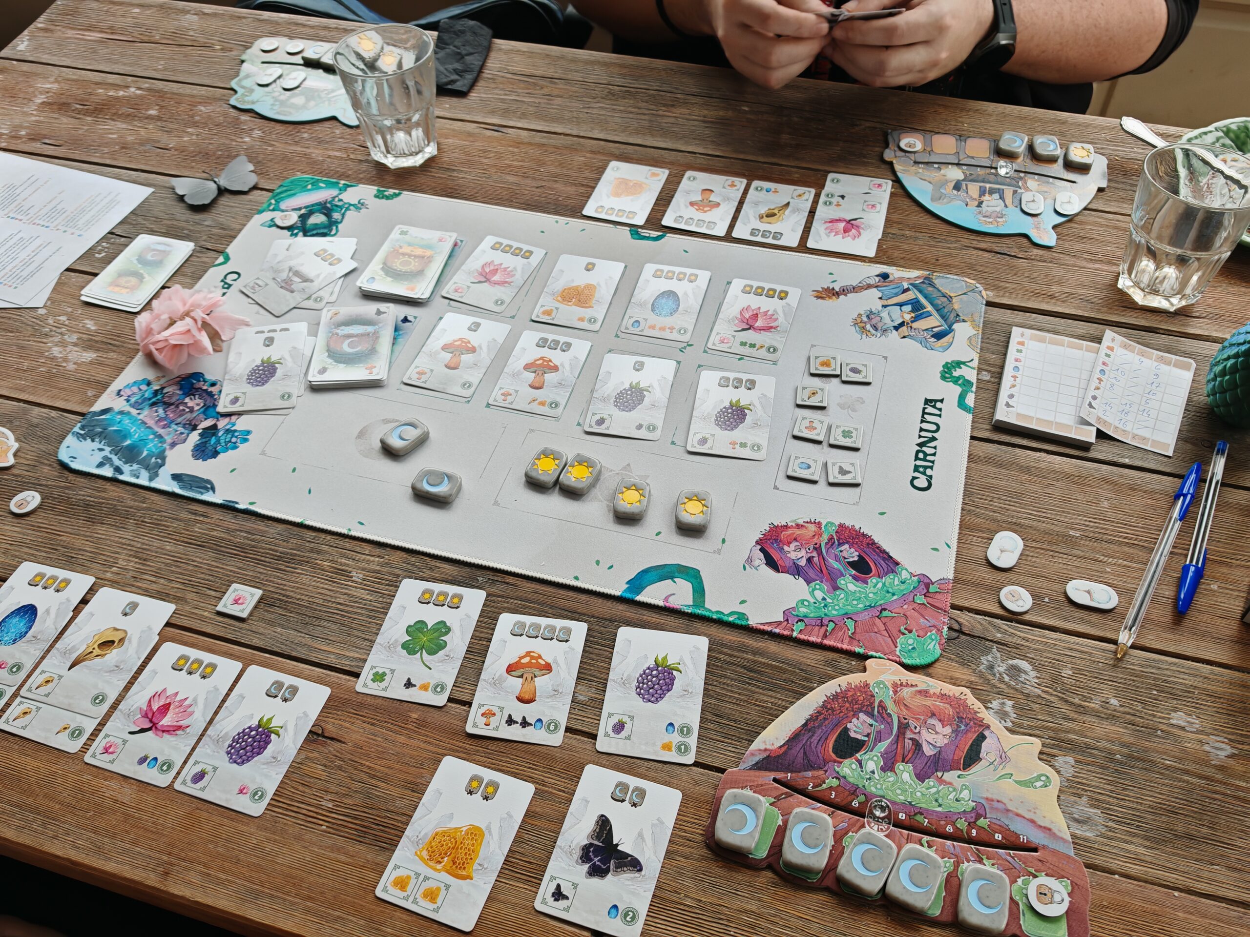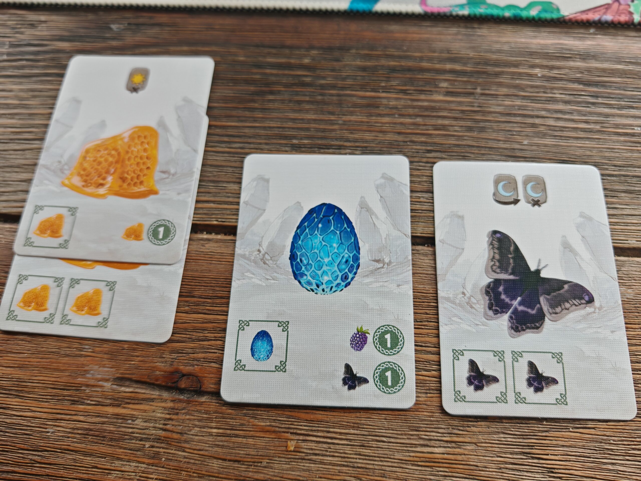 Carnuta est un jeu de collection et de combo. Sous la plupart des cartes vous aurez des conditions pour gagner les points. Par exemple chaque miel rapportera 1 point ou chaque lot de 2 papillons et 1 oeuf, 6 points.