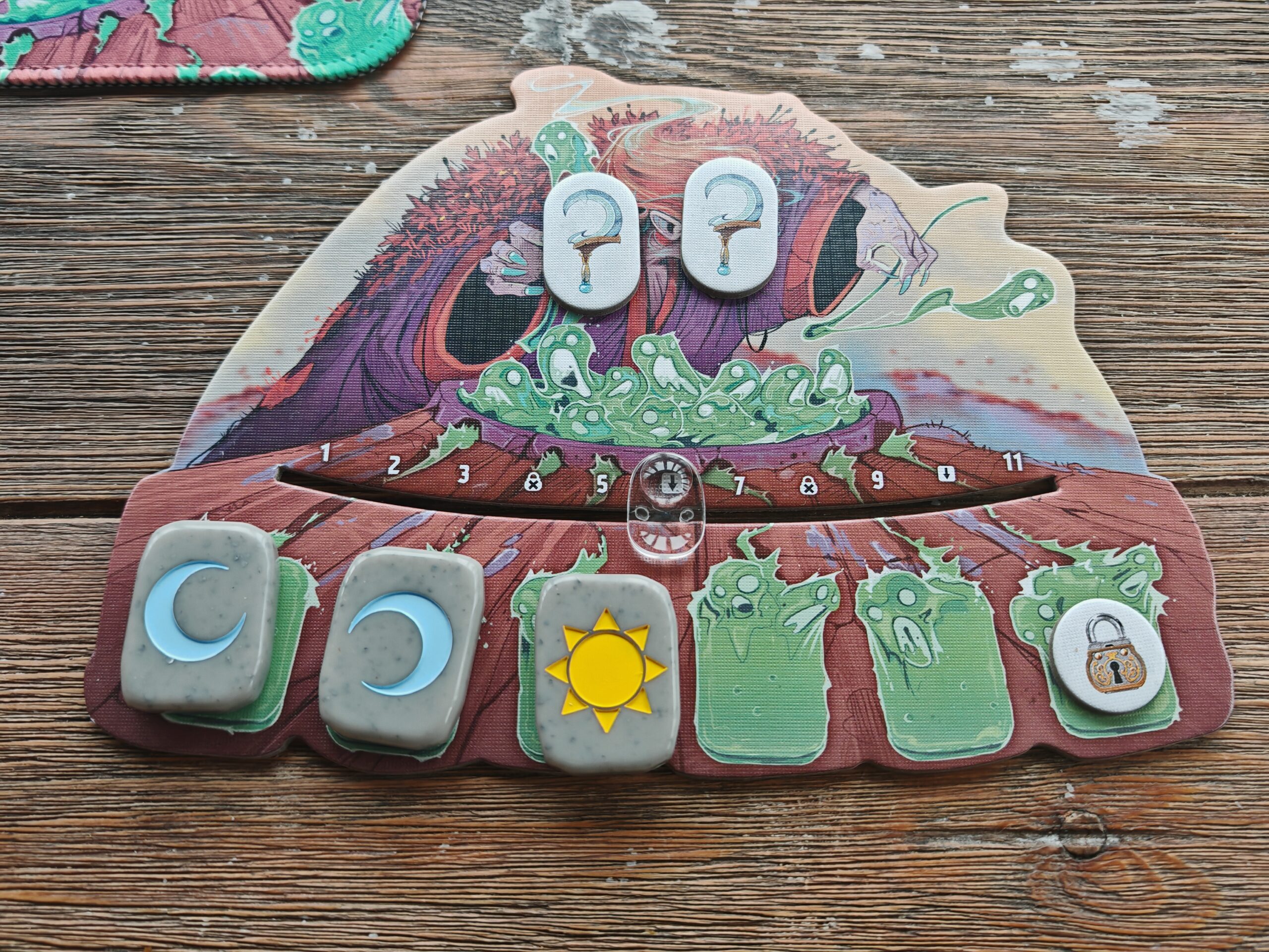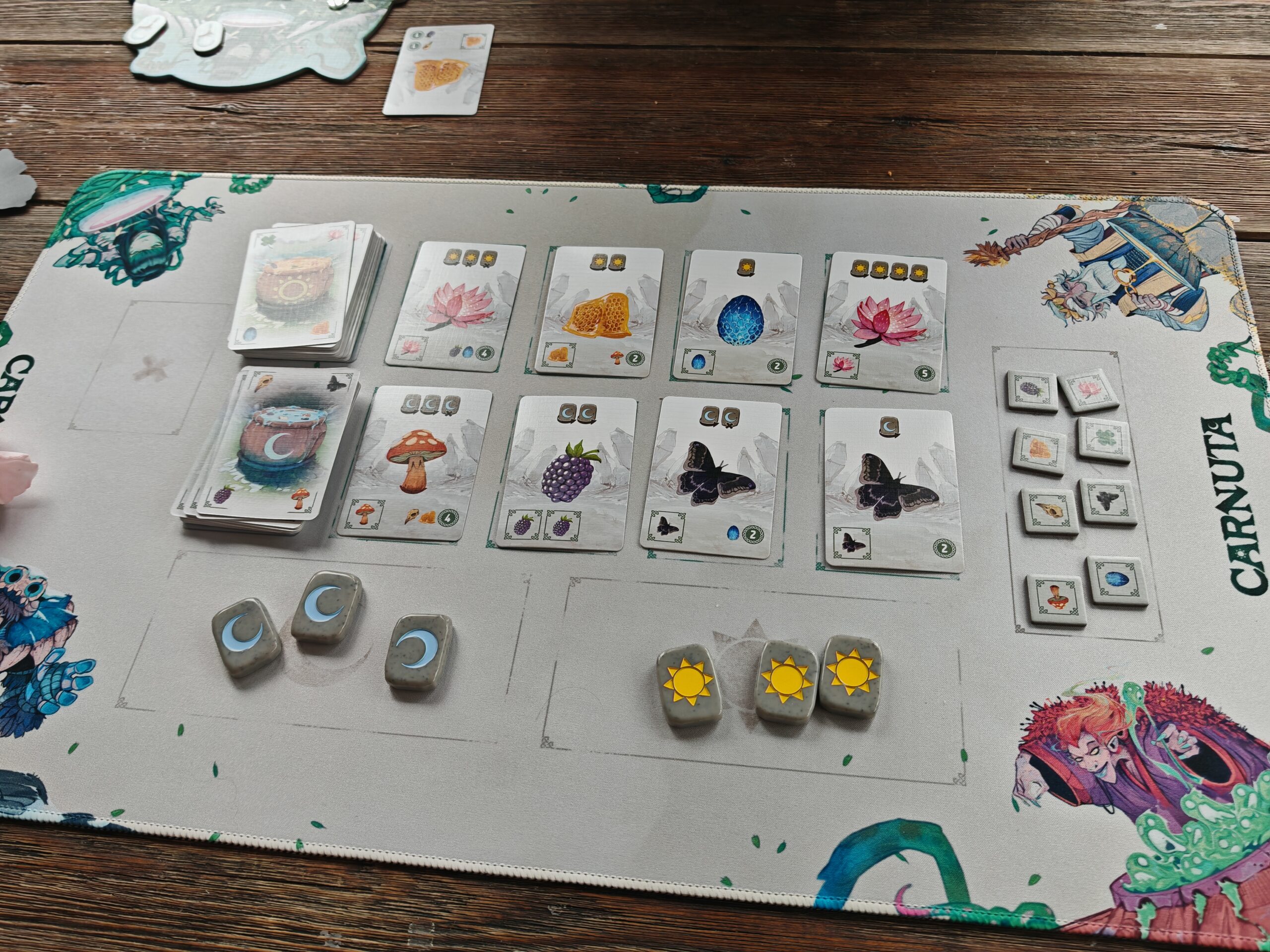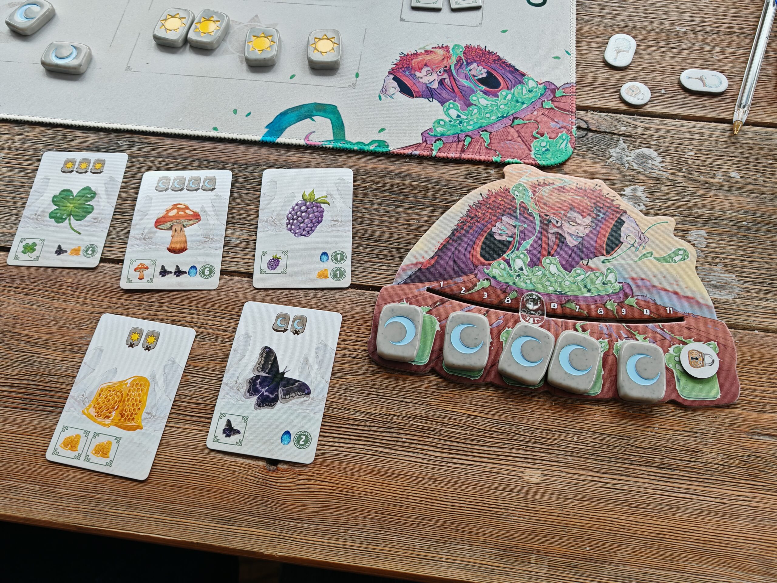 A vous de sélectionner les cartes qui se combinent le mieux pour l’emporter. Attention plus les cartes rapportent plus elles nécessiteront de tuiles. Deux decks sont au centre de la table : soleil et lune avec 4 ingrédients exclusifs à chaque deck. Chaque deck présente aussi du sel, une ressource joker à associer à n’importe quelle pile. Etant donné que vous allez souvent tourner vos tuiles, vous allez régulièrement alterner entre pose d’une carte lune et d’une carte soleil.