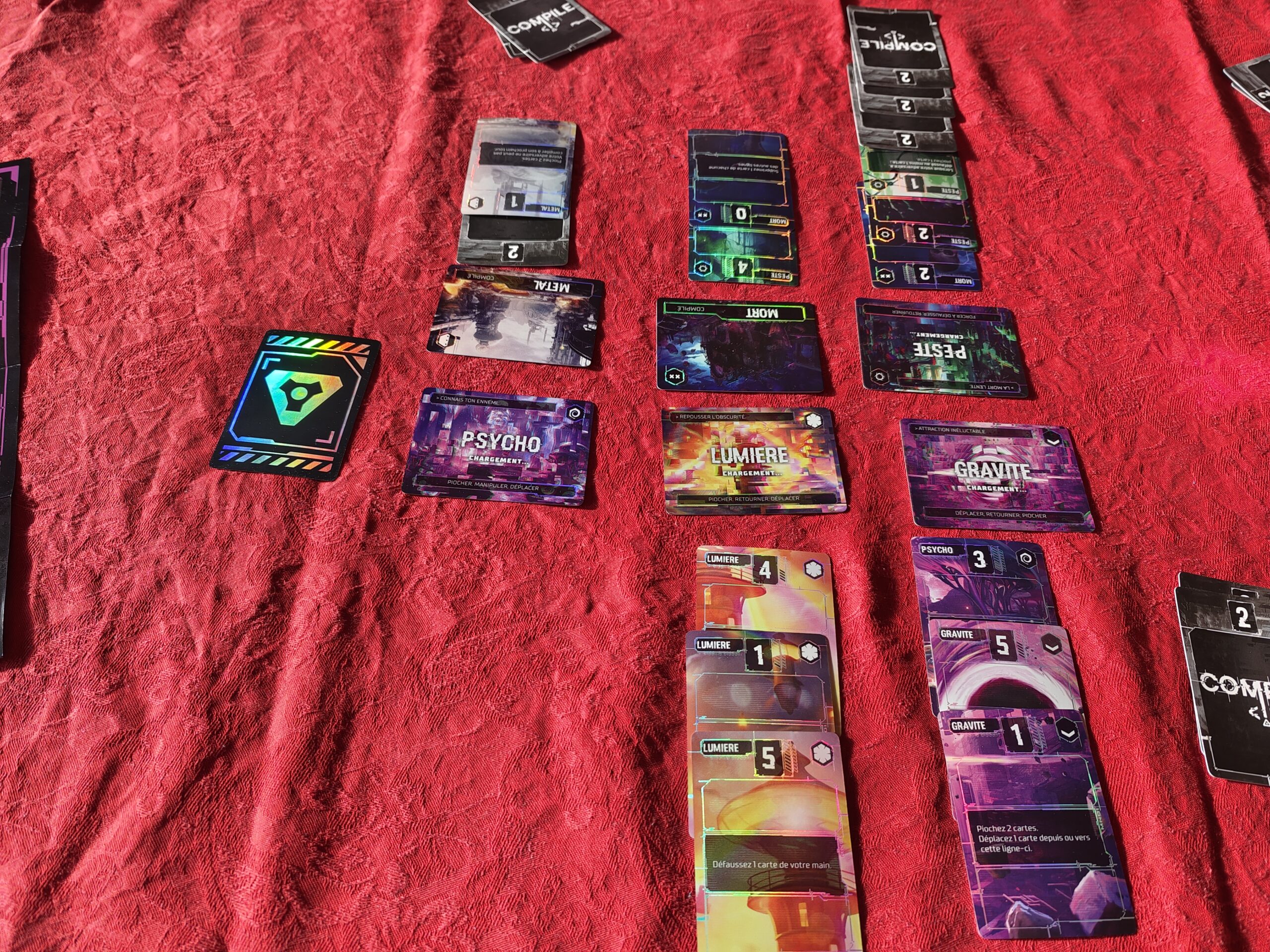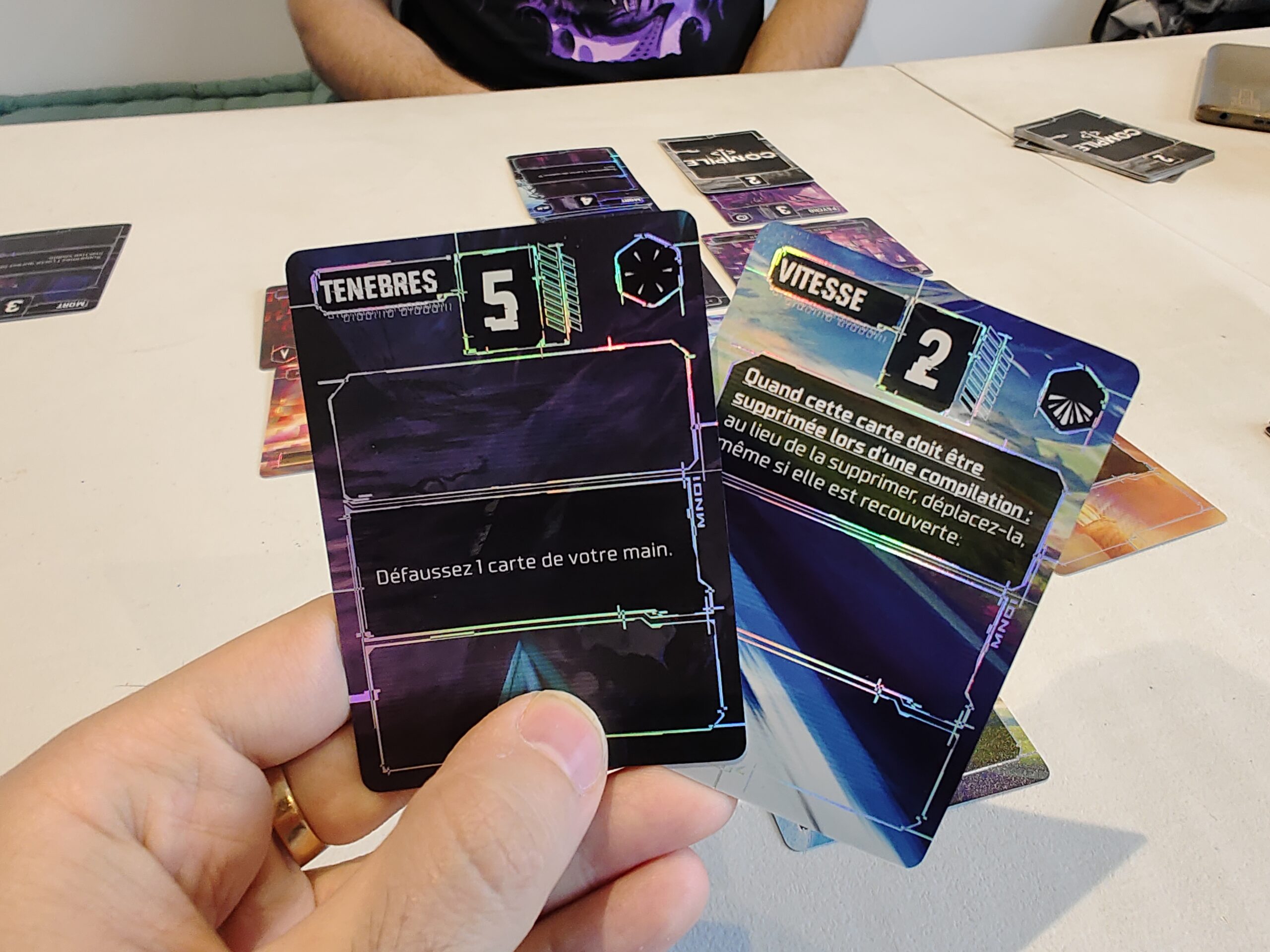 Vous allez devoir compiler 3 lignes en rassemblant plus de 10 point sur chacune d’elles (et plus que votre adversaire). A chaque succès, la ligne est entièrement défaussée. Il reste cependant intéressant de continuer à travailler sur ces lignes pour plusieurs raisons : limiter la victoire sur la carte compilation adverse, réaliser une nouvelle compilation et donc voler une carte à l’adversaire, profiter de l’effet de la carte module de contrôle pour échanger la place des cartes de au centre de la table.