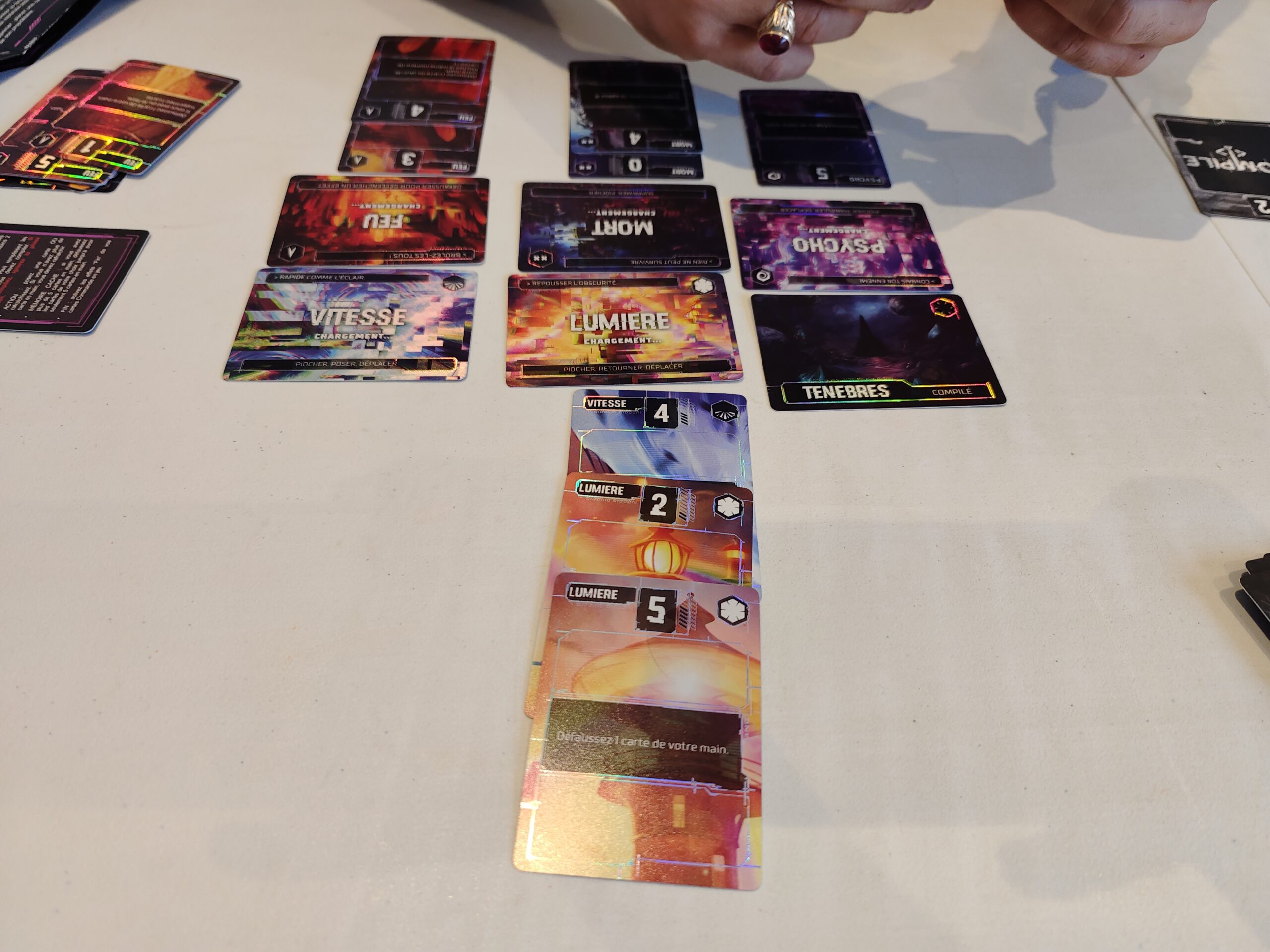 Sans surprise plus la carte posée a une grande valeur plus les conséquences seront négatives pour vous. Vous allez donc devoir jongler avec les effets positifs et négatifs. De plus, toutes vos cartes peuvent être placées face cachées pour une valeur de 2 points. Ici vous n’aurez pas besoin de respecter la nature de la ligne. Libre à vous de la mettre où vous voulez donc. Idéalement, vous chercherez à la retourner par la suite pour avoir une grande valeur et des effets supplémentaires. A chaque fois qu’une carte est jouée ou dévoilée, l’effet central s’active. Il n’est donc pas rare de voir des effets se déclencher plusieurs fois.