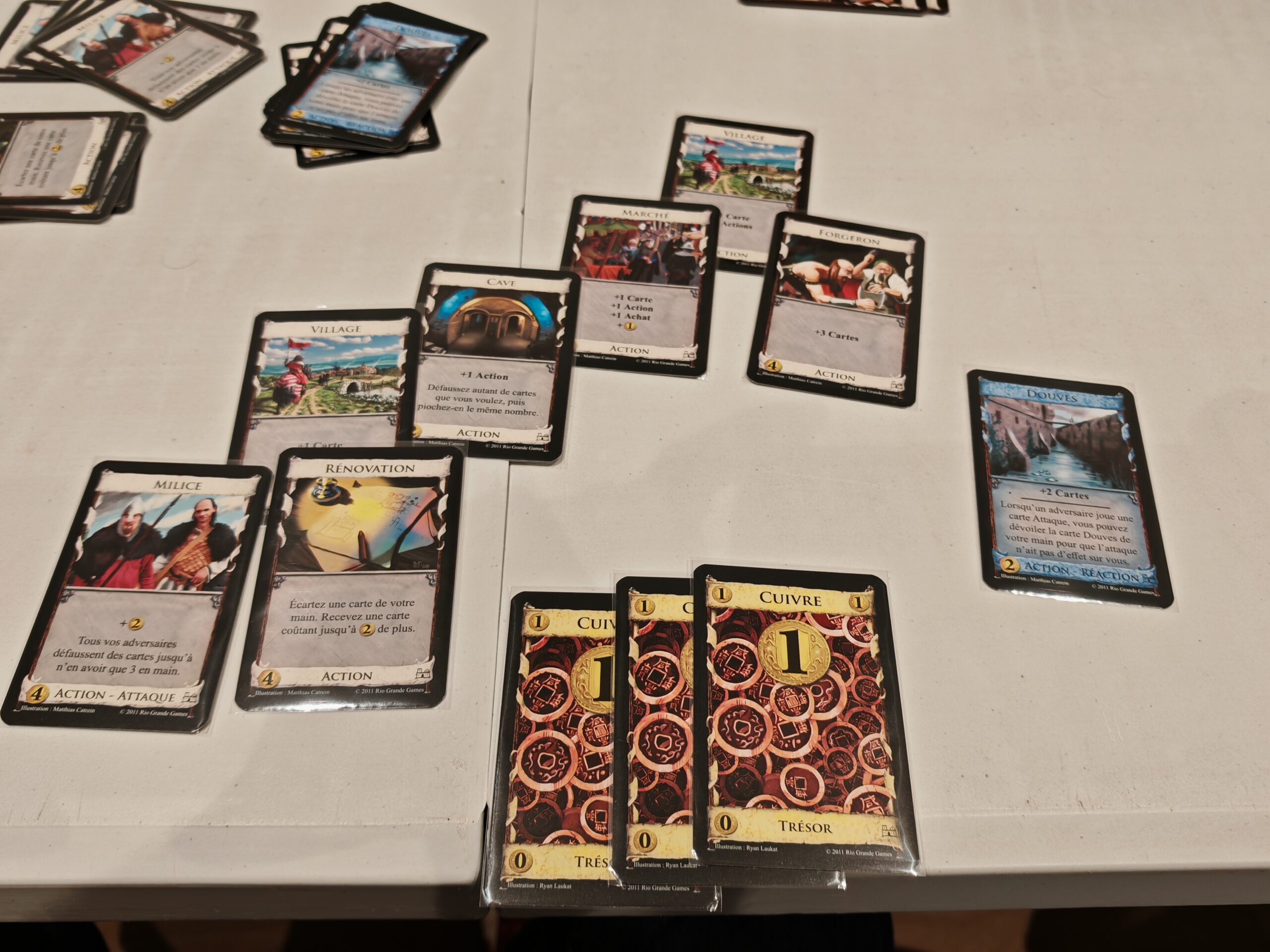 Ainsi, au fur et à mesure de la partie, votre capacité d’achat sera supérieure et les mains jouées de plus en plus grandes. Au début de la partie, vous disposez de 3 cartes de 1 point de victoire. Elles ne servent strictement à rien durant la partie et vous empêcheront de piocher les cartes utiles à votre développement. Mais sans ces cartes de point de victoire, vous ne parviendrez pas à l’emporter. En effet, une fois la fin de partie déclenchée, on va compter les points de victoire dans les decks de tous les joueurs. Deux possibilités de déclenchement : vider la pile de cartes province (dont chaque carte rapporte 8 points de victoire) ou vider 3 piles de cartes parmi les 17 de la partie.