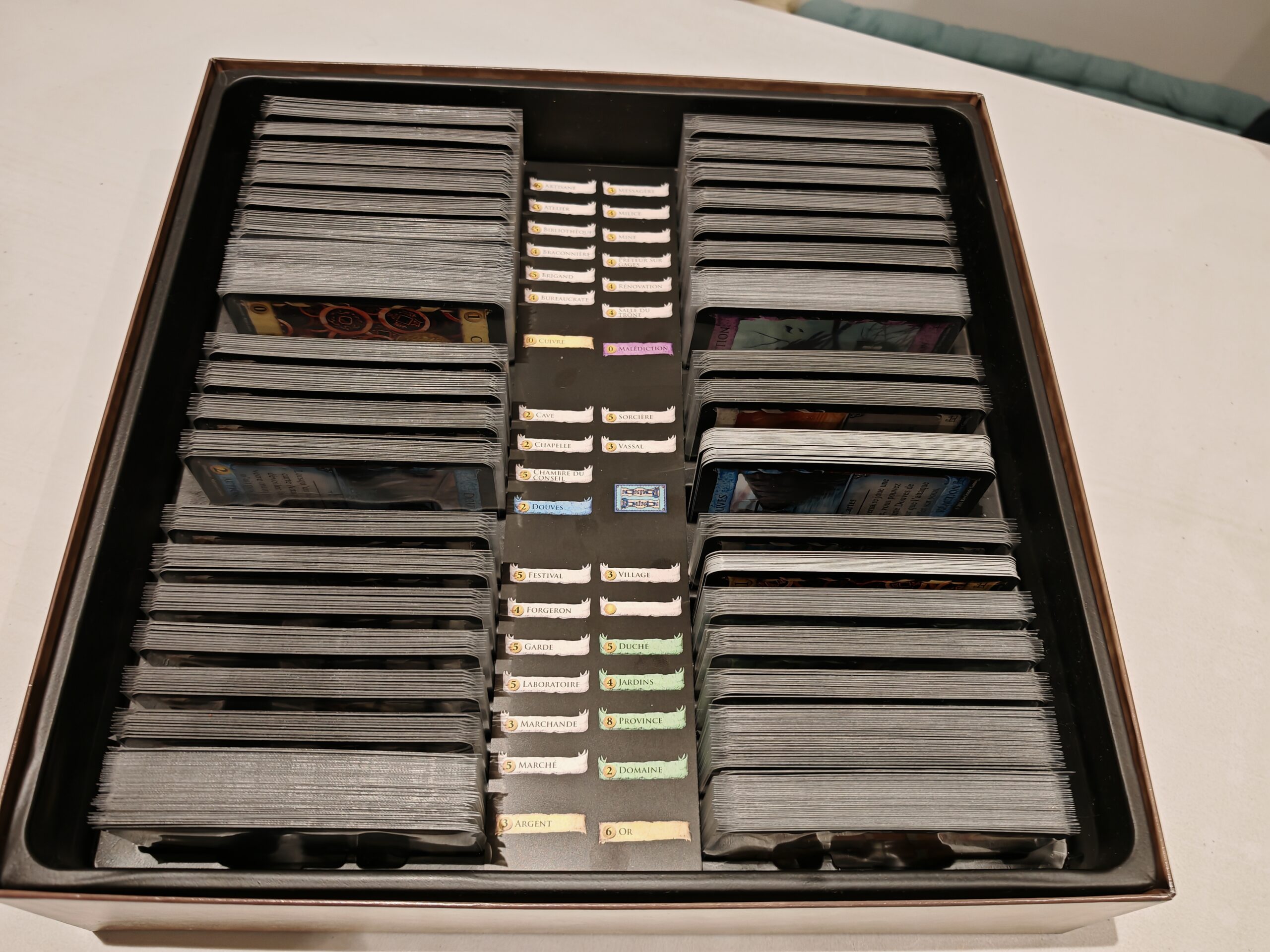 Dans la grande boîte de Dominion, on retrouve un insert et plusieurs centaines de cartes joliment illustrées. Attention, si vous sleevez (ce que je recommande fort de faire avec des sleeves Mayday), ça peut être très serré sur les cartes de trésor. Prenez donc le temps de tout bien ranger à la première ouverture.