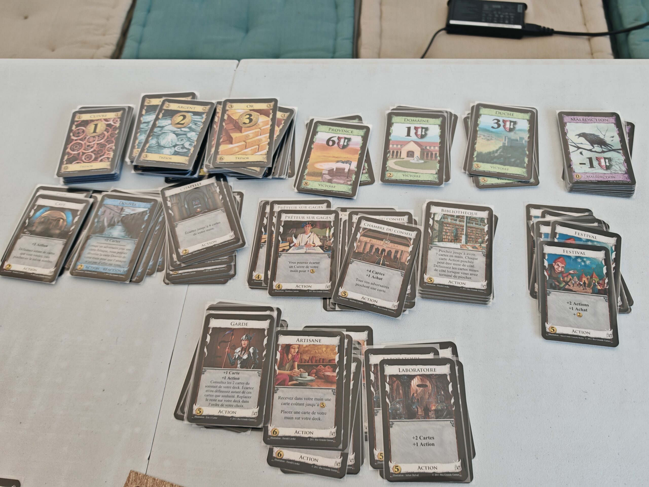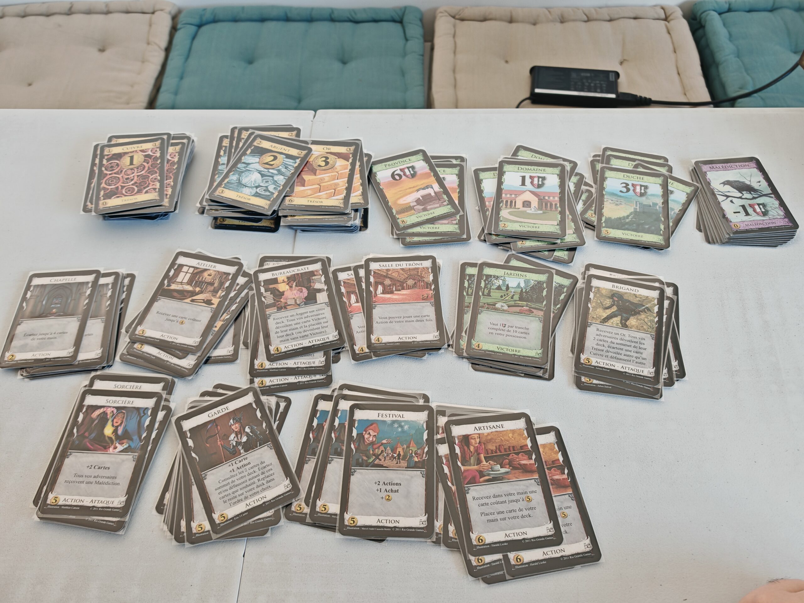 A la fin du livret de règles, on retrouve plusieurs configurations recommandées pour le choix des 10 cartes qui seront disponibles dans le marché (en plus des 7 piles qui ne changent jamais). N’hésitez pas à vous reporter à cela. A défaut, libre à vous de prendre 10 paquets au hasard. Attention, si parmi ceux-ci, vous prenez les jardins, pensez à ne laisser qu’un certain nombre de cartes selon le nombre de joueurs.