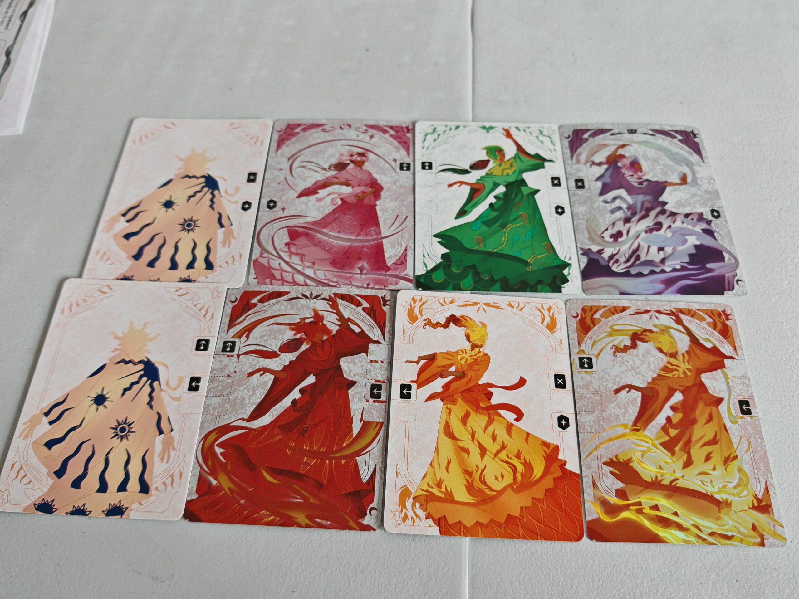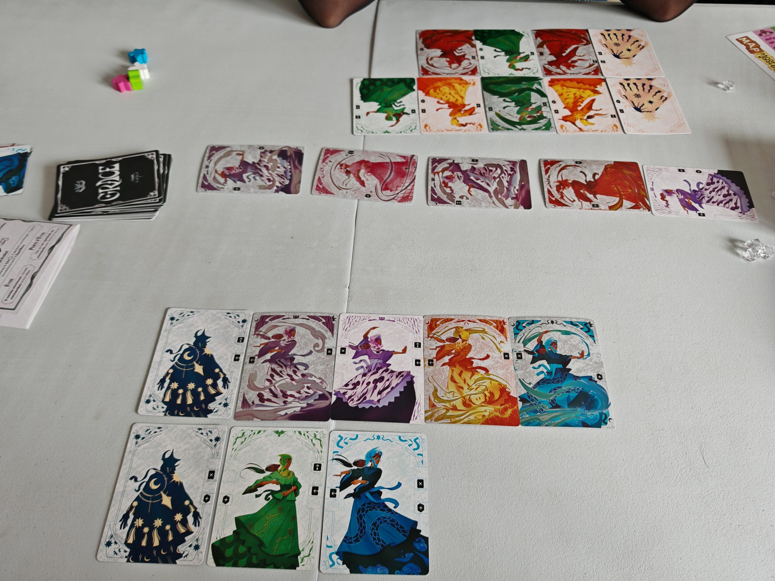 Grace est un petit jeu à deux très fluide avec des parties d’une dizaine/quinzaine de minutes environ. Les joueurs vont devoir réaliser les mouvements de danse les plus fluides possibles en installant cote à cote des cartes récupérées au centre de la table. Cependant, selon leur emplacement elles pourront vous coûter plus ou moins de chi (voire vous en faire gagner). Mais attention, si vous ne voulez ou ne pouvez pas créer de l’harmonie, vous perdrez de l’équilibre. Et sans surprise, si vous chutez en dansant, le spectacle est terminé.