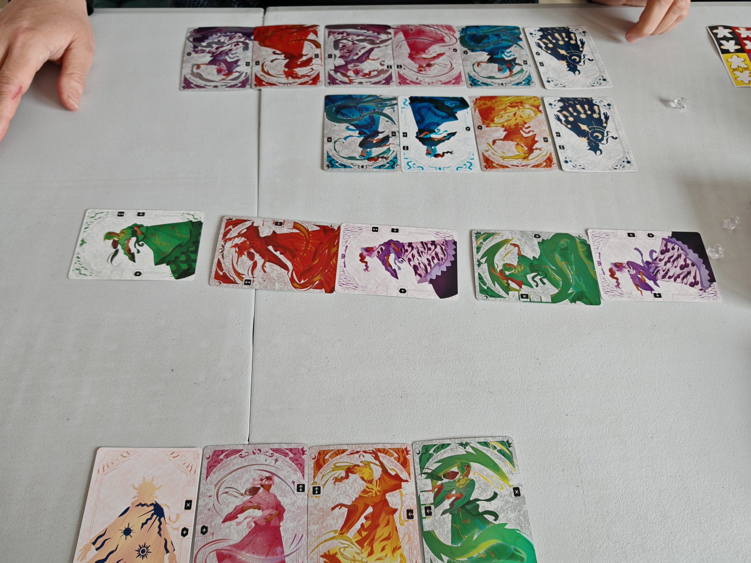 Point important, pour éviter des achats qui seraient nuisibles, vous pouvez récupérer toutes les cartes de l’une ou de vos deux lignes avant de sélectionner une carte centrale. C’est comme ça que vous gagnerez des points. Attention, cependant, il faudra quoi qu’il arrive défausser une carte ET ne garder qu’une carte par couleur. Ainsi, les joueurs tâcheront de faire cela dès qu’ils auront plusieurs cartes foils (qui valent 2 points au lieu d’1).