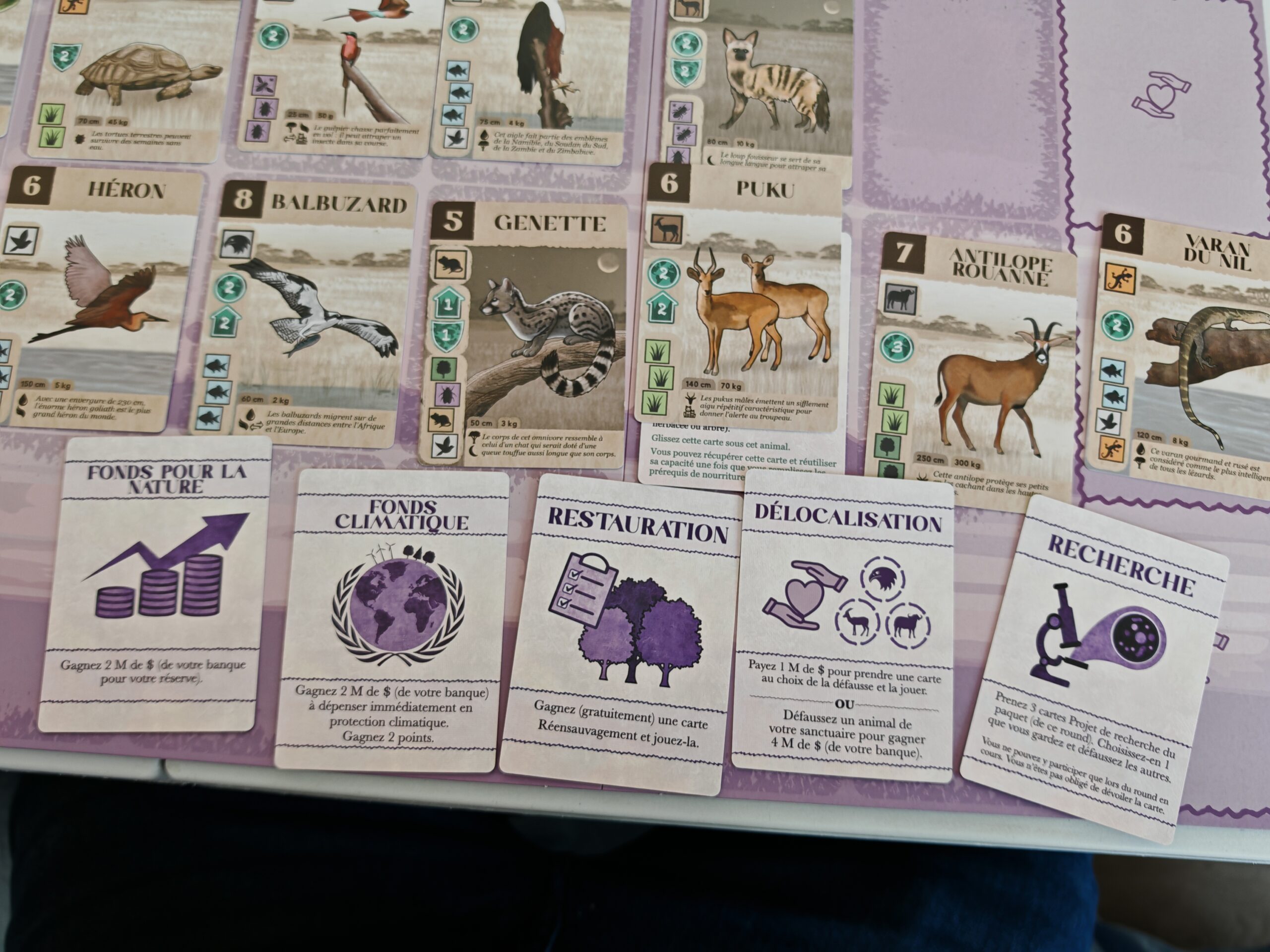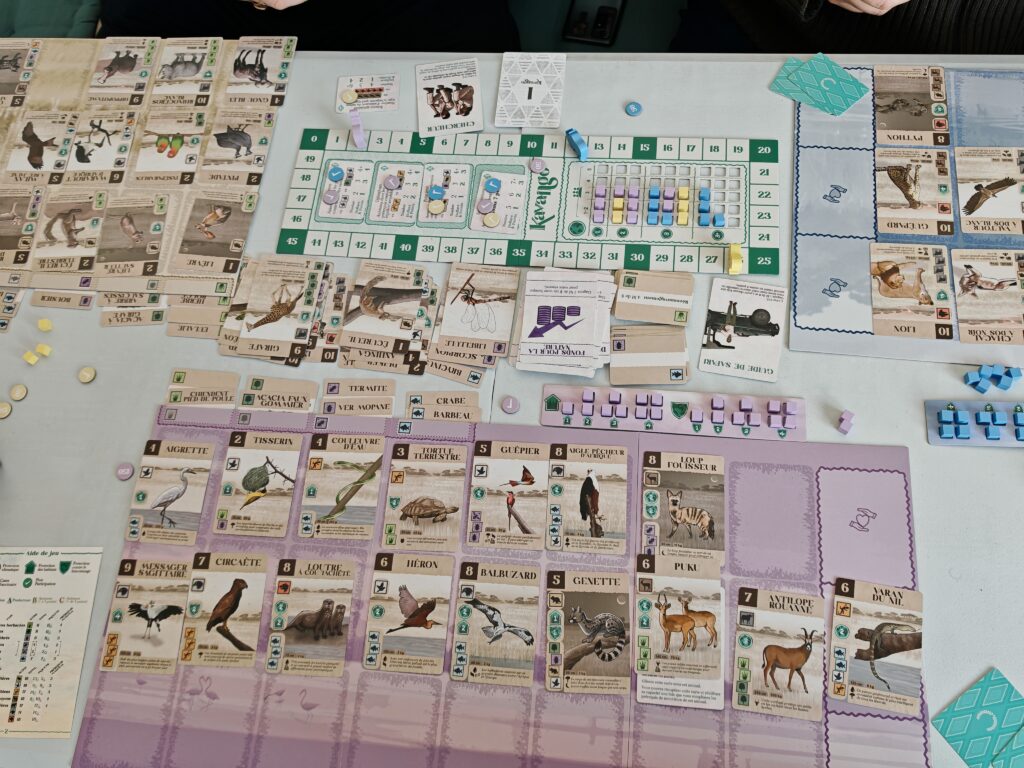 Kavango a été une chouette expérience ludique plutôt rapide à jouer et avec des règles très simples. Jeu de collection et de draft, vous allez tenter de sélectionner à chaque fois la bonne carte au bon moment en fonction des multiples contraintes (projets de recherche, objectifs, argent à disposition et producteurs/animaux déjà présents, niveaux de protection).