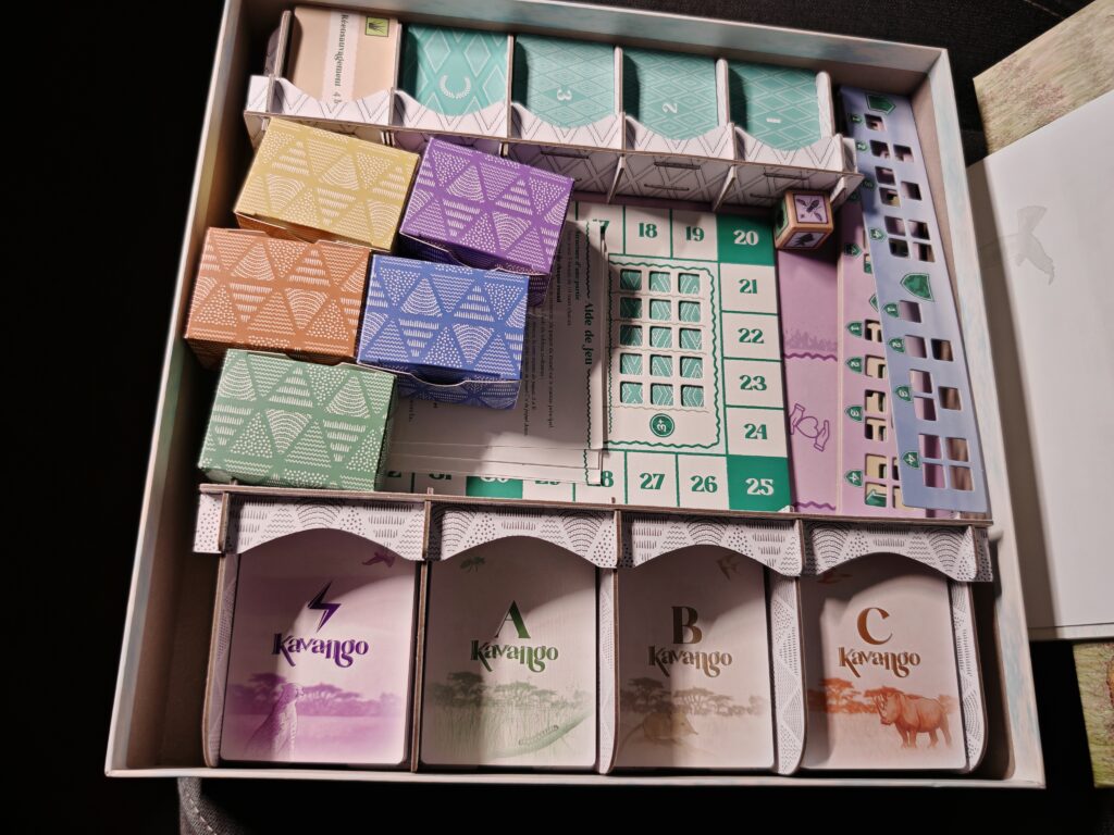 Kavango prend beaucoup de place sur la table à cause de ses plateaux individuels. Cependant la boîte reste d’une taille raisonnable. On retrouve de superbes racks pour une installation ultra rapide. De plus, ils bloquent parfaitement les cartes quand vous rangez la boîte à la verticale. Chaque joueur dispose aussi d’un petit coffre pour ranger son matériel.