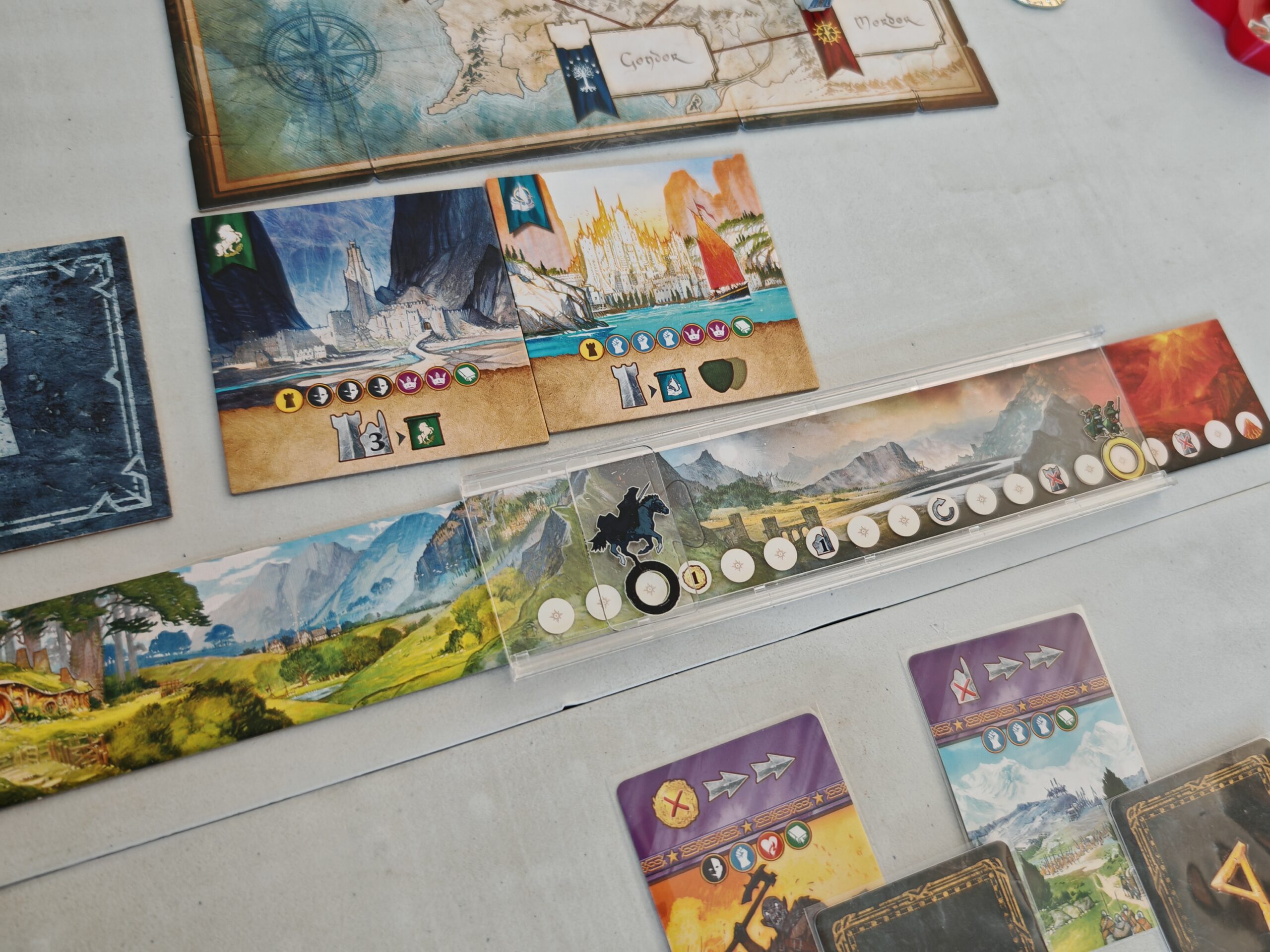 La boîte est livrée avec un insert qui permet d’accueillir des cartes sleevées et de ranger les diverses tuiles. Donc c’est déjà un très bon point. Chaque carte est magnifiquement illustrée. Pour chaque joueur on retrouve des unités militaires et tours aux couleurs de la communauté de l’anneau ou du Mordor. Dans l’ensemble c’est du très bon matériel avec des aides de jeu pour rappeler les effets des tuiles haut-lieu et jetons d’alliés.