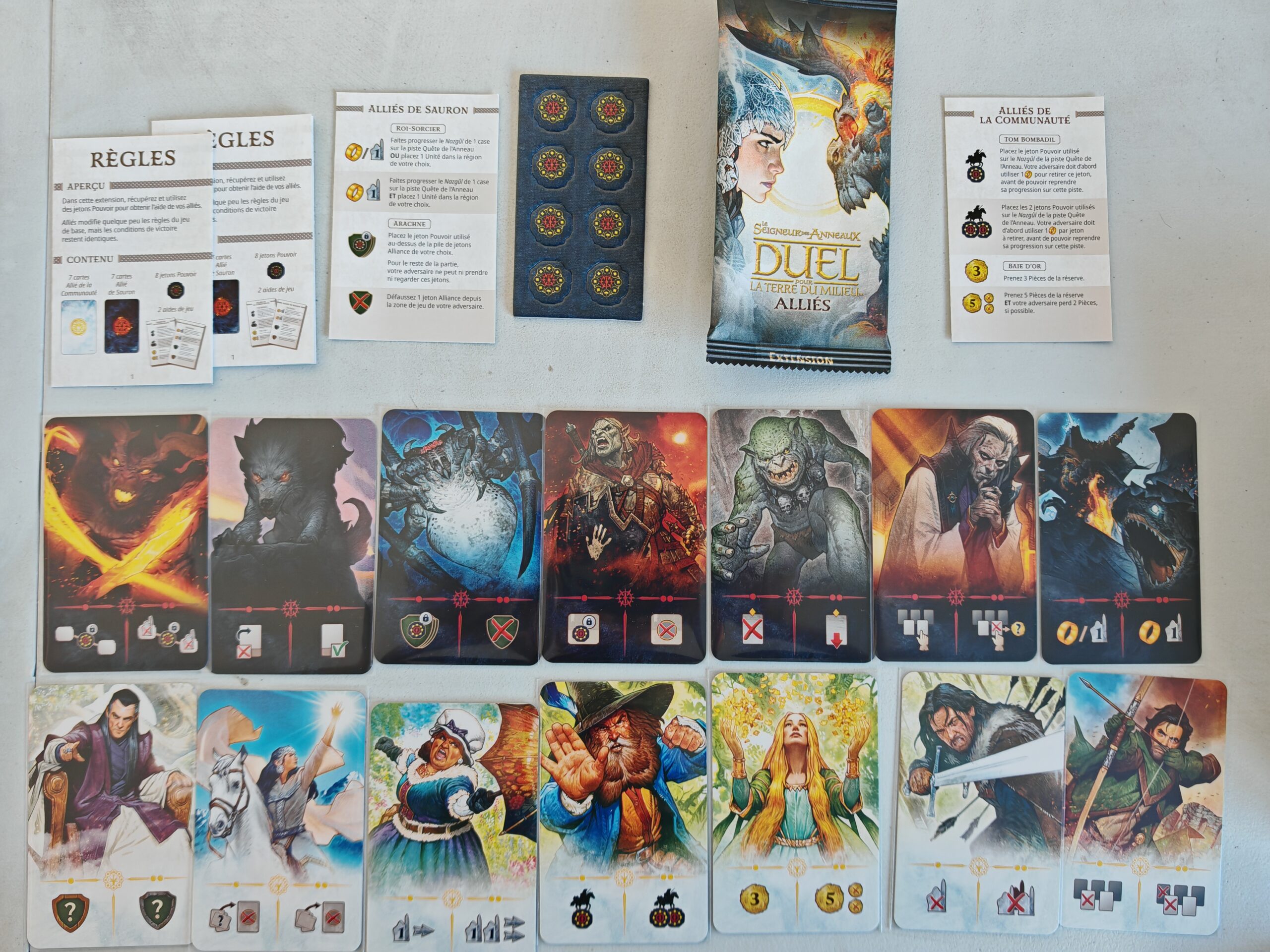 L’extension du Seigneur des Anneaux : Duel pour la Terre du Milieu propose un lot de 7 cartes alliés pour chaque joueur et 8 jetons pouvoir. En début de partie chaque joueur dipose de 3 cartes et 1 jeton. A chaque âge, 2 jetons sont posés sur les cartes centrales. Un joueur qui révèle une des cartes avec jeton acquiert ce dernier.