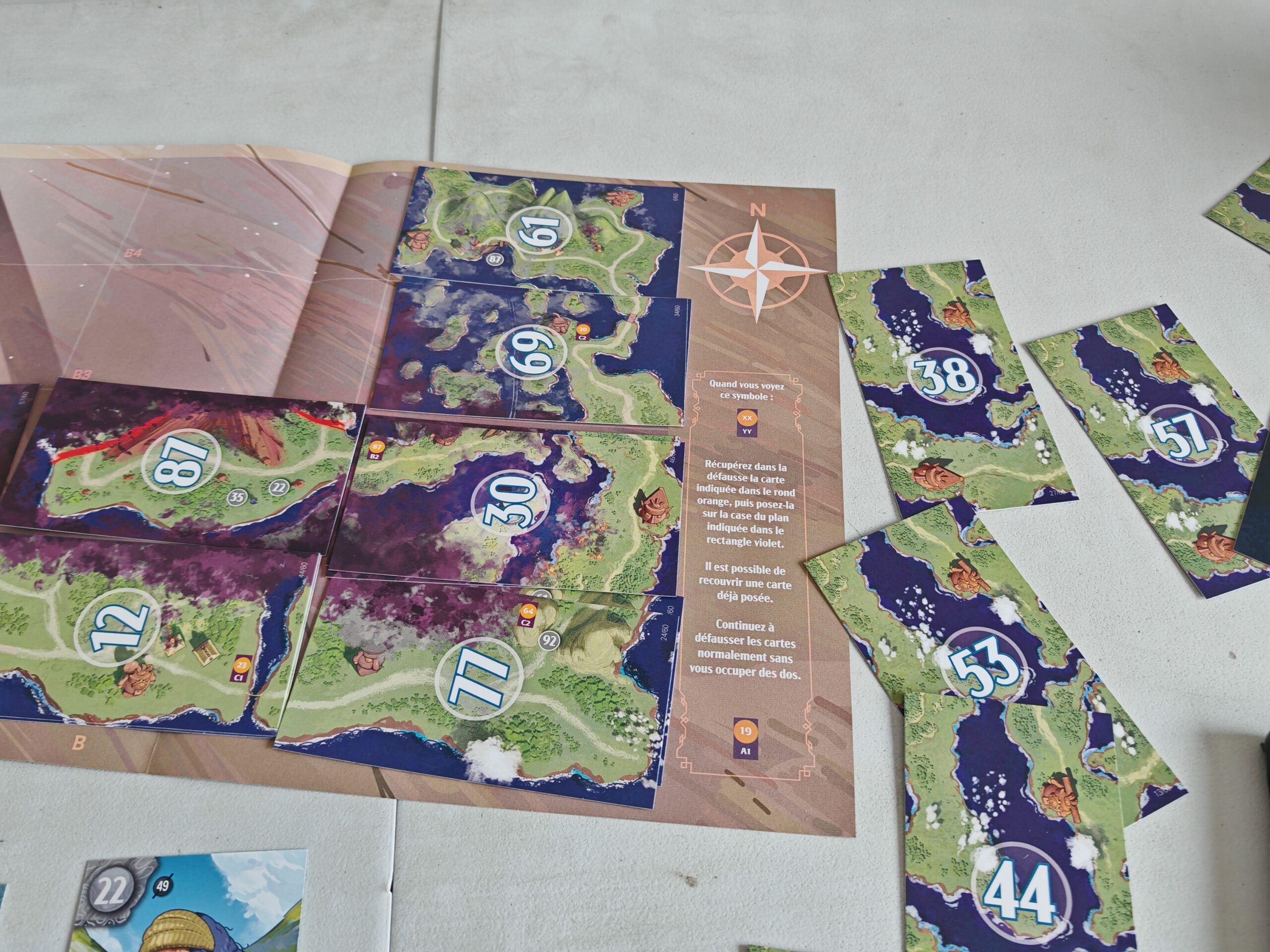 Dans ce scénario, on va se balader sur un archipel avec un volcan en éruption. Nous allons créer une map au fur et à mesure. Attention, les cartes présentent des chiffres en orange à l’arrière. Comme vous le voyez dans le visuel ci-dessous, il faudra attendre que les numéros soient dans la défausse pour les installer. C’est une fois ces cartes installées sur la map que vous pourrez récupérer les cartes dans les ronds gris comme à votre habitude. Exemple ici avec la carte en bas à droite indiquant la carte 92.