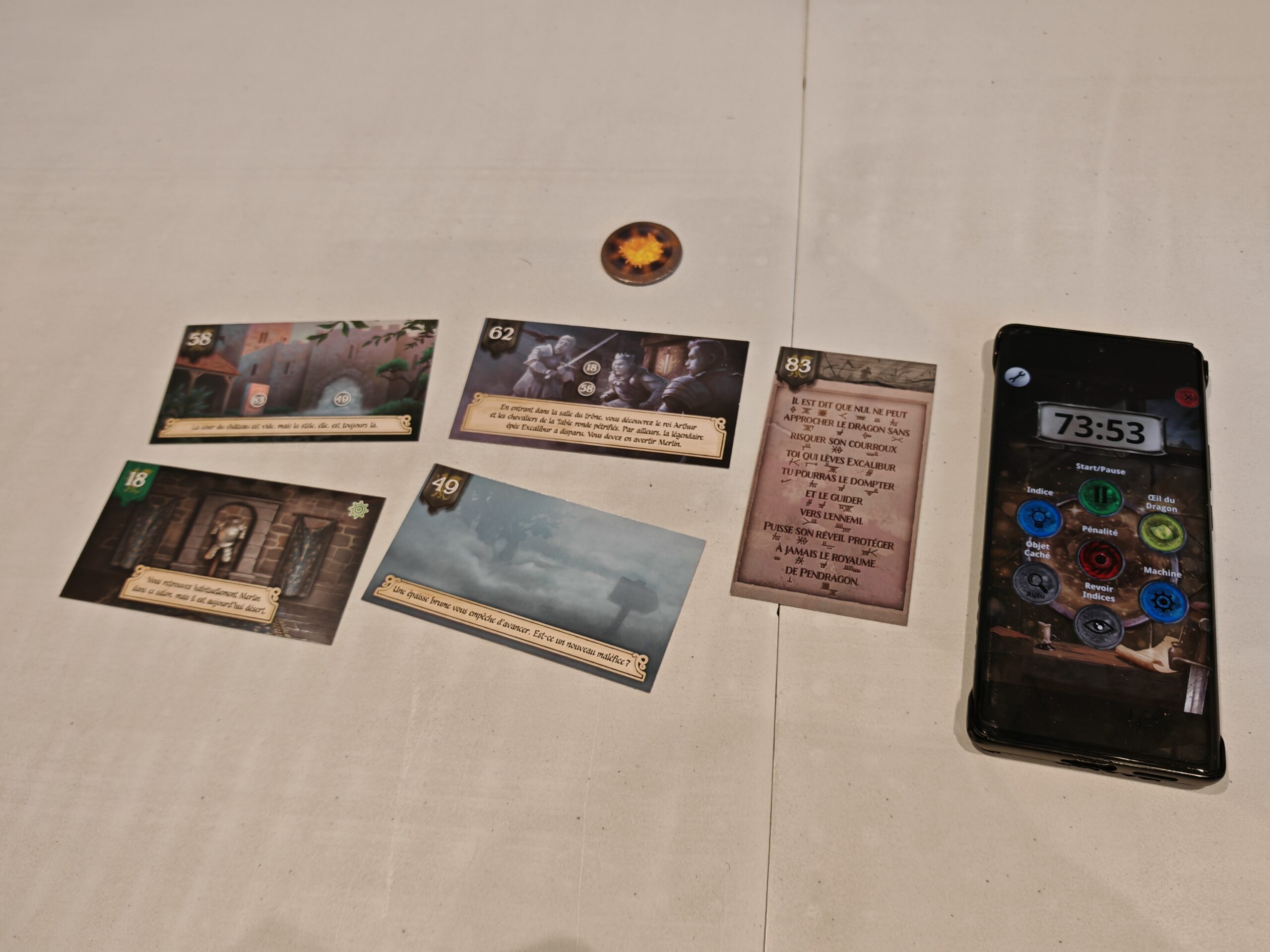 C’est un scénario très complexe dans l’univers de la légende arthurienne. L’application mobile va être très sollicitée et rapidement vous aurez de très nombreuses cartes sur le board qui ne seront pas défaussées avant la fin ou presque. Vous allez pouvoir déclencher des sorts et c’est là que le problème s’est présenté pour moi. En effet, on peut un peu “brute force” la résolution en cliquant sur tous les sorts et l’application pense qu’on résout une carte précise mais ce n’est pas toujours le cas du tout. A ce titre, j’inviterais la marque à faire une mise à jour pour nous demander quelle carte nous essayons de résoudre avant de lancer notre sort. Cela nous permettrait de nous assurer que nous sommes bien sur le bon chemin et trouvons toutes les cartes dans le bon ordre.