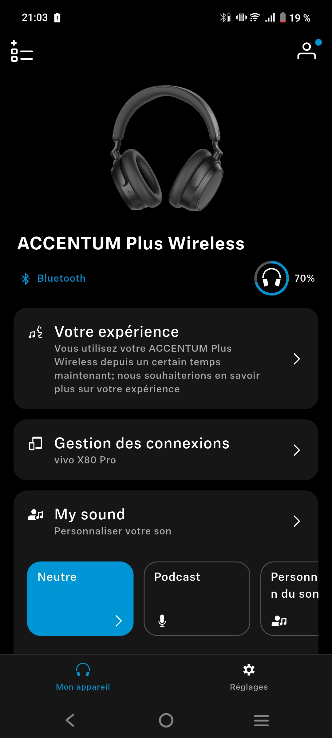 Grâce à l’application Smart Control Plus, vous pouvez contrôler divers paramètres comme le montrent les captures d’écran ci-dessous. Ainsi vous pouvez gérer l’intensité de la réduction de bruit active (ANC) ou du mode transparence. Vous pouvez aussi activer le mode anti-vent et gérer les divers contrôles sur la zone tactile du casque (écouteur droit). Enfin vous pouvez aussi personnaliser le son en fonction du style musical (pop, dance, rock, hip hop…). Pour ma part, je trouve que le mode neutre est vraiment très bon et ai préféré rester sur celui-ci. En ayant testé le boost des basses, j’ai constaté que le son de tout le reste était vraiment fortement abaissé donc j’ai préféré ne pas cocher cette option.