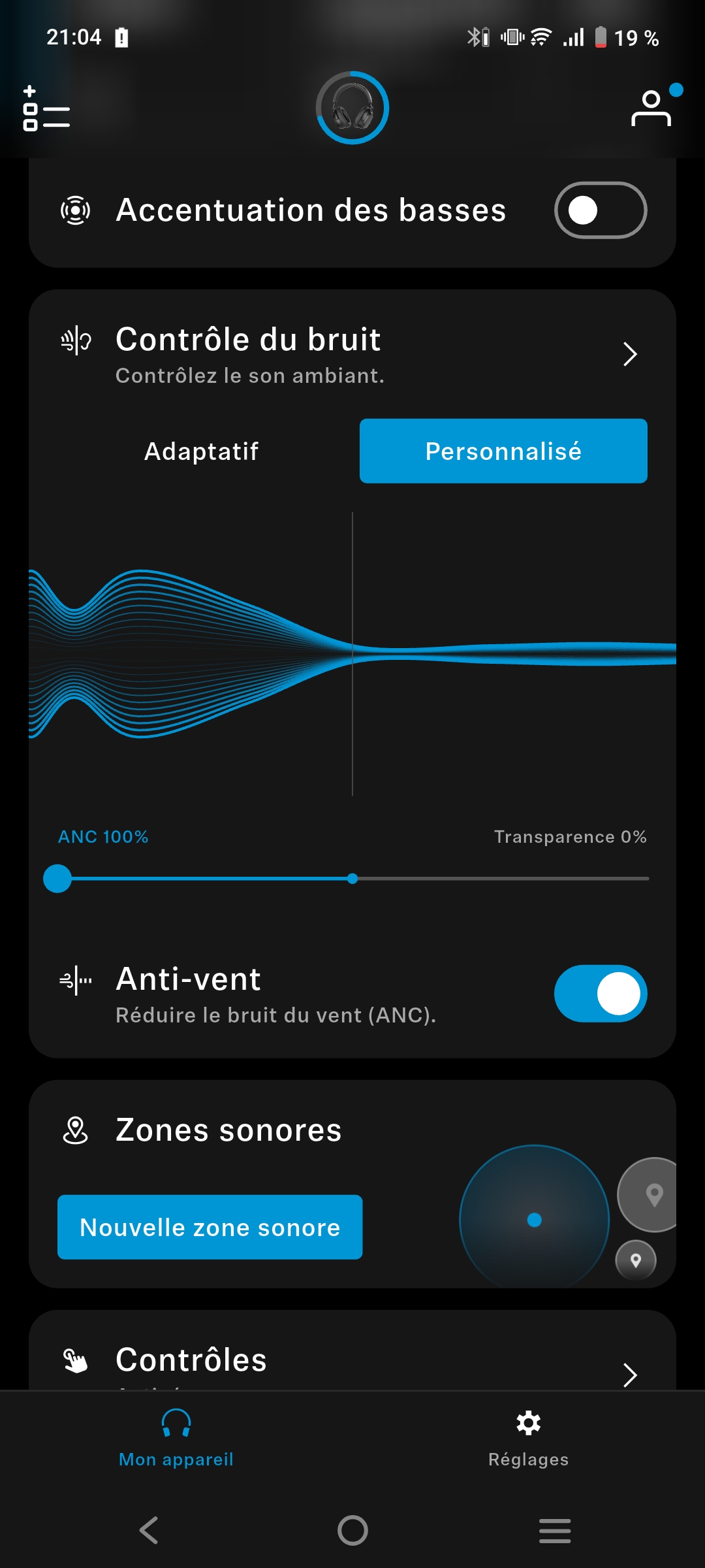 L’application permet aussi de créer des zones sonores. Concrètement, cela veut dire que vous pouvez faire en sorte qu’en étant chez vous il n’y ait pas de réduction de bruit active mais qu’en quittant l’adresse vous basculiez sur un mode avec l’ANC ou de la transparence.