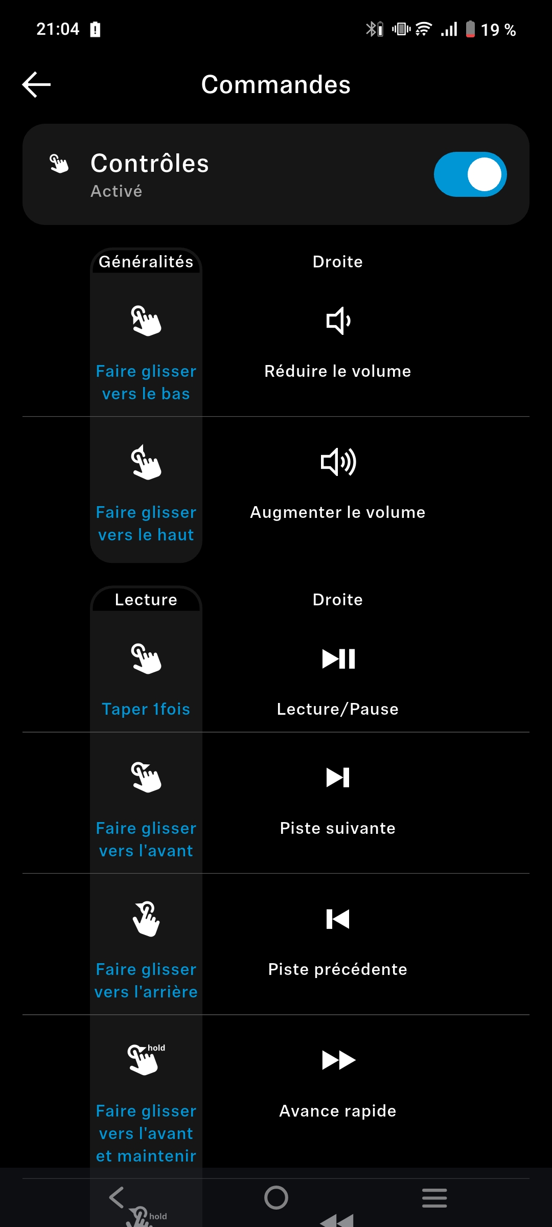L’application est également en mesure de couper l’usage des commandes tactiles. Ayant eu quelques pauses parasites alors que je n’ai pas touché l’appareil sur mes oreilles, cela peut sans doute être un bon moyen de lutter contre cela si je sais que l’ensemble de la playlist que j’ai prévue ne va pas changer toutes les deux minutes. D’après quelques recherches sur le net, je ne semble pas être le seul à avoir fait face à cela après avoir tourné la tête peut-être un peu trop vite.