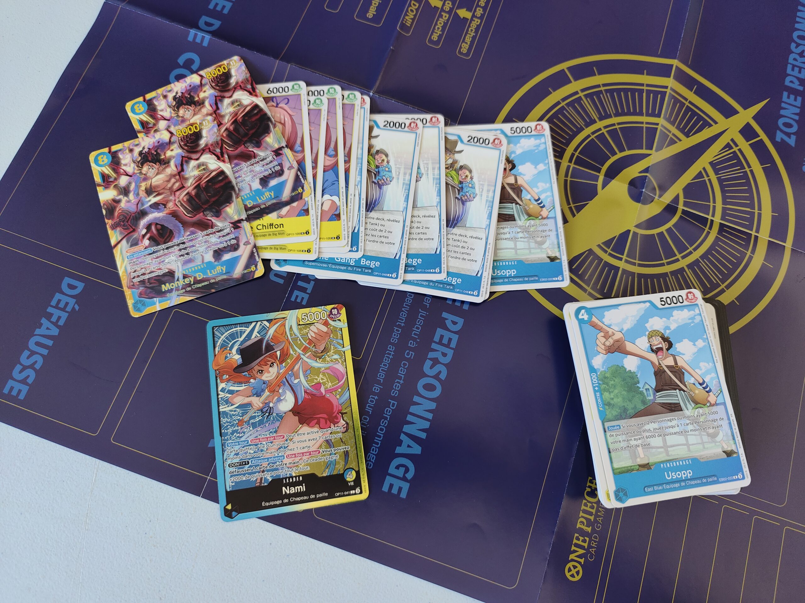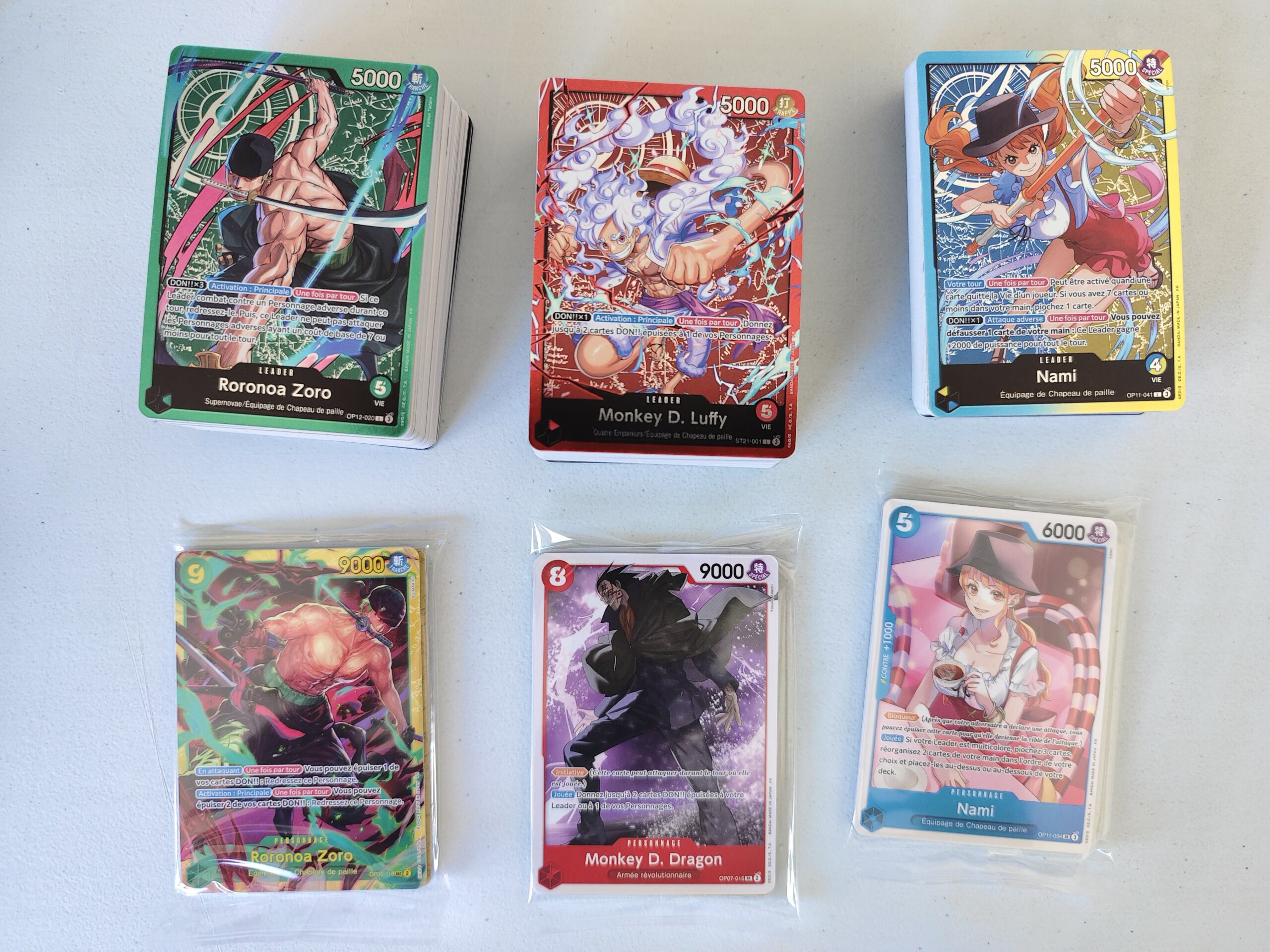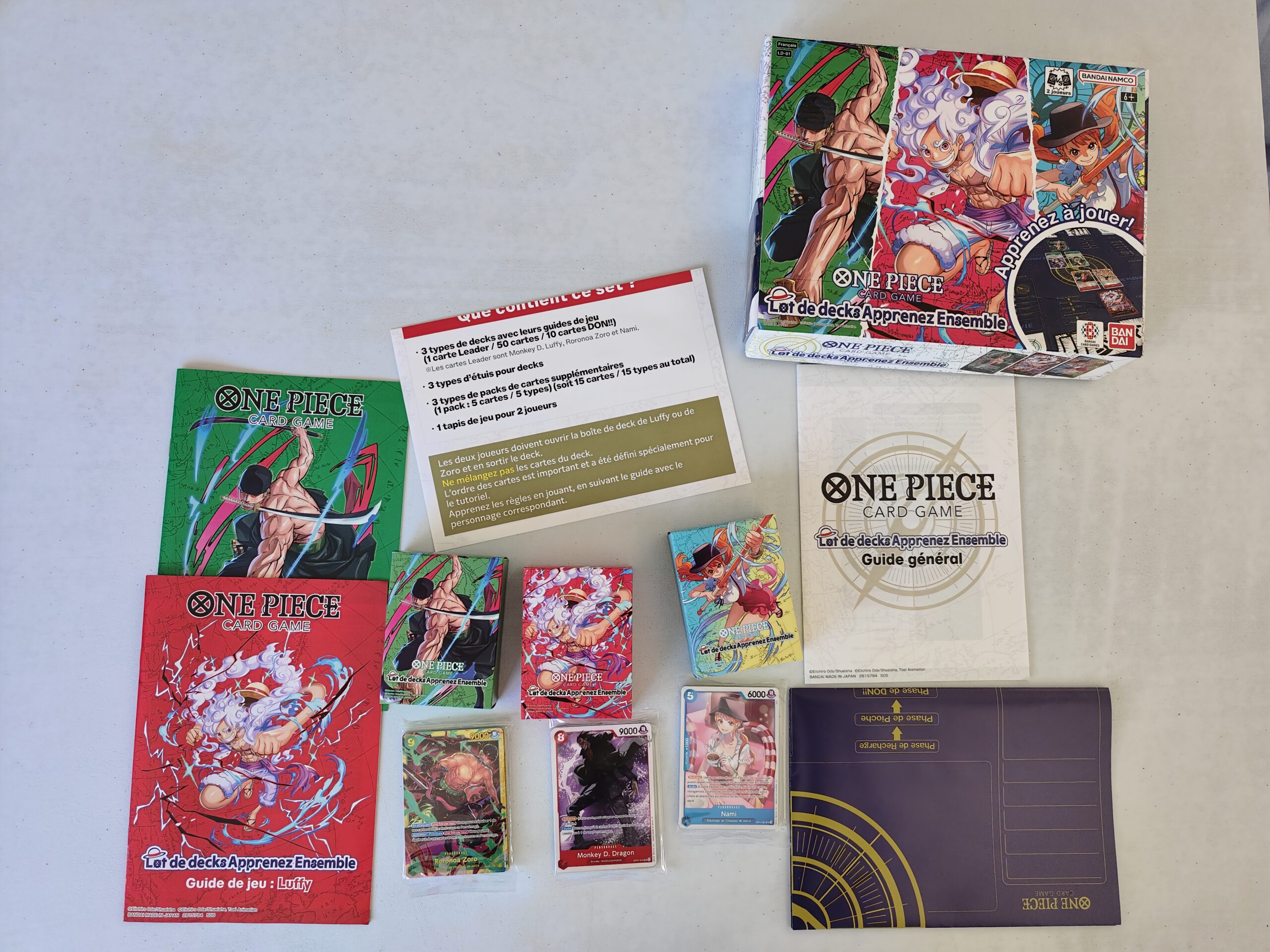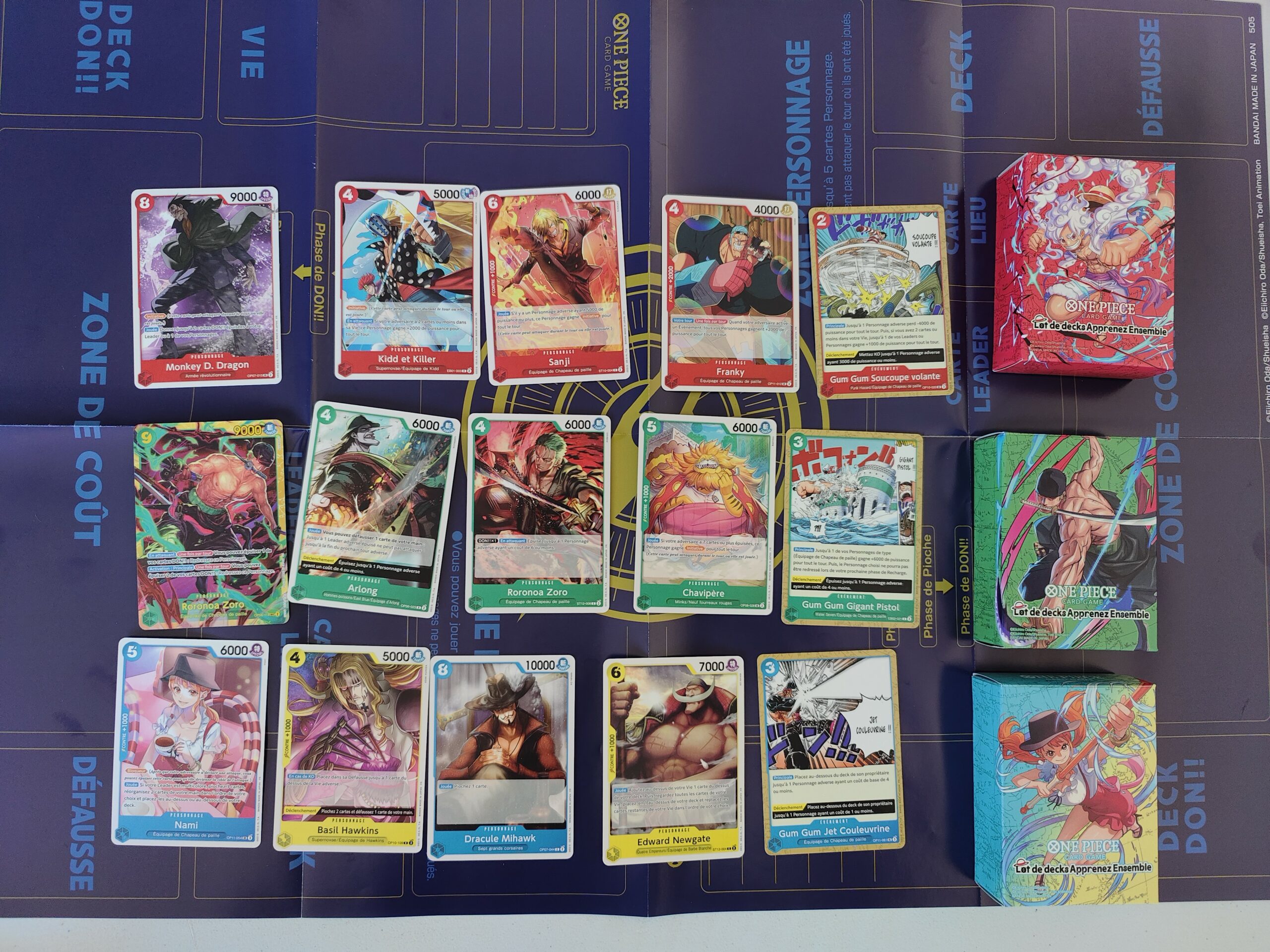 Dans le coffret d’apprentissage, on retrouve 3 decks : Luffy et Zoro à ne surtout pas mélanger avant la première utilisation et Nami pour jouer après avoir fait le tutoriel. De plus, on retrouve 5 cartes supplémentaires pour chaque deck pour remplacer le contenu comme vous le souhaitez.