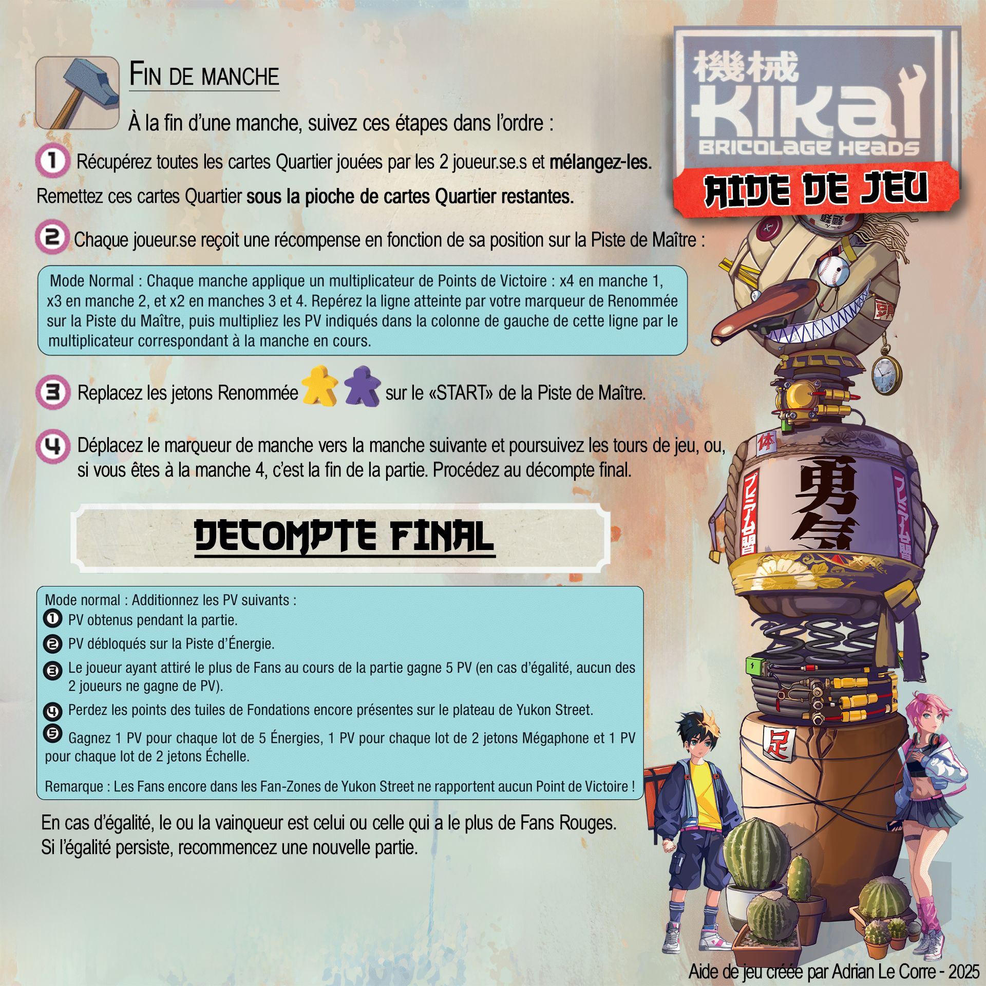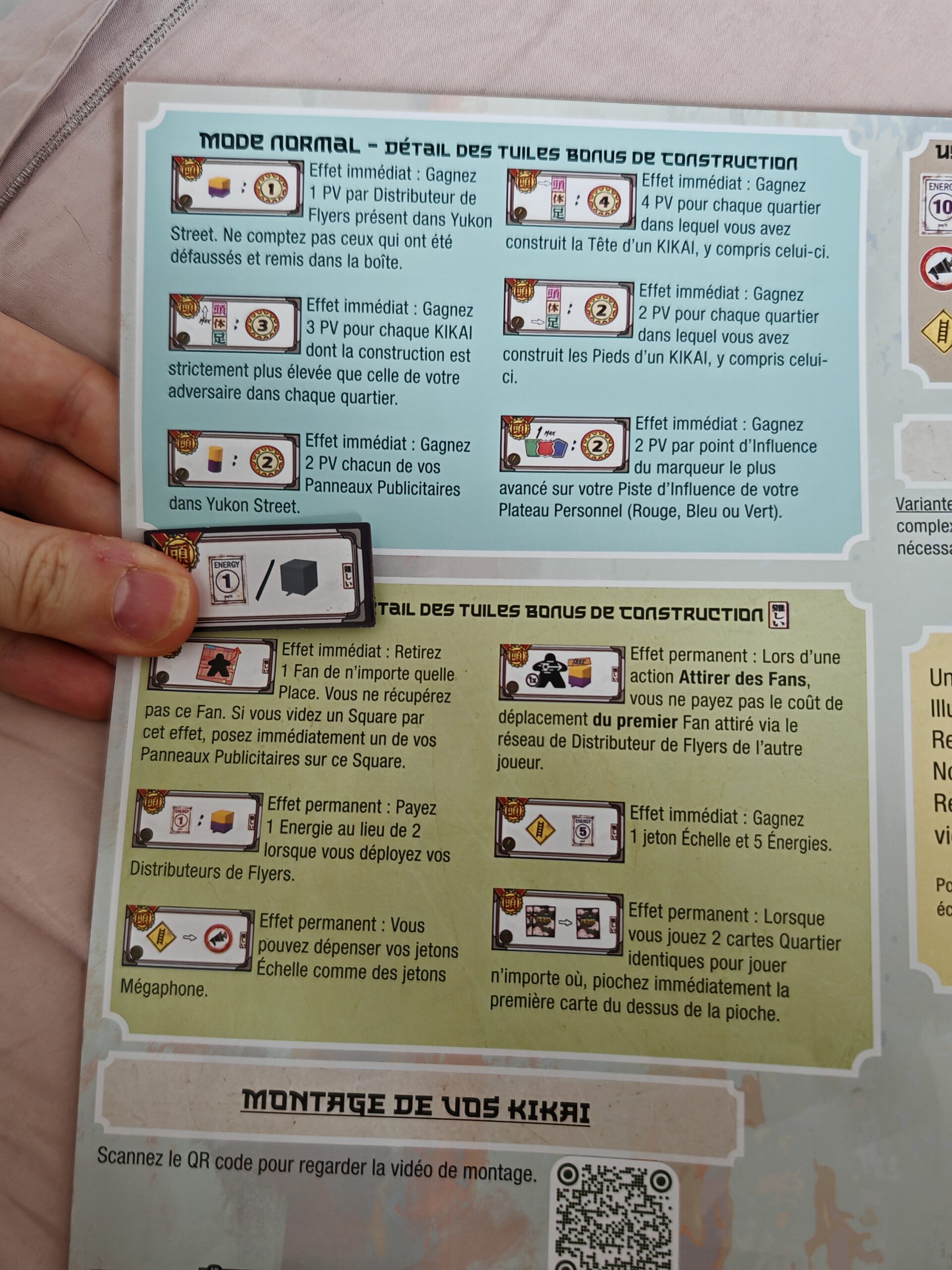 Avec le mode avancé, vous commencez avec les ressources indiquées sur les deux tuiles fondation sélectionnées. Attention à bien regarder les Kikaï qui ont une face avancée. Pour rappel, les seuls points de victoire remportés avec ce mode sont ceux de vos fans (1 pour 1) et vos niveaux d’influence sur les niveaux rouge, bleu et vert (1 pour 1 aussi). Cela change ainsi la façon de jouer votre partie. Attention, la piste de score présente des énergies à dépenser à la fin de la manche jusqu’à un certain seuil. Donc pensez à tout dépenser avant !