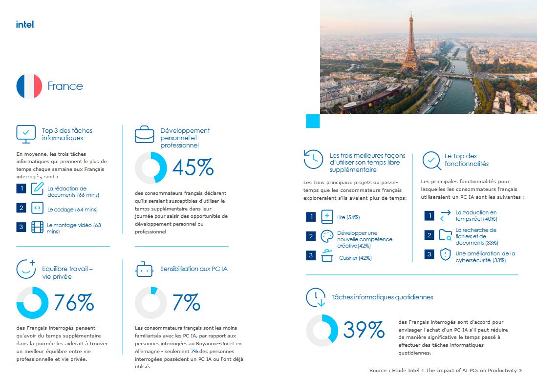 La marque spécialiste des processeurs informatiques a réalisé une étude que je vous partage ci-dessous autour de l’impact des PC équipés d’IA sur la productivité des citoyens français. D’après l’étude, on apprend également que les utilisateurs passent 15h par semaine sur des tâches numériques comme la trascription de réunion ou la rédaction d’emails. Les PC IA seraient en mesure de réduire ce temps en faisant gagner 240 minutes.