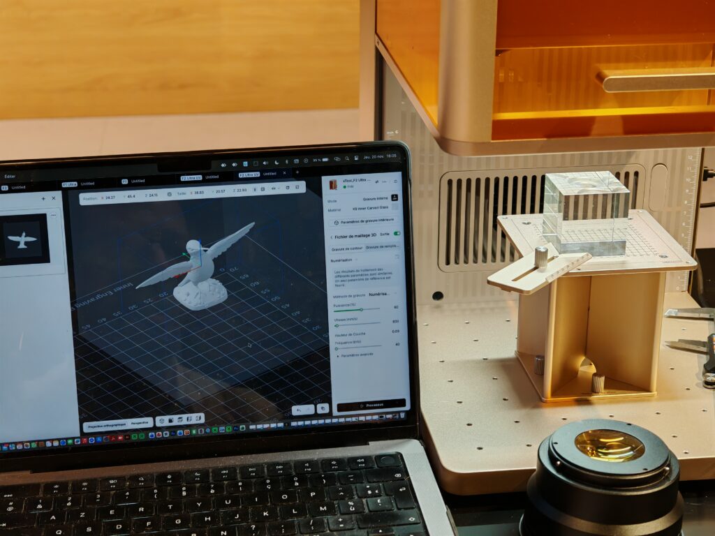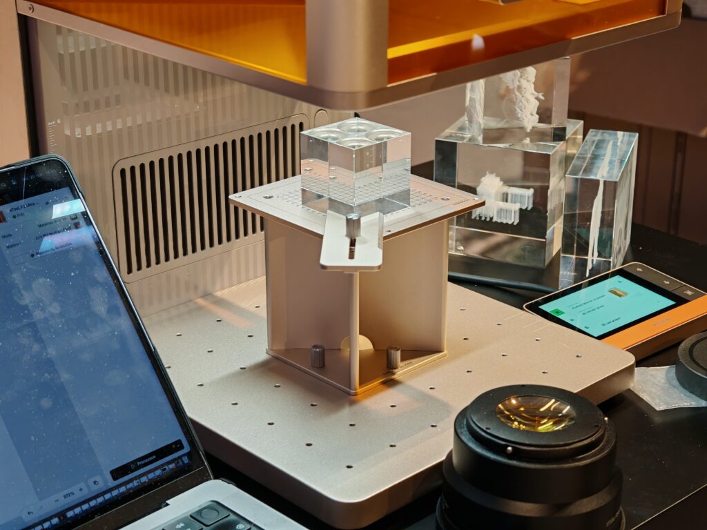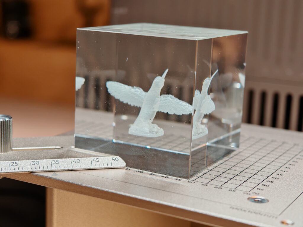 Durant la conférence, une démonstration a été réalisée et était assez bluffante puisqu’on a pu voir en direct la gravure sous-surface d’un cube de verre d’un petit oiseau. Il ne s’est passé que quelques dizaines de secondes avant que le produit ne soit prêt.