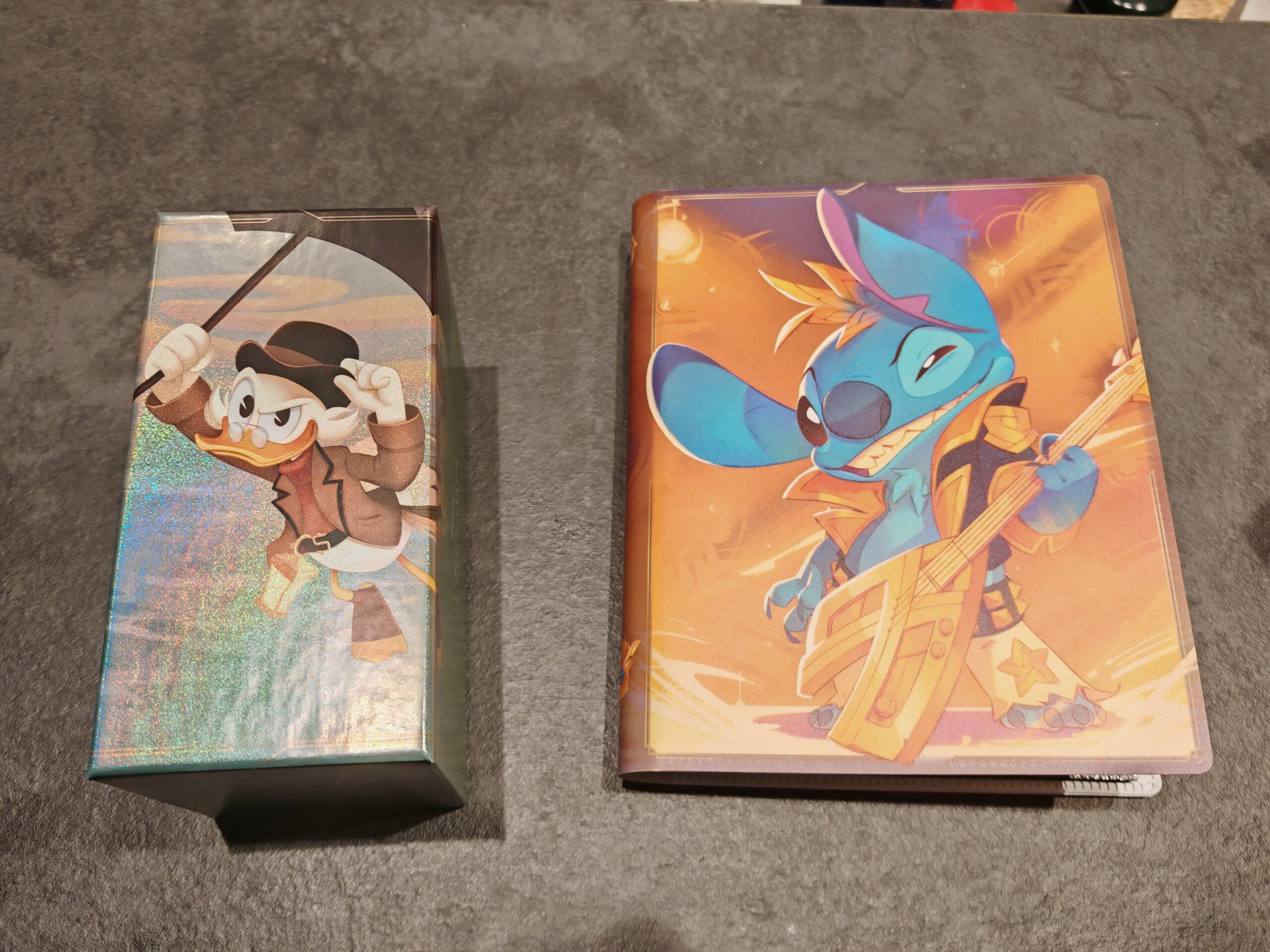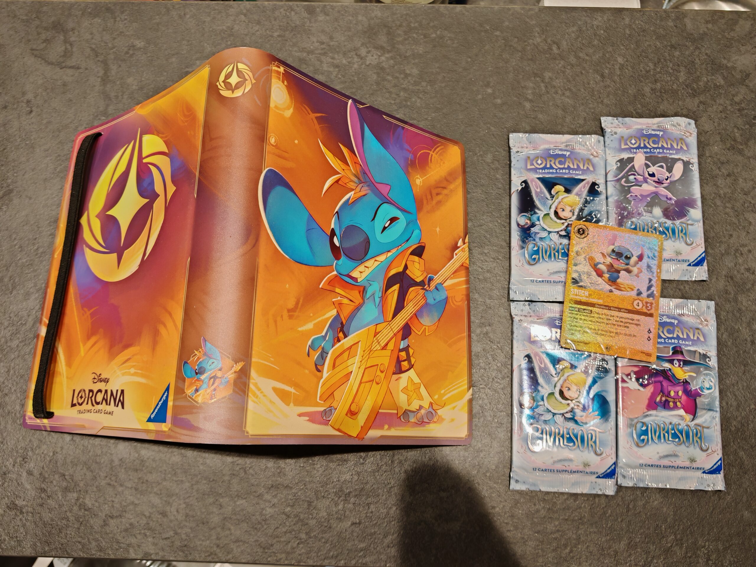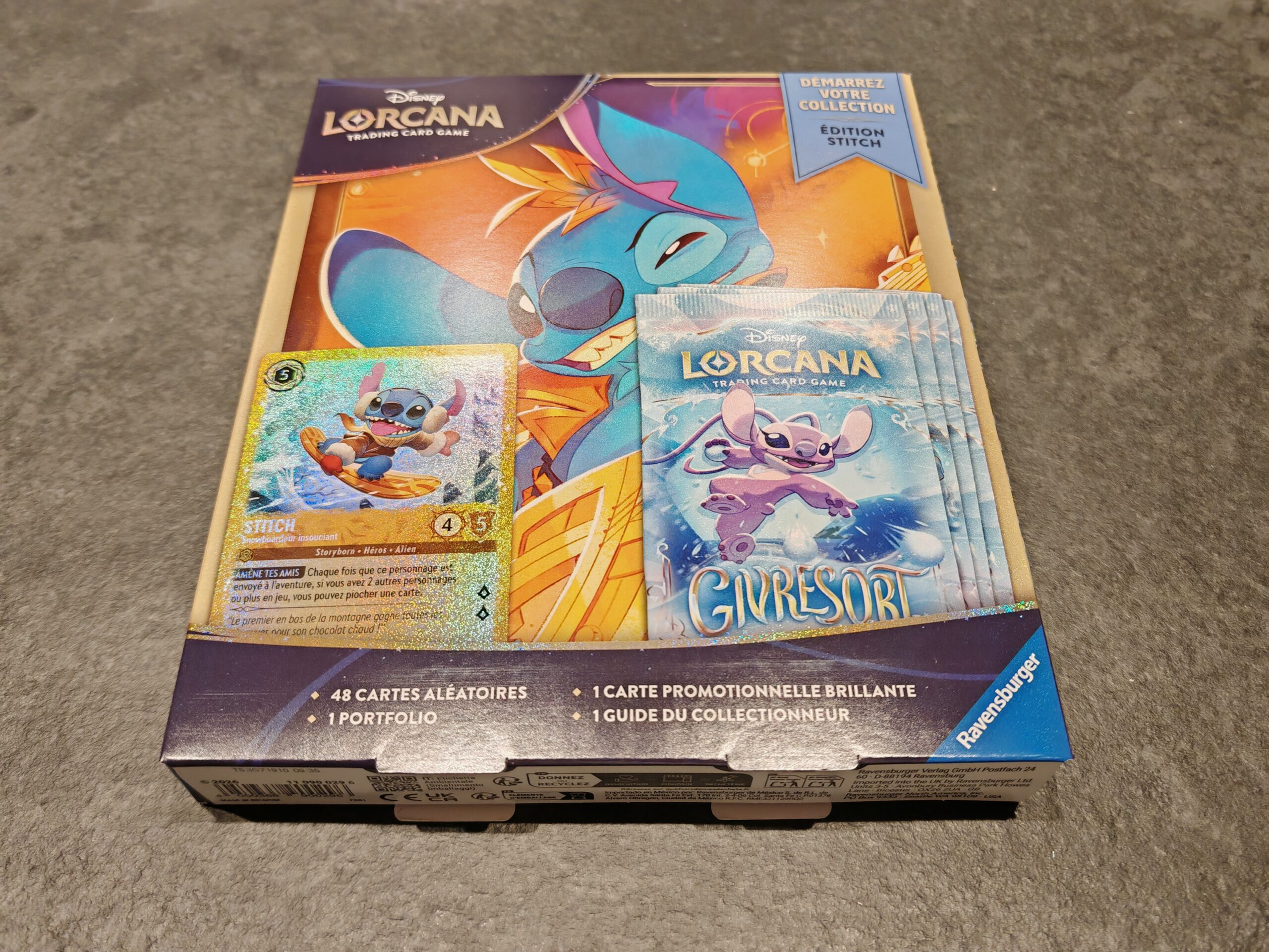 Dans ce coffret, on retrouve 4 boosters du set actuel, Givresort. On retrouve aussi une carte promotionnelle de Stitch et un classeur aux couleurs du petit monstre bleu. Tout comme le classeur Mickey présenté précédemment, il permet l’accueil de 80 cartes sur des pages de 4 cases.