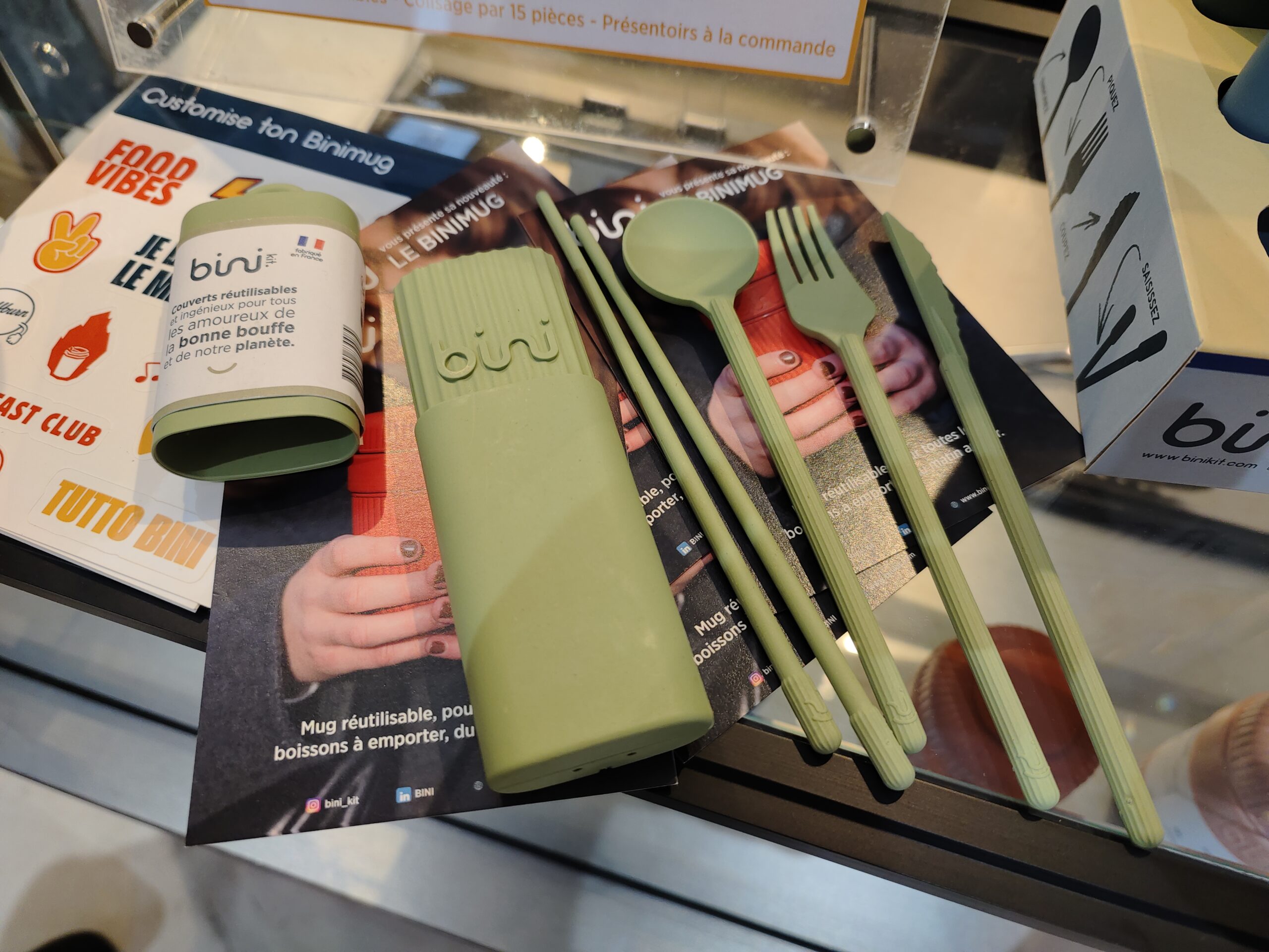 - 7.90€ pour le lot de couvert et son étui de transport (fourchette, couteaux, cuillère, 2 baguettes) appelé Binikit
