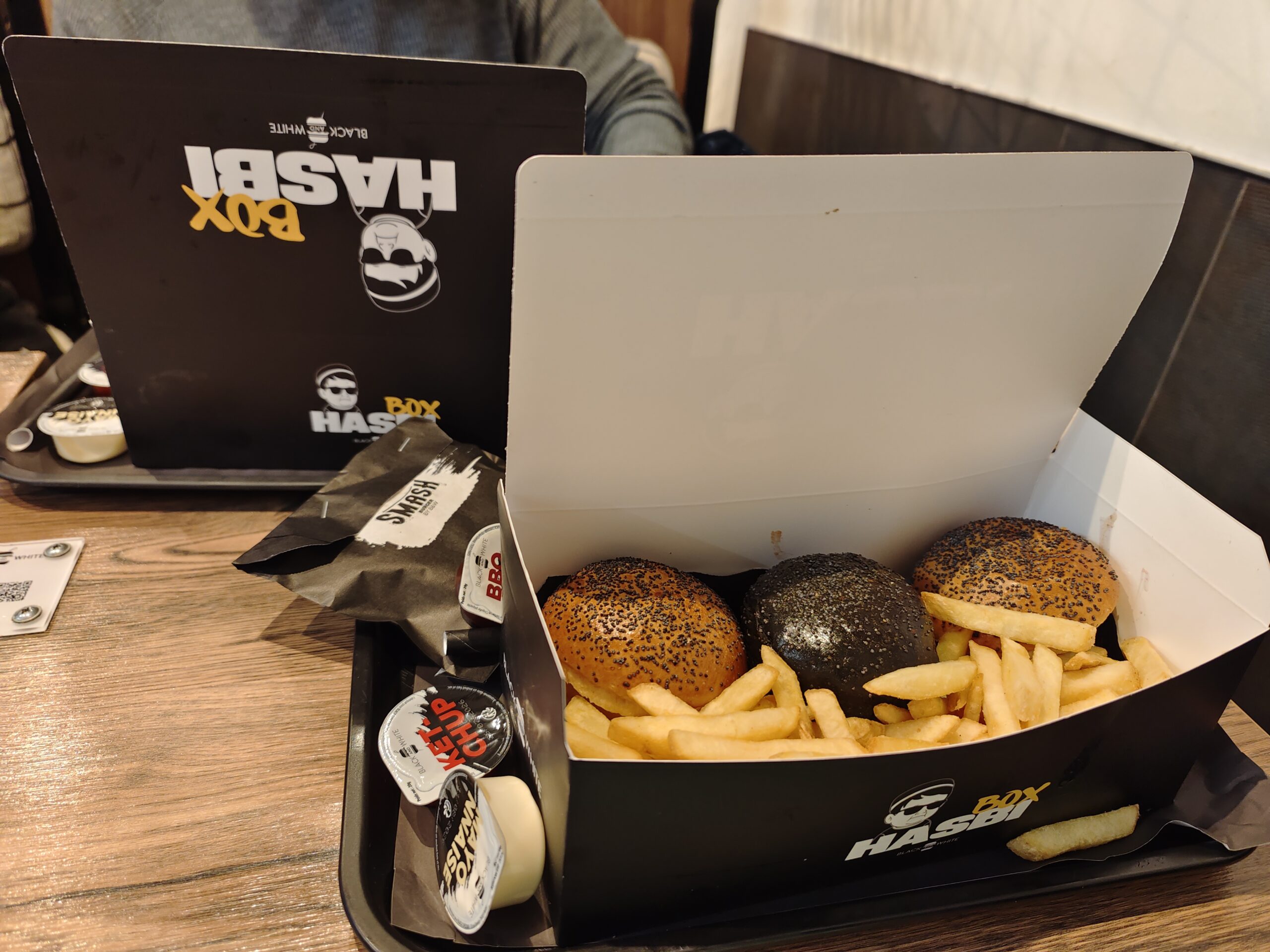 La Hasbi Box présente 3 mini burgers, des versions réduites de certaines créations signatures (West Coast, Original et Crispy) de la maison avec une proposition au poulet frit et deux au boeuf (un classique et un sauce cheddar). L’offre permet de tester un panel de produits pour potentiellement revenir pour une version de taille normale ultérieurement. Comme le nom de l’établissement l’indique, chaque burger présente du pain noir et blanc.