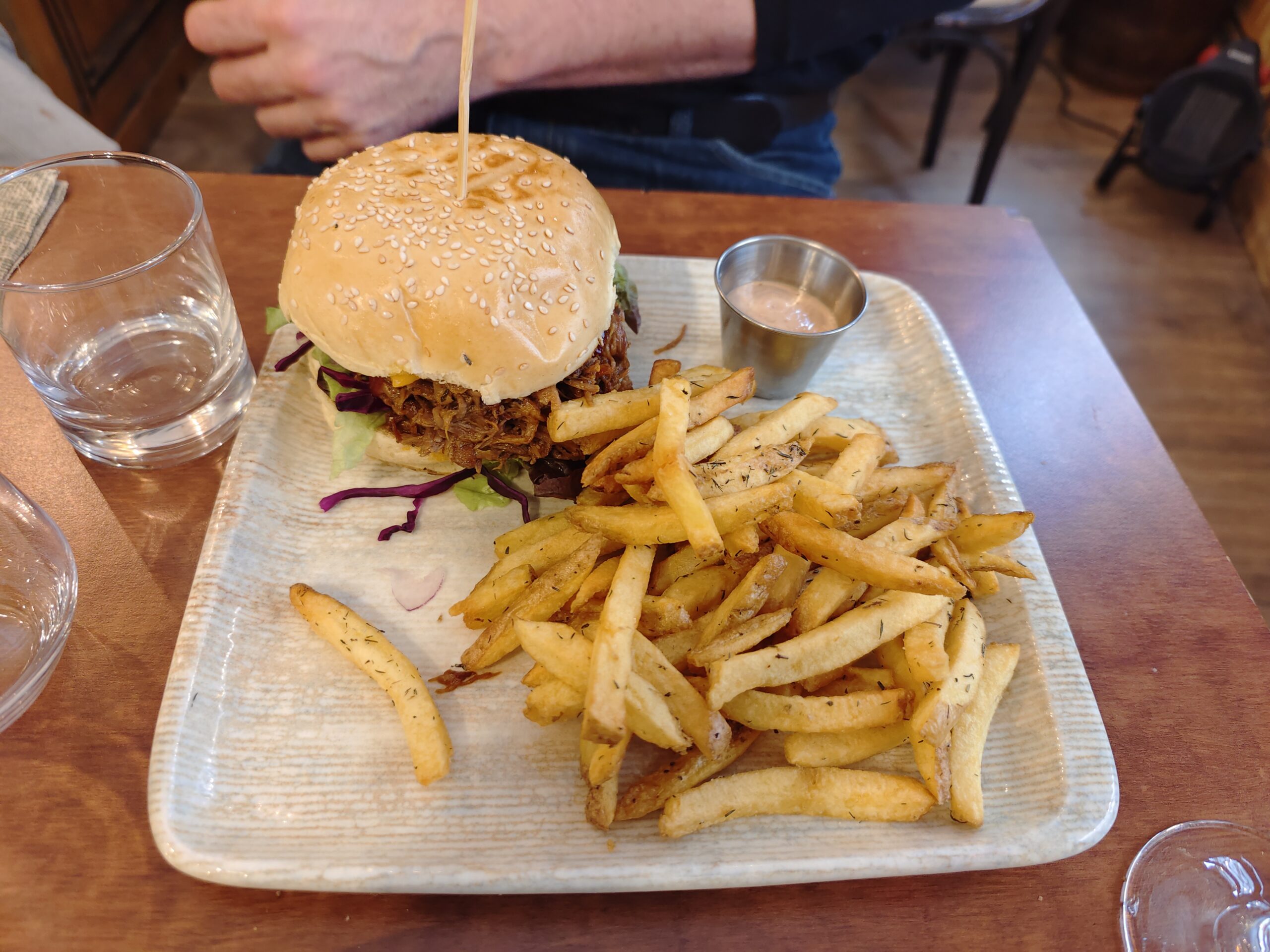 Mon ami s’est lui dirigé vers l’une des spécialités du lieu : les burgers avec pour cette fois la version pulled pork (19.10€) et ses frites maison. Je me répète une énième foi mais la portion fournie dans l’assiette est généreuse. Oubliez les offres de fast food, ici on a une offre de bien meilleure qualité et quantité.